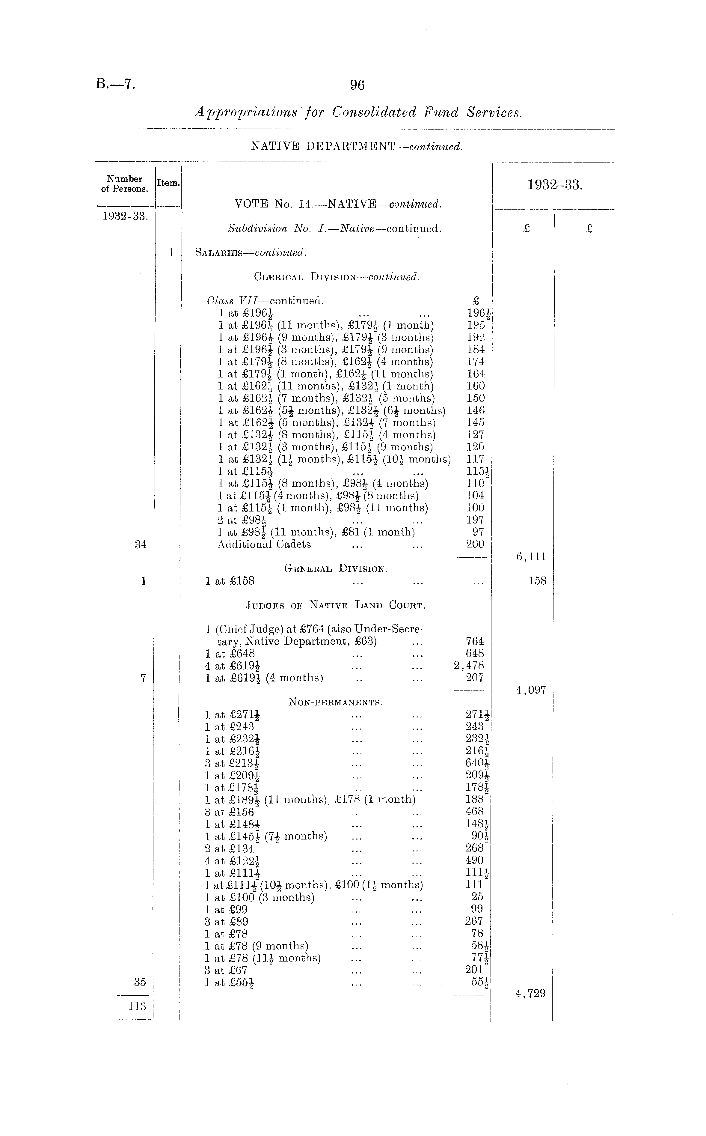 ofpeton, Item - 1932-33. VOTE No. 14.—NATIVE—continued. 1932-33. Subdivision No. I. —Native —continued. £ £ 1 Salaries—continued. Clerical Division —continued. Glass VII —continued. £ 1 at £196\ ... ... 196| 1 at £1961 (11 months), £179J (1 month) 195 1 at (9 months), £179§ (3 months) 192 1 at £196| (3 months), £179|- (9 months) 184 1 at £179|- (8 months), £162J (4 months) 174 1 at £179J (1 month), (11 months) 164 1 at (11 months), £132-| (1 month) 160 1 at £162-J (7 months), £132-|- (5 months) 150 1 ac £162-| (5J months), £132-| (6| months) 146 1 at £162|- (5 months), £132f (7 months) 145 1 at £132\ (8 months), £115-J (4 months) 127 1 at £132-J (3 months), (9 months) 120 1 at £132-J- (11- months), £115-J- (10|- months) 117 1 at £115| " ... " ... 115-1 1 at £115| (8 months), (4 months) 110 1 at £115£ (4 months), £98| (8 months) 104 1 at £115-| (1 month), £98| (11 months) 100 2 at £98-| ... ... 197 1 at £98J (11 months), £81 (1 month) 97 34 Additional Cadets ... ... 200 6,111 Genekal Division. 1 1 at £158 ... ... ... 158 Judges of Native Land Coukt. 1 (Chief Judge) at £764 (also Under-Secre-tary, Native Department, £63) ... 764 1 at £648 ... ... 648 4 at £619J ... ... 2,478 7 1 at £619J (4 months) .. ... 207 4,097 Non-peemanents. 1 at £271| ... ... 271-| 1 at £243 ... ... 243 1 at £232-| ... ... 2321 1 at £2161 ... ... 216^ 3 at £213-| ... ... 640| 1 at £2091 ... ... 2091 1 at £178§ ... ... 178J 1 at £ 189J (11 months), £178 (1 month) 188 3 at £156" ... ... 468 1 at £1481 ... ... 1481 1 at £145i (7f months) ... ... 901 2 at £134" ... ... 268" 4 at £122| ... ... 490 1 at £1111 ... ... llli 1 at£lll-J- (lOf months), £100 (1J months) 111 1 at £100 (3 months) ... ... 25 1 at £99 ... ... 99 3 at £89 ... ... 267 1 at £78 ... ... 78 1 at £78 (9 months) ... ... 58-J 1 at £78 (11J months) ... 77-J 3 at £67 " ... ... 201 35 1 at £551 ... ... 55i " * 4,729 113