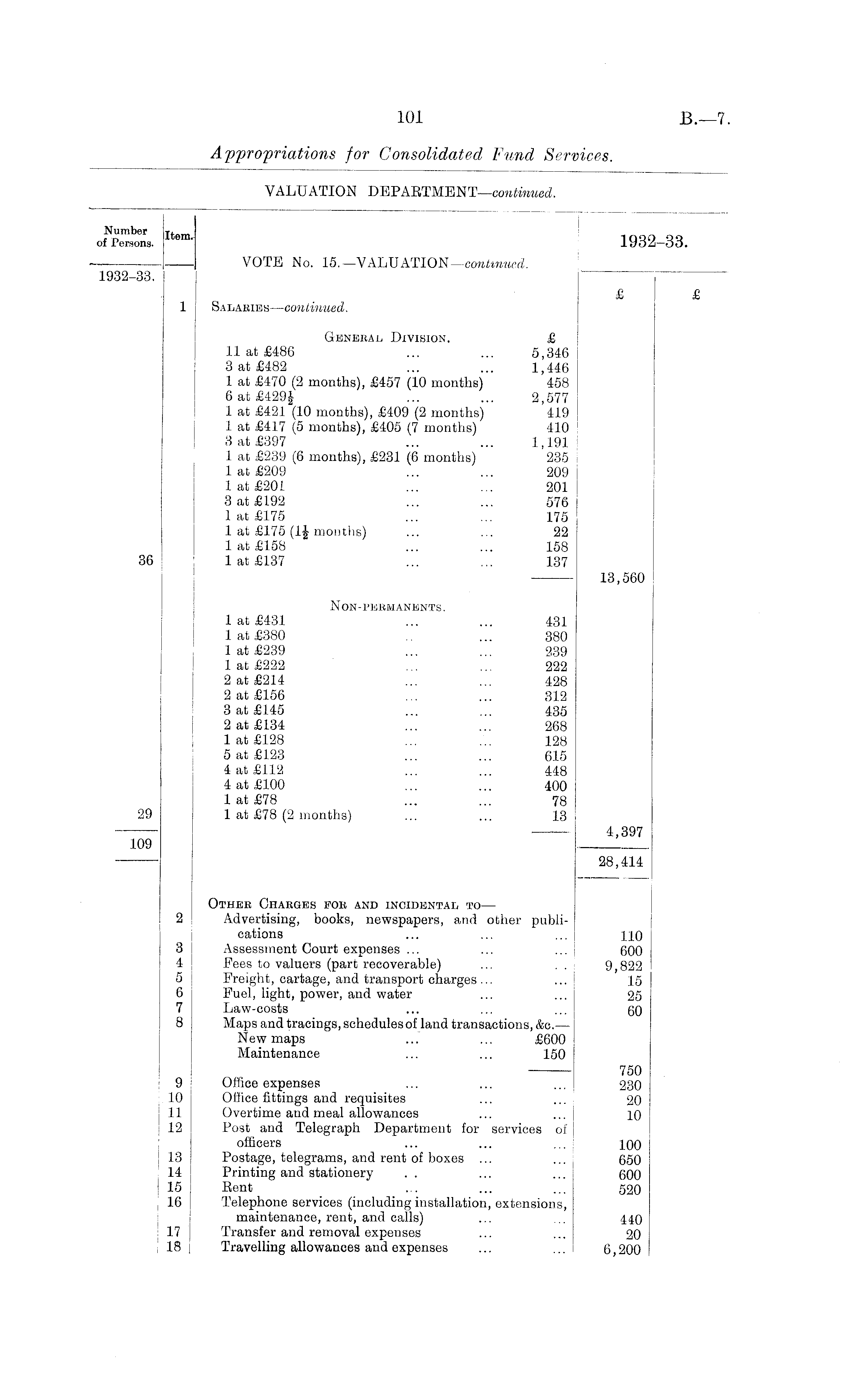Number rt™ „ of Persons. ' 1932—33. ■ VOTE No. 15,—VALUATION—continued. 193 2- 3 3. £ £ 1 Salaries—continued. General Division. £ 11 at £486 ... ... 5,346 3 at £482 ... ... 1,446 1 at £470 (2 months), £457 (10 months) 458 6 at £4291 ... ... 2,577 1 at £421 (10 months), £409 (2 months) 419 1 at £417 (5 months), £405 (7 months) 410 3 at £397 ... ... 1,191 1 at £239 (6 months), £231 (6 months) 235 1 at £209 ... ... 209 1 at £201 ... ... 201 3 at £192 ... ... 576 1 at £175 ... ... 175 1 at £175 (1J months) ... ... 22 1 at £158 ... ... 158 36 1 at £137 ... ... 137 13,560 Non-permanents. 1 at £431 ... ... 431 1 at £380 .. ... 380 1 at £239 ... ... 239 1 at £222 ... ... 222 2 at £214 ... ... 428 2 at £156 ... ... 312 3 at £145 ... ... 435 2 at £134 ... ... 268 1 at £128 ... ... 128 5 at £123 ... ... 615 4 at £112 ... ... 448 4 at £100 ... ... 400 1 at £78 ... ... 78 29 1 at £78 (2 months) ... ... 13 4,397 109 28,414 Other Charges for and incidental to — 2 Advertising, books, newspapers, and other publications ... ... ... no 3 Assessment Court expenses ... ... ... 600 4 Fees to valuers (part recoverable) ... . . 9,822 5 Freight, cartage, and transport charges... ... 15 6 Fuel, light, power, and water ... ... 25 7 Law-costs ... ... ... 60 8 Maps and tracings, schedules of land transactions, &c.— New maps ... ... £600 Maintenance ... ... 150 750 9 Office expenses ... ... ... 230 10 Office fittings and requisites ... ... 20 11 Overtime and meal allowances ... ... 10 12 Post and Telegraph Department for services of officers ... ... ... 100 13 Postage, telegrams, and rent of boxes ... ... 650 14 Printing and stationery . . ... ... 600 j 15 Rent ... ... ... 520 j 16 Telephone services (including installation, extensions, maintenance, rent, and calls) ... ... 440 17 Transfer and removal expenses ... ... 20 I 18 Travelling allowances and expenses ... ... 6,200