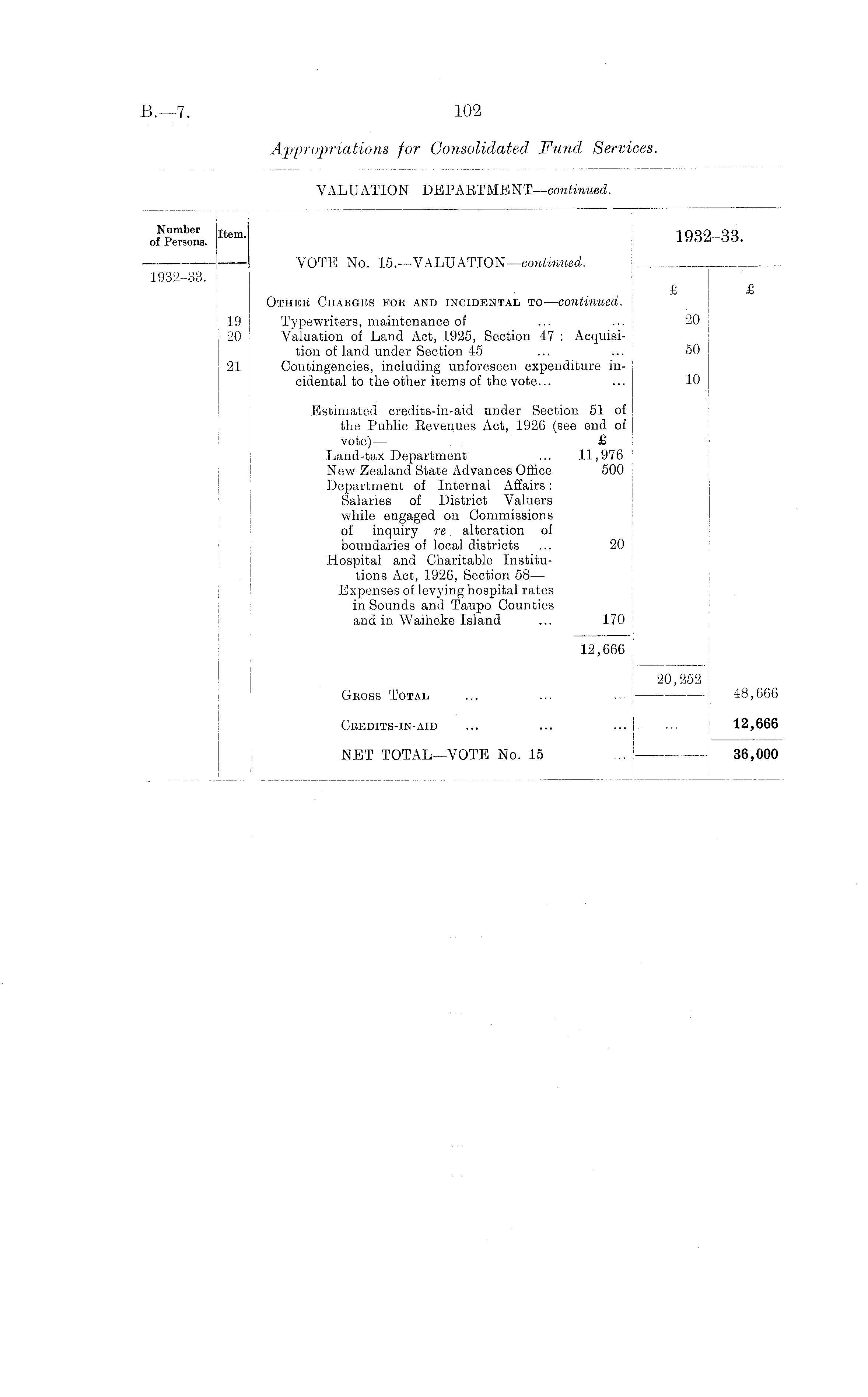 ofpetL Item - 1932-33. VOTE No. 15.—VALUATION —continued. 1932-33. £ £ Other Charges for and incidental to —continued. 19 Typewriters, maintenance of ... ... 20 20 Valuation of Land Act, 1925, Section 47 : Acquisition of land under Section 45 ... ... 50 21 Contingencies, including unforeseen expenditure incidental to the other items of the vote... ... 10 Estimated credits-in-aid under Section 51 of the Public Revenues Act, 1926 (see end of vote)— £ Land-tax Department ... 11,976 New Zealand State Advances Office 500 Department of Internal Affairs: Salaries of District Valuers while engaged on Commissions of inquiry re alteration of boundaries of local districts ... 20 Hospital and Charitable Institutions Act, 1926, Section 58 — Expenses of levying hospital rates in Sounds and Taupo Counties and in Waiheke Island ... 170 12,666 20,252 Gross Total ... ... ... 48,666 Credits-in-aid ... ... ... .. 12,666 NET TOTAL—VOTE No. 15 ... 36,000