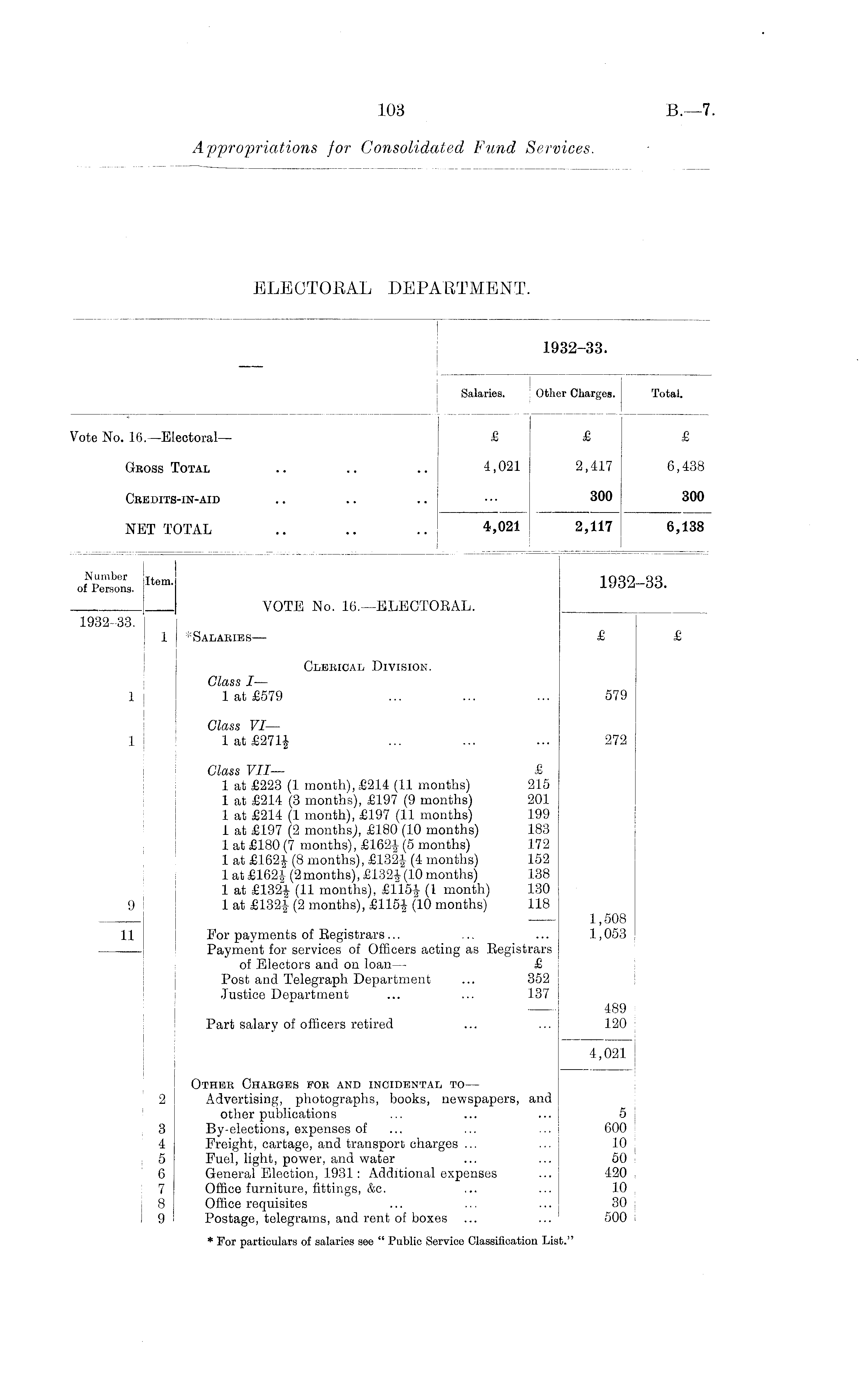 1932-33. Salaries. Other Charges. Total. Vote No. 16. —Electoral— £ £ £ GKOSS TOTAL .. .. .. 4,021 2,417 6,438 Credits-IN-AID .. .. .. ■ • • 300 300 NET TOTAL .. .. .. 4,021 2,117 6,138 ofpetons. Item ' 1932-33. VOTE No. 16.—ELECTORAL. 1932-33. 1 i: Salaries— £ £ Clerical Division. Glass I — 1 1 at £579 ... ... ... 579 Glass VI— 1 lat£271| ... ... ••• 272 Glass VII— £ 1 at £223 (1 month), £214 (11 months) 215 1 at £214 (3 months), £197 (9 months) 201 1 at £214 (1 month), £197 (11 months) 199 1 at £197 (2 months), £180 (10 months) 183 1 at £180 (7 months), £162| (5 months) 172 1 at £162-| (8 months), £132-J (4 months) 152 1 at (2 months), £132f (10 months) 138 1 at £132-| (11 months), £115-| (1 month) 130 9 1 at £132J (2 months), £115-| (10 months) 118 1,508 11 For payments of Registrars... ... ... 1,053 Payment for services of Officers acting as Registrars of Electors and on loan— £ Post and Telegraph Department ... 352 Justice Department ... ... 137 489 Part salary of officers retired ... ... 120 4,021 Other Charges for and incidental to — 2 Advertising, photographs, books, newspapers, and other publications ... ... ... 5 3 By-elections, expenses of ... ... ... 600 4 Freight, cartage, and transport charges ... ... 10 5 Fuel, light, power, and water ... ... 50 6 General Election, 1931: Additional expenses ... 420 7 Office furniture, fittings, &c. ... ... 10 8 Office requisites ... ... ... 30 9 I Postage, telegrams, and rent of boxes ... ... 500 * For particulars of salaries see " Public Service Classification List."