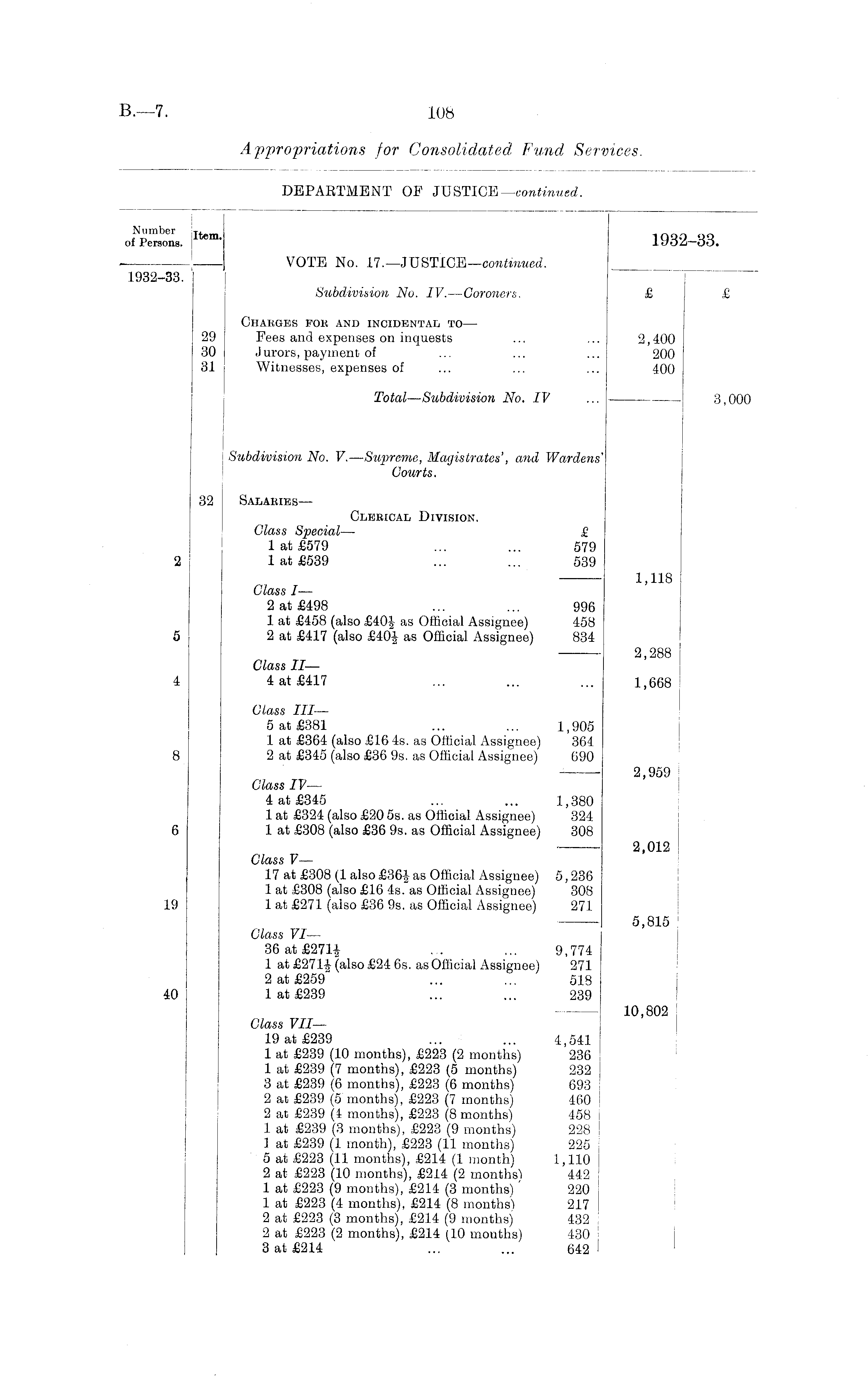 OKom. Item> 1932-33. VOTE No. 17. — JUSTICE—continued. 1932-33. Subdivision No. IV. —Coroners. £ £ Charges for and incidental to — 29 Fees and expenses on inquests ... ... 2,400 30 Jurors, payment of ... ... ... 200 31 Witnesses, expenses of ... ... ... 400 Total—Subdivision No. IV ... 3,000 Subdivision No. V.—Supreme, Magistrates', and Wardens' Courts. 32 Salaries — Clerical Division. Class Special— £ 1 at £579 ... ... 579 2 1 at £539 ... ... 539 1,118 Class I — 2 at £498 ... ... 996 1 at £458 (also £40J as Official Assignee) 458 5 2 at £417 (also £40J as Official Assignee) 834 2,288 Class II— 4 4 at £417 ... ... ... 1,668 Class III— 5 at £381 ... ... 1,905 1 at £364 (also £16 4s. as Official Assignee) 364 8 2 at £345 (also £36 9s. as Official Assignee) 690 2,959 Class IV— 4 at £345 ... ... 1,380 1 at £324 (also £20 5s. as Official Assignee) 324 6 1 at £308 (also £36 9s. as Official Assignee) 308 2,012 Class V— 17 at £308 (1 also £3&| as Official Assignee) 5,236 1 at £308 (also £16 4s. as Official Assignee) 308 19 1 at £271 (also £36 9s. as Official Assignee) 271 5,815 Class VI— 36 at ... ... 9,774 1 at (also £24 6s. as Official Assignee) 271 2 at £259 ... ... 518 40 1 at £239 ... ... 239 10,802 Class VII— 19 at £239 ... ... 4,541 1 at £239 (10 months), £223 (2 months) 236 1 at £239 (7 months), £223 (5 months) 232 3 at £239 (6 months), £223 (6 months) 693 2 at £239 (5 months), £223 (7 months) 460 2 at £239 (4 months), £223 (8 months) 458 1 at £239 (3 months), £223 (9 months) 228 1 at £239 (1 month), £223 (11 months) 225 5 at £223 (11 months), £214 (1 month) 1,110 2 at £223 (10 months), £214 (2 months) 442 1 at £223 (9 months), £214 (3 months) 220 1 at £223 (4 months), £214 (8 months) 217 2 at £223 (3 months), £214 (9 months) 432 2 at £223 (2 months), £214 (10 months) 430 3 at £214 ... ... 642
