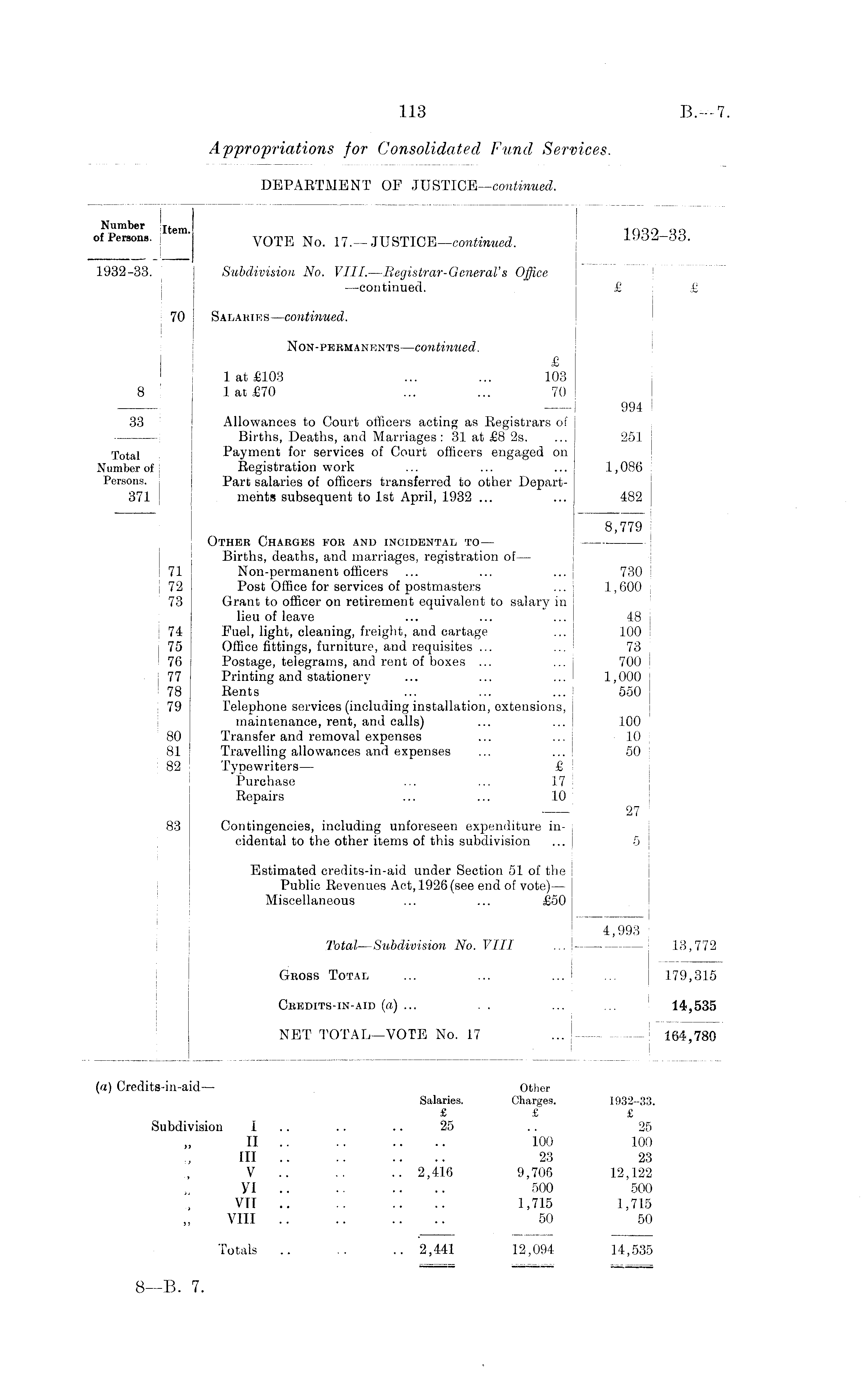 Number [tern. i qqo qq of Persons, j VOTE No. 17. — JUSTICE—continued. WôA-ôô. 1932-33. Subdivision No. VIII.—Registrar-General's Office —continued. £ £ 70 Salaries —continued. Non-permanents—continued. £ 1 at £103 ... ... 103 8 1 at £70 ... ... 70 994 33 Allowances to Court officers acting as Registrars of Births, Deaths, and Marriages: 31 at £8 2s. ... 251 Total Payment for services of Court officers engaged on Number of Registration work ... ... ... 1,086 Persons. Part salaries of officers transferred to other Depart371 mehts subsequent to 1st April, 1932 ... ... 482 8,779 Other Charges foe and incidental to— Births, deaths, and marriages, registration of— 71 Non-permanent officers ... ... ... 730 72 Post Office for services of postmasters ... 1,600 73 Grant to officer on retirement equivalent to salary in lieu of leave ... ... ... 48 74 Fuel, light, cleaning, freight, and cartage ... 100 75 Office fittings, furniture, and requisites ... ... 73 76 Postage, telegrams, and rent of boxes ... ... 700 77 Printing and stationery ... ... ... 1,000 78 Rents ... ... ... 550 79 Telephone services (including installation, extensions, maintenance, rent, and calls) ... ... 100 80 Transfer and removal expenses ... ... 10 81 Travelling allowances and expenses ... ... 50 82 Typewriters— £ Purchase ... ... 17 Repairs ... ... 10 27 83 Contingencies, including unforeseen expenditure incidental to the other items of this subdivision ... 5 Estimated credits-in-aid under Section 51 of the Public Revenues Act, 1926 (see end of vote) — Miscellaneous ... ... £50 4,993 Total—Subdivision No. VIII ... 13,772 Gross Total ... ... ... ... 179,315 Credits-in-aid (a) ... . . ... ... 14,535 NET TOTAL—VOTE No. 17 ... 164,780