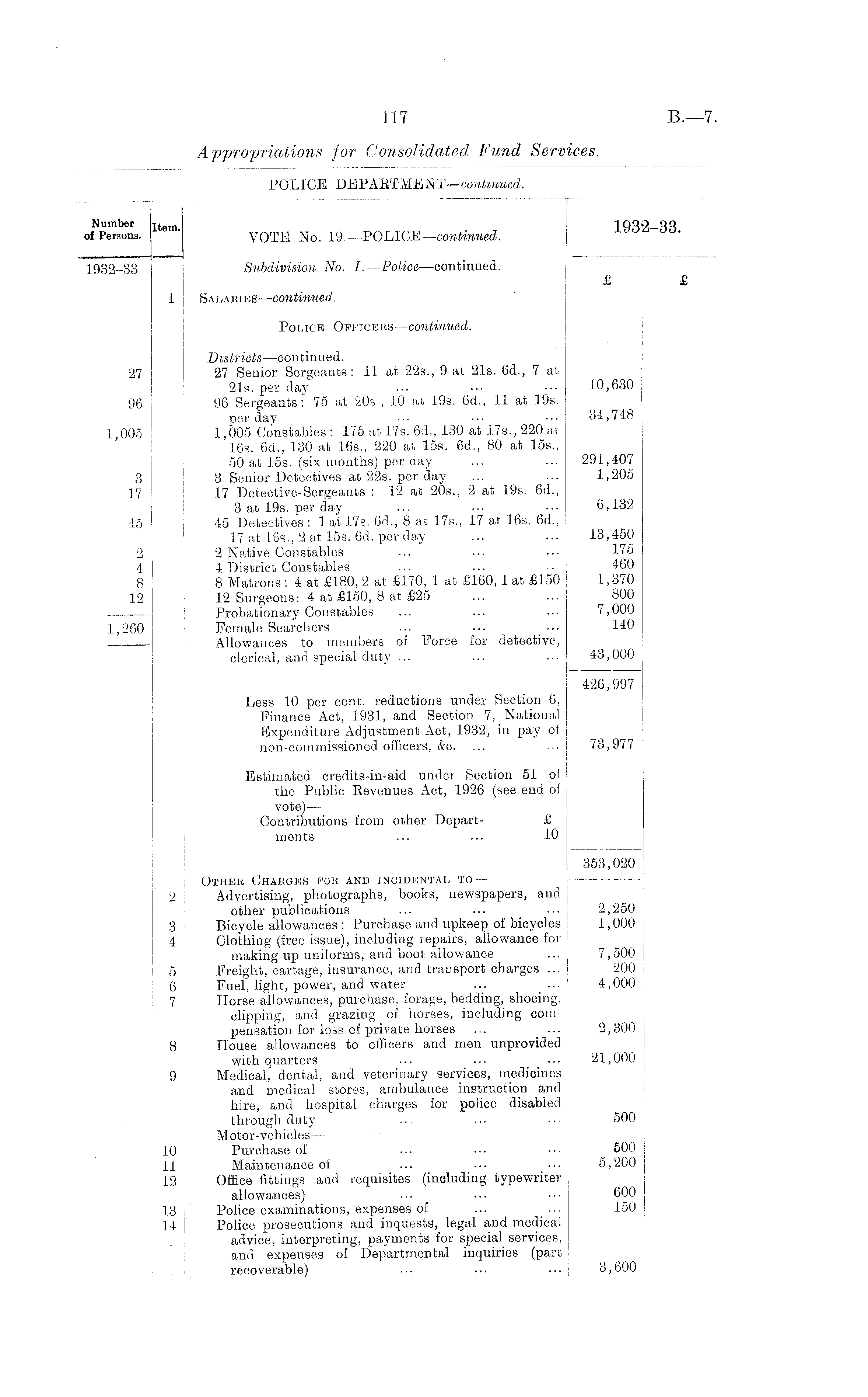 Number T tflm 1 QQQ_QQ of Persona. ' VOTE No. 19. —POLICE —continued. 1932-33 Subdivision No. I.—Police —continued. £ £ 1 Salaries —continued. Police Officeks —continued. Districts —continued. 27 27 Senior Sergeants: 11 at 22s., 9 at 21s. 6d., 7 at 21s. per day ... ••• 10,630 96 96 Sergeants: 75 at 20s., 10 at 19s. 6d., 11 at 19s. per day ••• 34,748 1,005 1,005 Constables : 175 at 17s. 6d,, 130 at 17s., 220 at 16s. 6d>, 130 at 16s., 220 at 15s. 6d., 80 at 15s., 50 at 15s. (six months) per day ... ... 291,407 3 3 Senior Detectives at 22s. per day ... ... 1,205 17 17 Detective-Sergeants : 12 at 20s., 2 at 19s. 6d., 3 at 19s. per day ... ••• ••• 6,132 45 45 Detectives : 1 at 17s. 6d., 8 at 17s., 17 at 16s. 6d., 17 at 16s., 2 at 15s. 6d. per day ... ... 13,450 2 2 Native Constables ... ... 175 4 4 District Constables ... ... 460 8 8 Matrons: 4 at £180,2 at £170, 1 at £160, 1 at £150 1,370 12 12 Surgeons: 4 at £150, 8 at £25 ... ... 800 Probationary Constables ... ... ... 7,000 1,260 Female Searchers ... ... ••• 140 Allowances to members of Force for detective, clerical, and special duty ... ... ... 43,000 426,997 Less 10 per cent, reductions under Section 6, Finance Act, 1931, and Section 7, National Expenditure Adjustment Act, 1932, in pay of non-commissioned officers, &c. ... ... 73,977 Estimated credits-in-aid under Section 51 of the Public Revenues Act, 1926 (see end of vote) — Contributions from other Depart- £ ments ... ... 10 353,020 Otheb Chakqes fob and incidental to — 2 Advertising, photographs, books, newspapers, and other publications ... ... 2,250 3 Bicycle allowances : Purchase and upkeep of bicycles 1,000 4 Clothing (free issue), including repairs, allowance for making up uniforms, and boot allowance ... 7,500 5 I Freight, cartage, insurance, and transport charges ... 200 6 Fuel, light, power, and water ... ... 4,000 7 Horse allowances, purchase, forage, bedding, shoeing, clipping, and grazing of horses, including compensation for loss of private horses ... ... 2,300 8 ! House allowances to officers and men unprovided with quarters ... ... ••• 21,000 9 Medical, dental, and veterinary services, medicines and medical stores, ambulance . instruction and hire, and hospital charges for police disabled through duty ■ ■ • • • • • • 500 Motor-vehicles — 10 Purchase of ... ••• ••• 500 11 Maintenance of ... ... ••• 5,200 12 Office fittings and requisites (including typewriter allowances) ... • • ■ ■ • ■ 600 13 Police examinations, expenses of ... ... 150 14 Police prosecutions and inquests, legal, and medical advice, interpreting, payments for special services, and expenses of Departmental inquiries (part recoverable) ... ••• 3,600