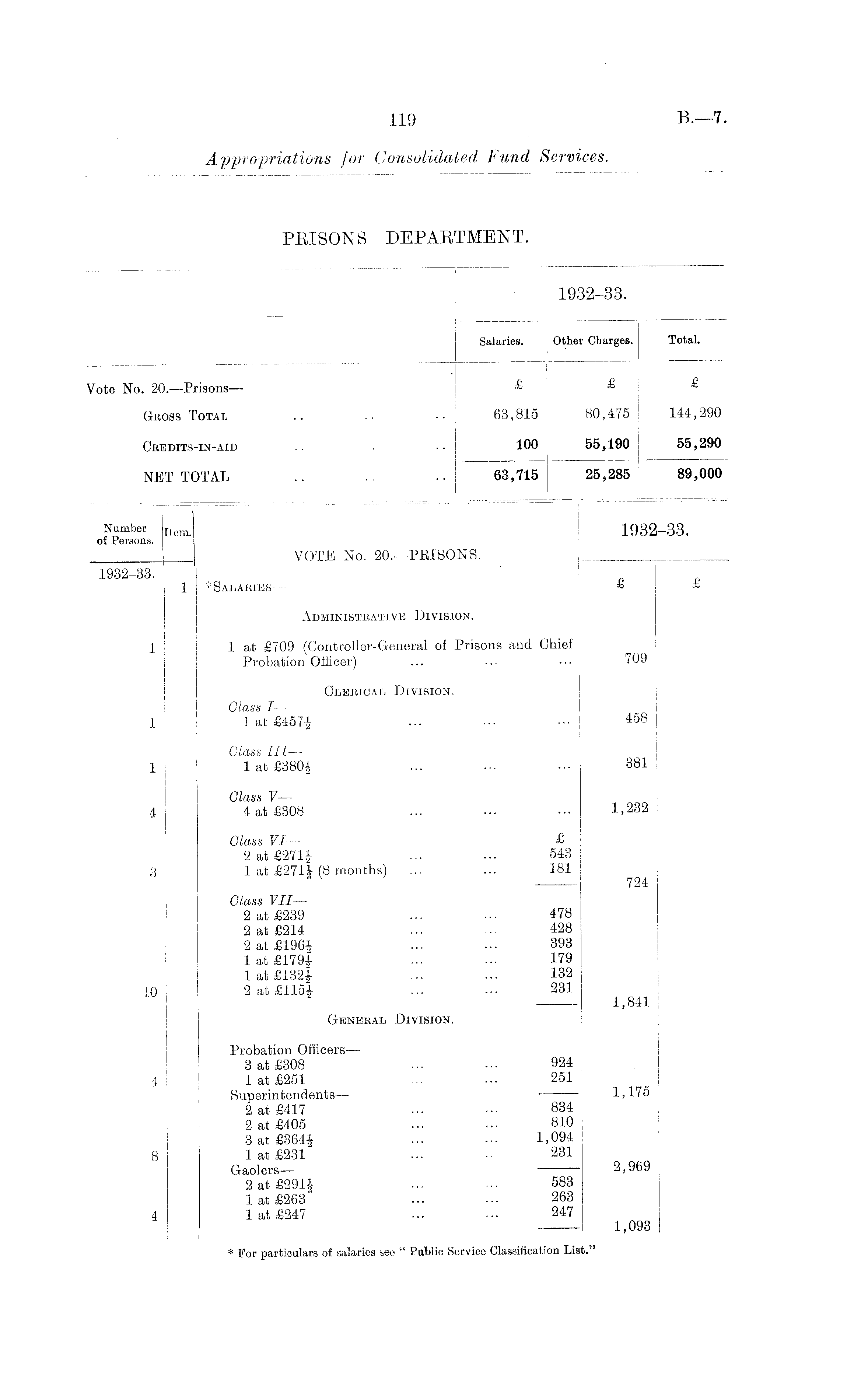 1932-33. Salaries. Other Charges. Total. Vote No. 20. —Prisons — £ £ £ Gross Total .. .. 63,815 j 80,475 144,290 Credits-IN-aid • • 100 55,190 55,290 NET TOTAL .. .. 63,715 25,285 89,000 Number Kem 1932-33. of Persons. VOTE No. 20,—PRISONS. j 1932-33. ! 1 * Salaries — j £ * Administrative Division. 1 1 at £709 (Controller-General of Prisons and Chief Probation Officer) ... ... ••• 709 Clerical Division. Glass I — 1 1 at £457| ... ••• 458 Glass III— 1 1 at £380| ••• ••• •" 381 Glass V — 4 4 at £308 ... ... ••• 1.232 Glass VI- - £ 2 at £271| ... ... 543 3 1 at £271! (8 months) ... ... 181 724 Glass VII — 2 at £239 ... ... 478 2 at £214 ... ... 428 2 at £196| ••• ••• 393 1 at £179i ... ... 179 1 at £132! ... ... 132 10 2 at £115! ... ... 231 1,841 General Division. Probation Officers — 3 at £308 ... 924 4 1 at £251 ... 251 Superintendents — 1 > 175 2 at £417 ... ••• 834 2 at £405 ... ... 810 3 at £364! ... ... 1,094 8 1 at £231 ... - 231 Gaolers — 2,969 2 at £291-|- ... 583 1 at £263 ... 263 4 1 at £247 ... ... 247 1,093 * For particulars of salaries see " Public Service Classification List."