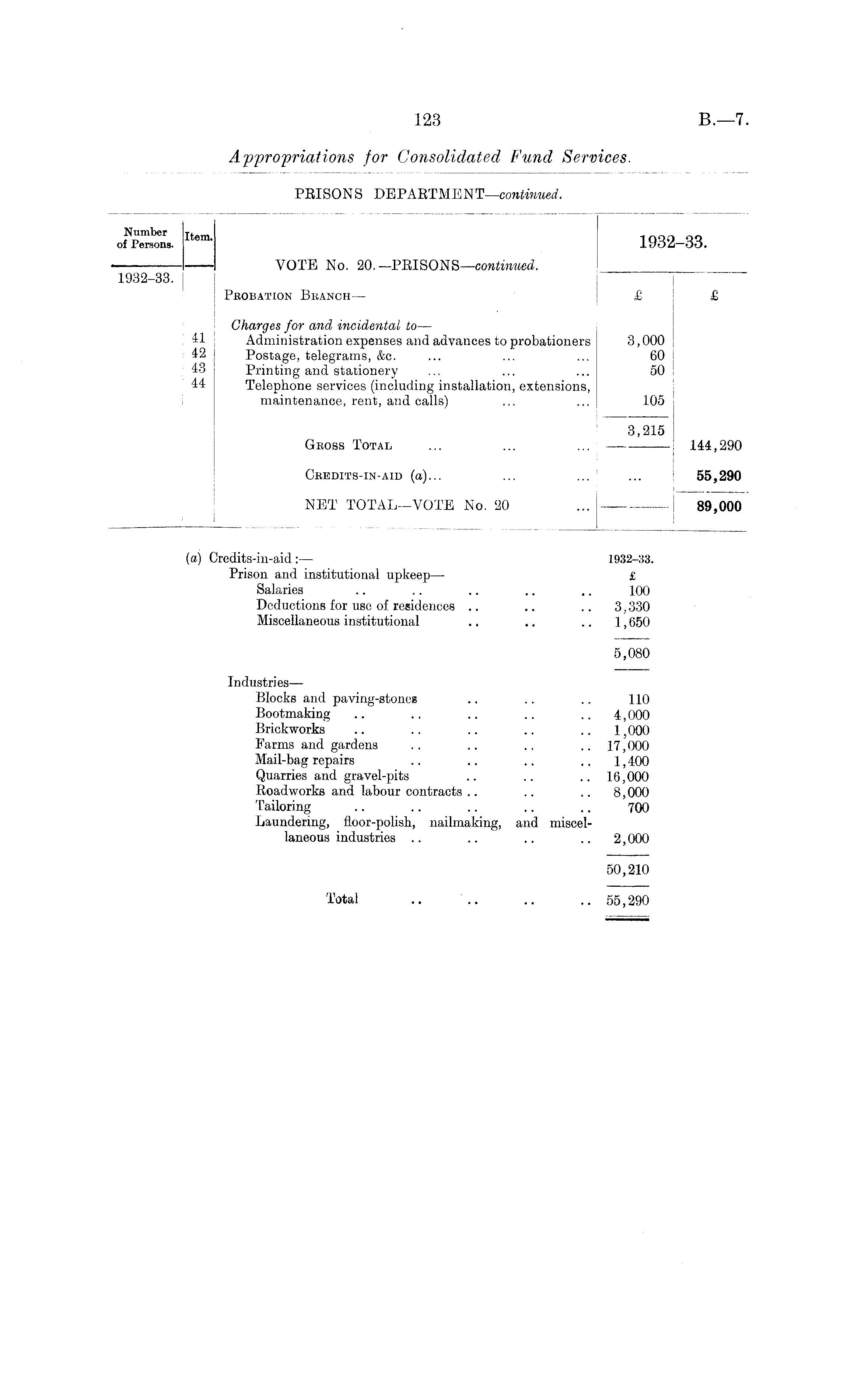 of N pe«ons. Item - 1932-33. VOTE No. 20. —PRISONS —continued. 1932-33. Probation Branch — £ £ Charges for and incidental to — 41 Administration expenses and advances to probationers 3,000 42 Postage, telegrams, &c. ... ... ... 60 43 Printing and stationery ... ... ... 50 44 Telephone services (including installation, extensions, maintenance, rent, and calls) ... ... 105 3,215 GROSS Total ... ... ... — 144,290 Credits-in-aid (a)... ... ... ... 55,290 NET TOTAL—VOTE No. 20 ... — 89,000