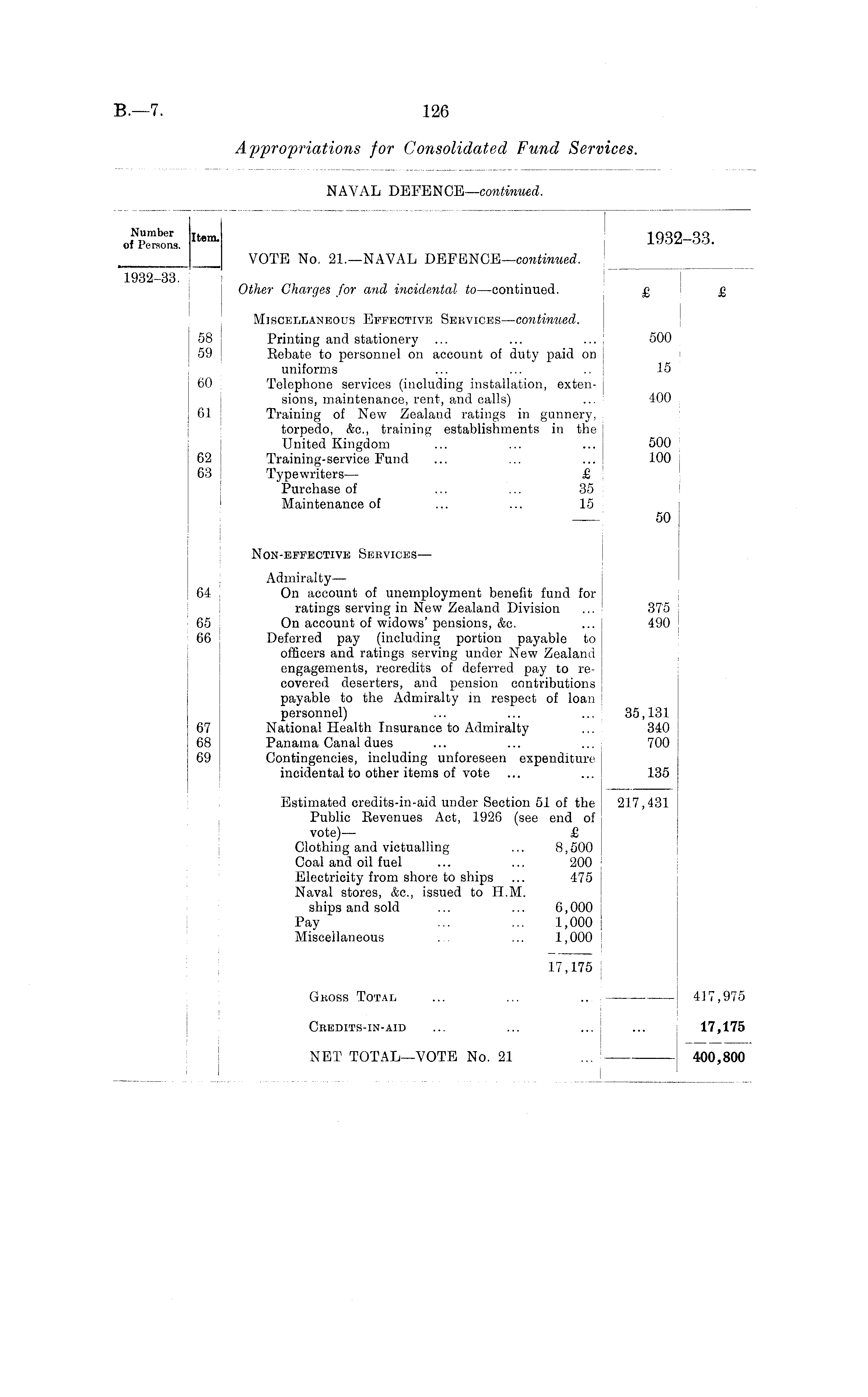 ofpelns. "«• 1932-33. VOTE No. 21,—NAVAL DEFENCE—continued. 1932-33. I Other Charges for and incidental to —continued. £ £ Miscellaneous Effective Services—continued. 58 Printing and stationery ... ... ... 500 59 Rebate to personnel on account of duty paid on uniforms ... ... .. 15 60 Telephone services (including installation, extensions, maintenance, rent, and calls) ... 400 61 Training of New Zealand ratings in gunnery, torpedo, &c., training establishments in the United Kingdom ... ... ... 500 62 Training-service Fund ... ... ... 100 63 Typewriters— £ Purchase of ... ... 35 ! Maintenance of ... ... 15 50 Non-effective Services— Admiralty— 64 On account of unemployment benefit fund for ratings serving in New Zealand Division ... 375 65 On account of widows' pensions, &c. ... 490 66 Deferred pay (including portion payable to officers and ratings serving under New Zealand engagements, recredits of deferred pay to recovered deserters, and pension contributions payable to the Admiralty in respect of loan personnel) ... ... ... 35,131 67 National Health Insurance to Admiralty ... 340 68 Panama Canal dues ... ... ... 700 69 Contingencies, including unforeseen expenditure incidental to other items of vote ... ... 135 Estimated credits-in-aid under Section 51 of the 217,431 Public Revenues Act, 1926 (see end of vote) — £ Clothing and victualling ... 8,500 Coal and oil fuel ... ... 200 Electricity from shore to ships ... 475 Naval stores, &c., issued to H.M. ships and sold ... ... 6,000 Pay ... ... 1,000 Miscellaneous . ... 1,000 17,175 Gross Total ... ... .. 417,975 Credits-in-aid ... ... ... ... 17,175 NET TOTAL—VOTE No. 21 ... 400,800