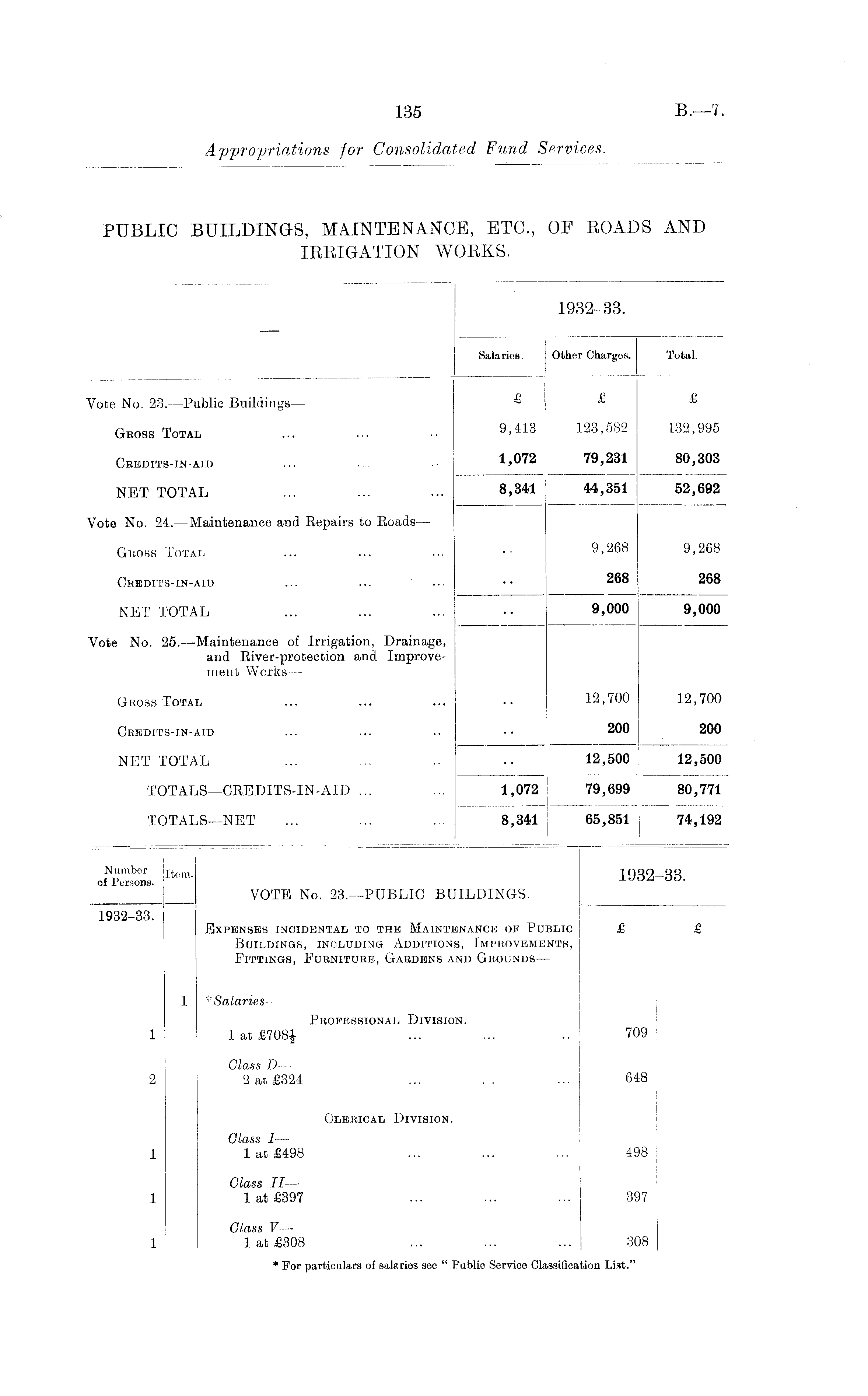 1932-33. Salaries, Other Charges. Total. Vote No. 23.—Public Buildings— £ £ £ GROSS Total 9.413 123,582 132,995 Credits-IN-aid ... ... 1,072 79,231 80,303 NET TOTAL ... ... ••• 8,341 44,351 52,692 Vote No. 24.—Maintenance and Repairs to Eoads— GROSS TOTAL ... ... ... •- 9,268 9,268 Credits-IN-AID ... ... ... • • 268 268 NET TOTAL ... ... ... •• 9.000 9,000 Vote No. 25.—Maintenance of Irrigation, Drainage, and Eiver-protection and Improvement Works — Gross Total ... ... ... •• 12,700 12,700 Credits-in-aid ... ... .. •• 200 200 NET TOTAL ... ... ... .. 12,500 12,500 TOTALS—CREDITS-IN-AID ... ... 1,072 ! 79,699 80,771 TOTALS—NET ... ... 8,341 j 65,851 74,192 ofp™. 1932-33. VOTE No. 23,—PUBLIC BUILDINGS. 1932-33. Expenses incidental to the Maintenance of Public £ £ Buildings, including Additions, Improvements, Fittings, Furniture, Gardens and Grounds — 1 *Salaries — Professional Division. 1 1 at £708| ... ... .. 709 Glass D— 2 2 at £324 ... . .. ... 648 Clerical Division. Glass I— 1 1 at £498 ... ... ... 498 Class II— 1 1 at £397 ... ... ... 397 Glass V— 1 1 at £308 ... ... ... 308 * For particulars of salaries see " Public Service Classification List."
