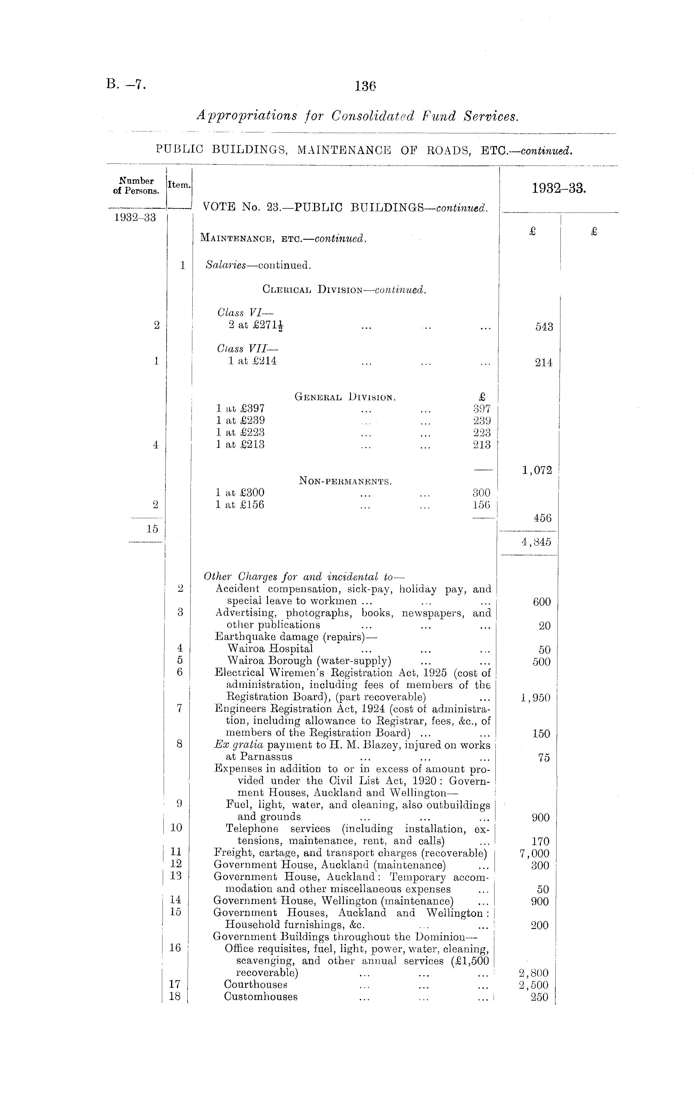 Item - 1932-33. VOTE No. 23,—PUBLIC BUILDINGS—continued. 1932-33 £ £ Maintenance, etc. —continued. 1 Salaries—-continued. Clerical Division—continued. Class VI— 2 2 at £271+ ... . .. ... 543 Class VII— 1 1 at £214 ... ... ... 214 General, Division. £ 1 at £397 ... ... 397 1 at £239 ... ... 239 1 at £223 ... ... 223 4 1 at £213 ... ... 213 — 1,072 Non-pebmanents. 1 at £300 ... ... 300 2 1 at £156 ... ... 156 456 15 4,845 Other Charges for and incidental to — 2 Accident compensation, sick-pay, holiday pay, and speciai leave to workmen ... ... ... 600 3 Advertising, photographs, books, newspapers, and other publications ... ... ... 20 Earthquake damage (repairs)— 4 Wairoa Hospital ... ... ... 50 5 Wairoa Borough (water-supply) ... ... 500 6 Electrical Wiremen's Registration Act, 1925 (cost of administration, including fees of members of the Registration Board), (part recoverable) ... 1,950 7 Engineers Registration Act, 1924 (cost of administration, including allowance to Registrar, fees, &c., of members of the Registration Board) ... ... 150 8 Ex gratia payment to H. M. Blazey, injured on works at Parnassus ... ... ... 75 Expenses in addition to or in excess of amount provided under the Civil List Act, 1920 : Government Houses, Auckland and Wellington— 9 Fuel, light, water, and cleaning, also outbuildings and grounds ... ... ... 900 10 Telephone services (including installation, extensions, maintenance, rent, and calls) ... 170 11 Freight, cartage, and transport charges (recoverable) 7,000 12 Government House, Auckland (maintenance) ... 300 13 Government House, Auckland: Temporary accommodation and other miscellaneous expenses ... 50 14 Government House, Wellington (maintenance) ... 900 15 Government Houses, Auckland and Wellington : Household furnishings, &c. ... ... 200 Government Buildings throughout the Dominion— 16 Office requisites, fuel, light, power, water, cleaning, scavenging, and other annual services (£1,500 recoverable) ... ... ... 2,800 17 Courthouses ... ... ... | 2,500 18 Customhouses ... ... ... 250