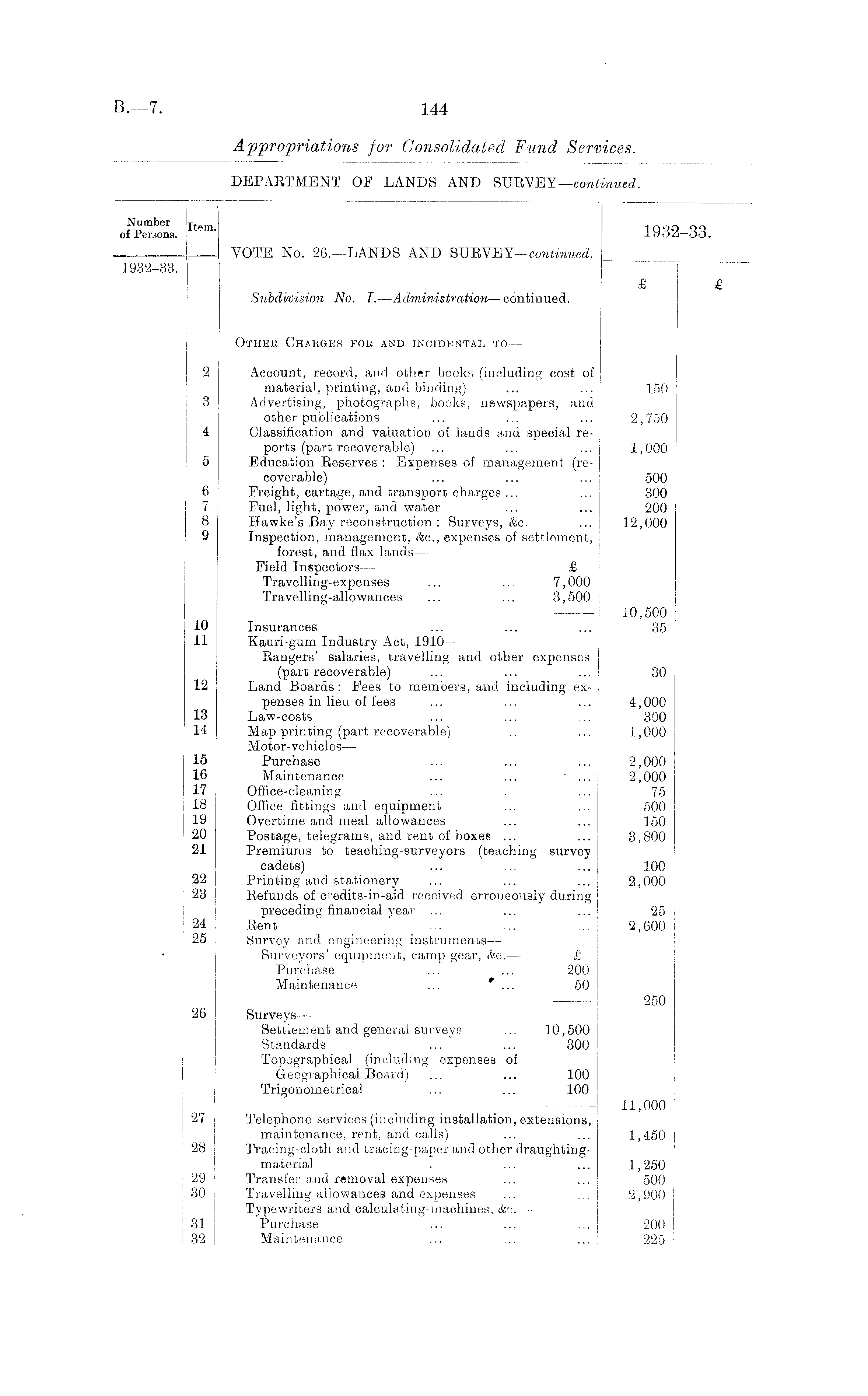 orZl'Z. Item - 1932-33. VOTE No. 26,—LANDS AND SURVEY—continued. 1932-33. £ £ Subdivision No. I.—Administration— continued. Other Chakges fob and incidental to —- 2 Account, record, and other books (including cost of material, printing, and binding) ... ... 150 3 Advertising, photographs, books, newspapers, and other publications ... ... ... 2,750 4 Classification and valuation of lands and special reports (part recoverable) ... ... ... 1,000 5 Education Reserves : Expenses of management (recoverable) ... ... ... 500 6 Freight, cartage, and transport charges... ... 300 7 Fuel, light, power, and water » ... ... 200 8 Hawke's Bay reconstruction : Surveys, &c. ... 12,000 9 Inspection, management, &c., expenses of settlement, forest, and flax lands— Field Inspectors— £ Travelling-expenses ... ... 7,000 Travelling-allowances ... ... 3,500 10,500 10 Insurances ... ... ... 35 11 Kauri-gum Industry Act, 1910— Rangers' salaries, travelling and other expenses (part recoverable) ... ... ... 30 12 Land Boards : Fees to members, and including expenses in lieu of fees ... ... ... 4,000 13 Law-costs ... ... ... 300 14 Map printing (part recoverable) ... 1,000 Motor-vehicles— 15 Purchase ... ... ... 2,000 16 Maintenance ... ... * ... 2,000 17 Office-cleaning ... . . ... 75 18 Office fittings and equipment ... ... 500 19 Overtime and meal allowances ... ... 150 20 Postage, telegrams, and rent of boxes ... ... 3,800 21 Premiums to teaching-surveyors (teaching survey cadets) ... ... 100 22 Printing and stationery ... ... ... 2,000 | 23 Refunds of credits-in-aid received erroneously during preceding financial year ... ... ... 25 24 Rent " ... ... ... 2,600 j 25 J Survey and engineering instruments— | Surveyors' equipment, camp gear, &c.— £ Purchase ... ... 200 Maintenance ... * ... 50 250 26 Surveys— Settlement and general surveys ... 10,500 Standards ... ... 300 Topographical (including expenses of Geographical Board) ... ... 100 Trigonometrical ... ... 100 11,000 27 Telephone services (including installation, extensions, maintenance, rent, and calls) ... ... 1,450 28 Tracing-cloth and tracing-paper and other draughtingmateriai .. ... ... 1,250 29 Transfer and removal expenses ... ... 500 30 Travelling allowances and expenses ... ... 2,900 Typewriters and calculating-machines, &c.-— 31 Purchase ... ... ... 200 32 Maintenance ... ... ... 225 i
