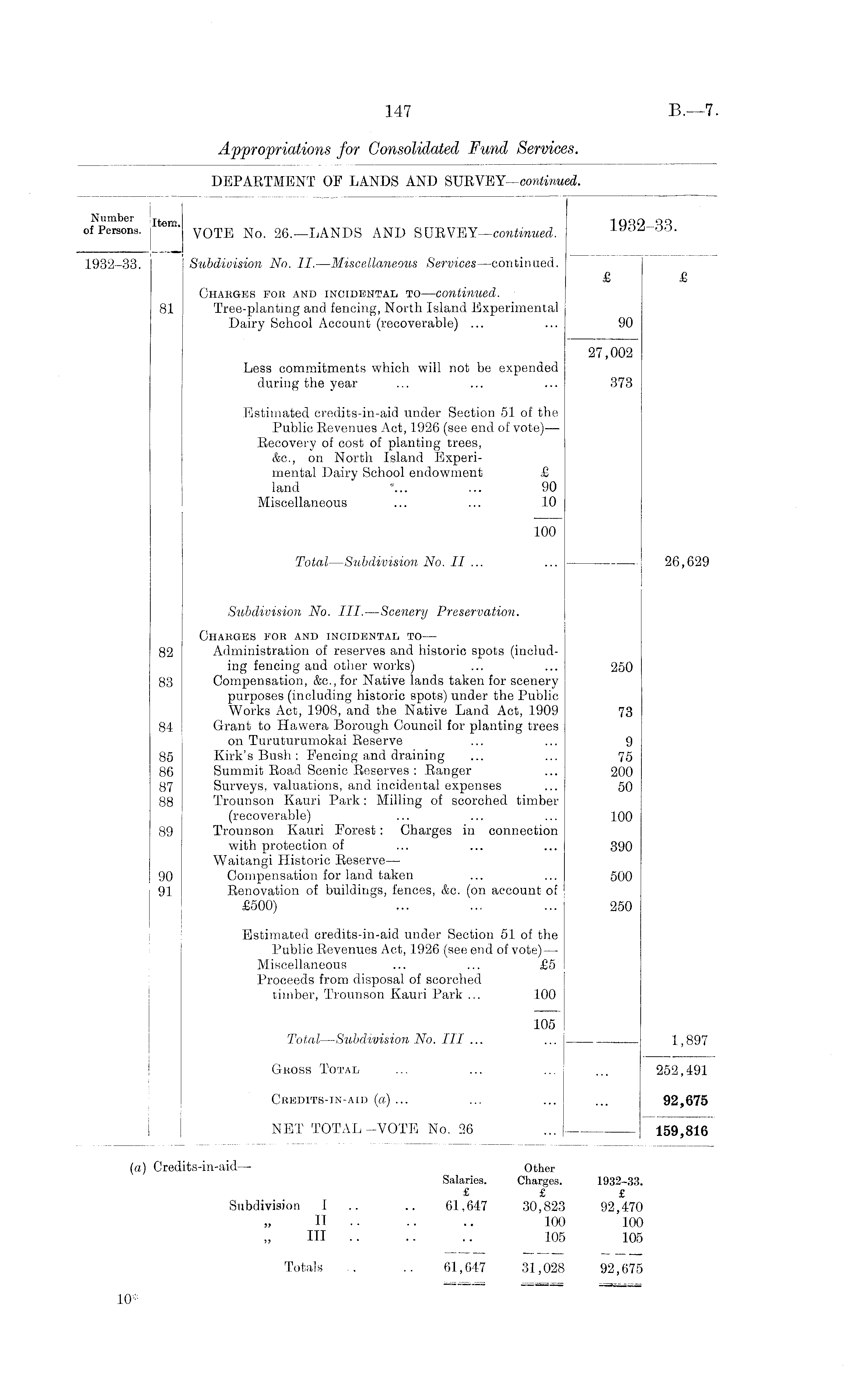 (a) Credits-in-aid — Other Salaries. Charges. 1932-33. £ £ £ Subdivision I .. 61,647 30,823 92,470 II .. .. .. 100 100 111 .. .. .. 105 105 Totals .. .. 61,647 31,028 92,675