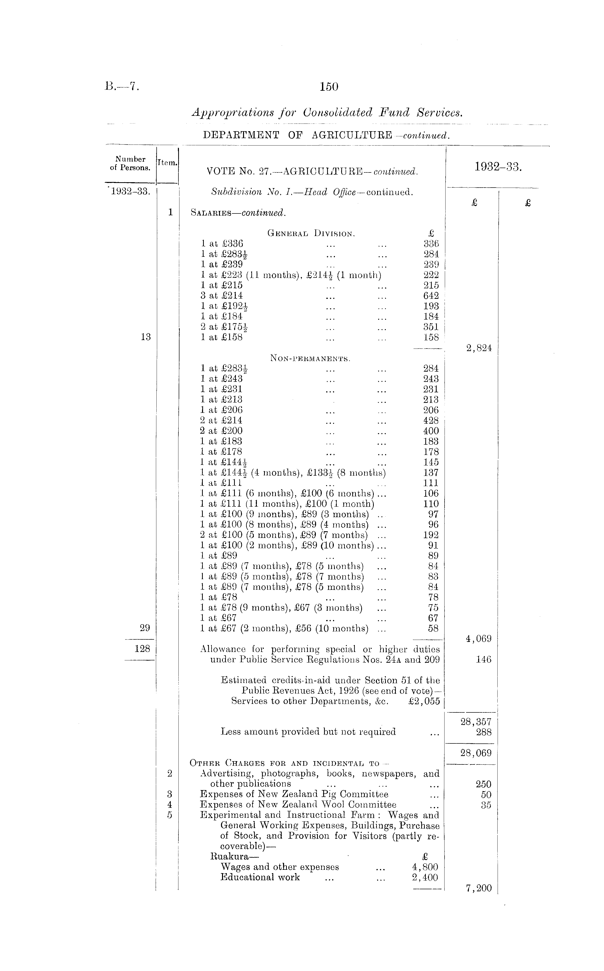 Number Jt em 1 0 of Persons. ' VOTE No. 27. —AGRICULTURE —continued. 1932-33. 1932-33. Subdivision No. I. —Head Office —continued. £ £ 1 Salaries—continued. General Division. £ 1 at £336 ... ... 336 1 at £283i ... ... 284 1 at £239" ... ... 239 1 at £223 (11 months), £214f (1 month) 222 1 at £215 ... ... 215 3 at £214 ... ... 642 1 at £1921 ... ... 193 1 at £184 ... ... 184 2 at £175i * ... ... 351 13 1 at £158 ... ... 158 2,824 Non-permanents. 1 at £2831 ... ... 284 1 at £243 ... ... 243 1 at £231 ... ... 231 1 at £213 ... 213 1 at £206 ... ... 206 2 at £214 ... ... 428 2 at £200 ... ... 400 1 at £183 ... ... 183 1 at £178 ... ... 178 1 at £144-J ••• ••• 145 1 at £144| (4 months), £133-| (8 months) 137 1 at £111" ... ... Ill 1 at £111 (6 months), £100 (6 months) ... 106 1 at £111 (11 months), £100 (1 month) 110 1 at £100 (9 months), £89 (3 months) .. 97 1 at £100 (8 months), £89 (4 months) ... 96 2 at £100 (5 months), £89 (7 months) ... 192 1 at £100 (2 months), £89 (10 months) ... 91 1 at £89 ... ... 89 1 at £89 (7 months), £78 (5 months) ... 84 1 at £89 (5 months), £78 (7 months) ... 83 1 at £89 (7 months), £78 (5 months) ... 84 1 at £78 ... ... 78 1 at £78 (9 months), £67 (3 months) ... 75 1 at £67 ... ... 67 29 1 at £67 (2 months), £56 (10 months) ... 58 4,069 .128 Allowance for performing special or higher duties under Public Service Regulations Nos. 24a and 209 146 Estimated credits-in-aid under Section 51 of the Public Revenues Act, 1926 (see end of vote)— Services to other Departments, &c. £2,055 28,357 Less amount provided but not required ... 288 28,069 Other Charges for and incidental to— 2 Advertising, photographs, books, newspapers, and other publications ... ... ... 250 3 Expenses of New Zealand Pig Committee ... 50 4 Expenses of New Zealand Wool Committee ... 35 5 Experimental and Instructional Farm : Wages and General Working Expenses, Buildings, Purchase of Stock, and Provision for Visitors (partly recoverable) — Ruakura— £ Wages and other expenses ... 4,800 Educational work ... ... 2,400 — 7,200