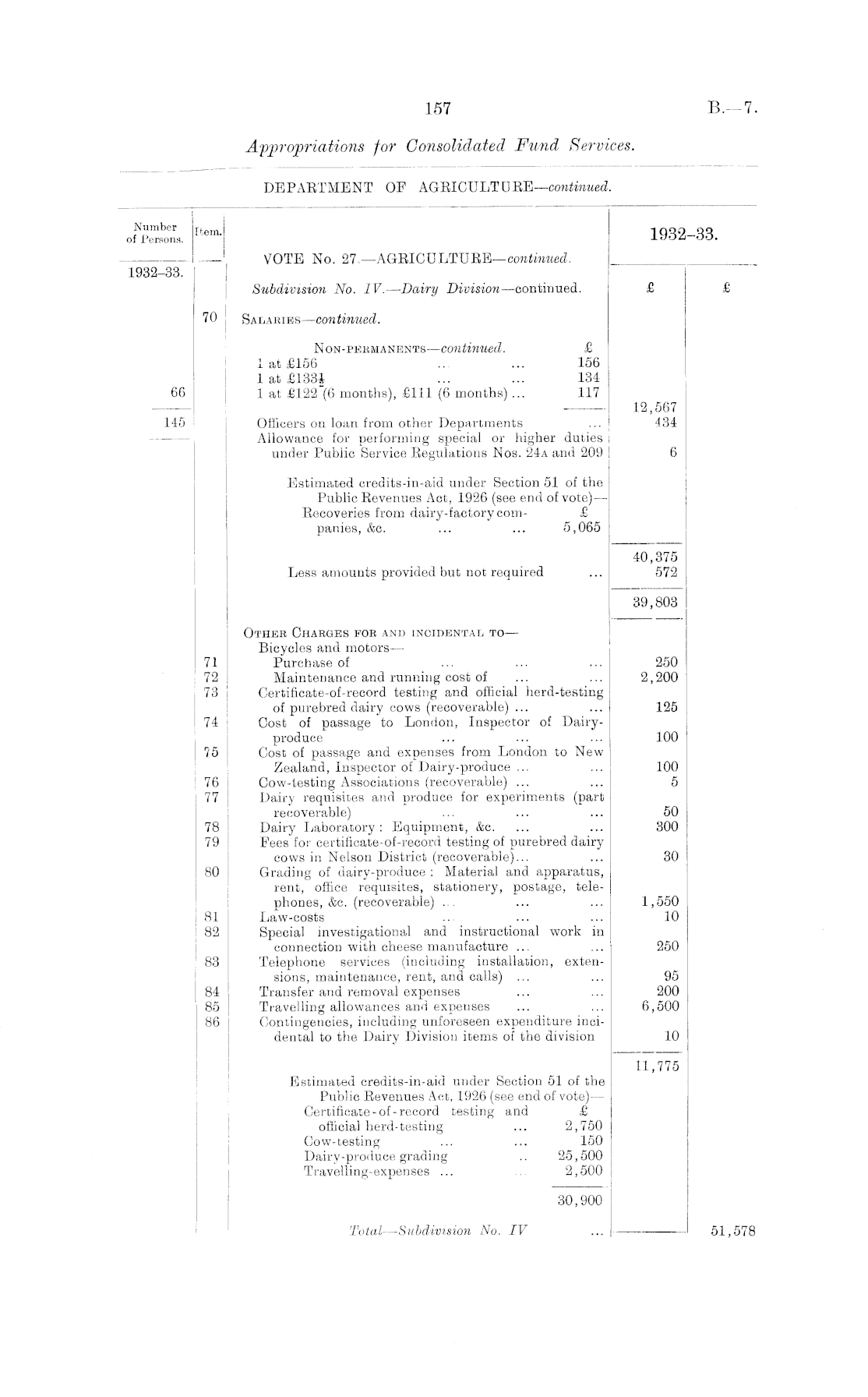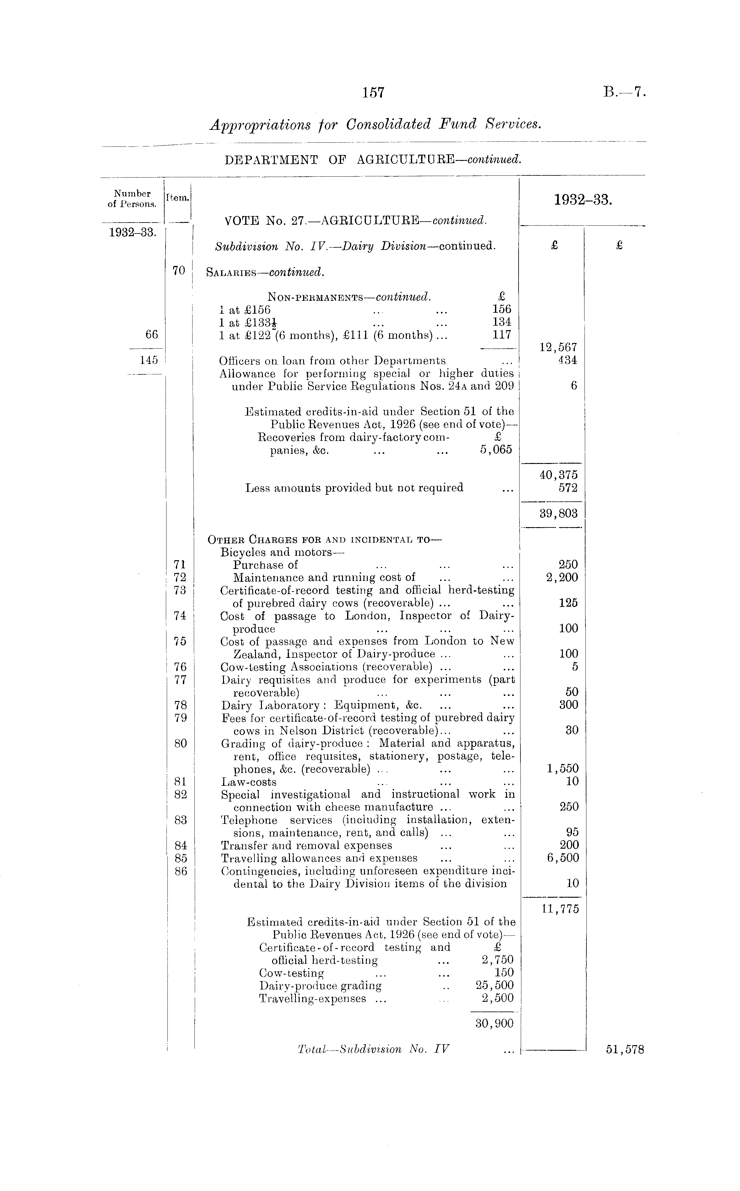 o"n, rtem - 1932-33. VOTE No. 27. —AGRICULTURE—continued. ■ 1932-33. Subdivision No. IV.—Dairy Division —continued. £ £ 70 Salaries —continued. Non-pebmanents—continued. £ 1 at £156 ... ... 156 1 at £133£ ... ... 134 66 1 at £122 (6 months), £111 (6 months) ... 117 12,567 145 Officers on loan from other Departments ... 434 Allowance for performing special or higher duties under Public Service Regulations Nos. 24a and 209 6 Estimated credits-in-aid under Section 51 of the Public Eevenues Act, 1926 (see end of vote) — Recoveries from dairy-factory com- £ panies, &c. ... ... 5,065 40,375 Less amounts provided but not required ... 572 39,803 Othee Charges for and incidental to — Bicycles and motors— 71 Purchase of ... ... ... 250 72 Maintenance and running cost of ... ... 2,200 73 Certificate-of-record testing and official herd-testing of purebred dairy cows (recoverable) ... ... 125 74 Cost of passage to London, Inspector of Dairyproduce ... ... ... 100 75 Cost of passage and expenses from London to New Zealand, Inspector of Dairy-produce ... ... 100 76 Cow-testing Associations (recoverable) ... ... 5 77 Dairy requisites and produce for experiments (part recoverable) ... ... ... 50 78 Dairy Laboratory: Equipment, &c. ... ... 300 79 Fees for certificate-of-record testing of purebred dairy cows in Nelson District (recoverable)... ... 30 80 Grading of dairy-produce : Material and apparatus, rent, office requisites, stationery, postage, telephones, &c. (recoverable) ... ... ... 1,550 81 Law-costs .. ... ... 10 82 Special investigational and instructional work in connection with cheese manufacture ... ... 250 83 Telephone services (including installation, extensions, maintenance, rent, and calls) ... ... 95 84 Transfer and removal expenses ... ... 200 85 Travelling allowances and expenses ... ... 6,500 86 Contingencies, including unforeseen expenditure incidental to the Dairy Division items of the division 10 11,775 Estimated credits-in-aid under Section 51 of the Public Revenues Act, 1926 (see end of vote) — Certificate-of-record testing and £ official herd-testing ... 2,750 Cow-testing ... ... 150 Dairy-produce grading .. 25,500 Travelling-expenses ... ... 2,500 30,900 Total—Subdivision No. IV ... 51,578