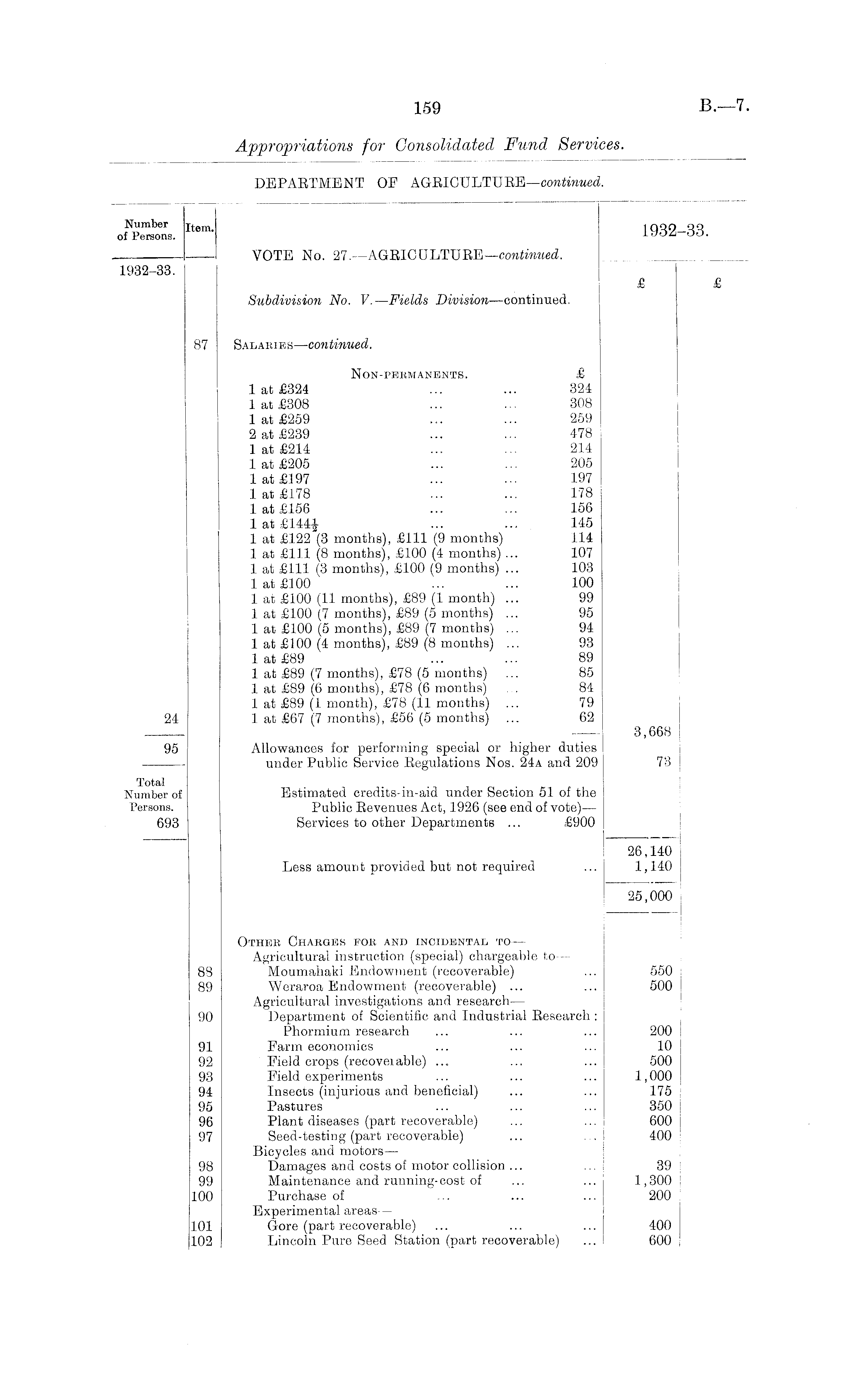 ofpetons. Item " 1932-33. —- VOTE No. 27. —AGRICULTURE —continued. _ _ 1932-33. £ £ Subdivision No. V.—Fields Division—continued. 87 Salaries—continued. Non-permanents. £ 1 at £324 ... ... 324 1 at £308 ... ... 308 1 at £259 ... ... 259 2 at £239 ... ... 478 1 at £214 ... ... 214 1 at £205 ... ... 205 1 at £197 ... ... 197 1 at £178 ... ... 178 1 at £156 ... ... 156 1 at ... ... 145 1 at £122 (3 months), £111 (9 months) 114 1 at £111 (8 months), £100 (4 months) ... 107 1 at £111 (3 months), £100 (9 months) ... 103 1 at £100 ... ... 100 1 at £100 (11 months), £89 (1 month) ... 99 1 at £100 (7 months), £89 (5 months) ... 95 1 at £100 (5 months), £89 (7 months) ... 94 1 at £100 (4 months), £89 (8 months) ... 93 1 at £89 ... ... 89 1 at £89 (7 months), £78 (5 months) ... 85 1 at £89 (6 months), £78 (6 months) ... 84 1 at £89 (1 month), £78 (11 months) ... 79 24 1 at £67 (7 months), £56 (5 months) ... 62 ' 3,668 95 Allowances for performing special or higher duties under Public Service Regulations Nos. 24a and 209 73 Total ... Number of Estimated credits-m-aid under Section 51 of the Persons. Public Revenues Act, 1926 (see end of vote) — 693 Services to other Departments ... £900 26,140 Less amount provided but not required ... 1,140 25,000 Other Charges for and incidental to — Agricultural instruction (special) chargeable to— 88 Moumahaki Endowment (recoverable) ... 550 89 Weraroa Endowment (recoverable) ... ... 500 Agricultural investigations and research — 90 Department of Scientific and Industrial Research : Phormium research ... ... ... 200 91 Farm economics ... ... ... 10 92 Field crops (recoveiable) ... ... ... 500 93 Field experiments ... ... ... 1,000 94 Insects (injurious and beneficial) ... ... 175 95 Pastures ... ... ... 350 96 Plant diseases (part recoverable) ... ... 600 97 Seed-testing (part recoverable) ... ... 400 Bicycles and motors — j 98 Damages and costs of motor collision ... ... j 39 99 Maintenance and running-cost of ... ... j 1,300 100 Purchase of ... ... ... 200 Experimental areas— 101 Gore (part recoverable) ... ... ... 400 102 Lincoln Pure Seed Station (part recoverable) ... 600