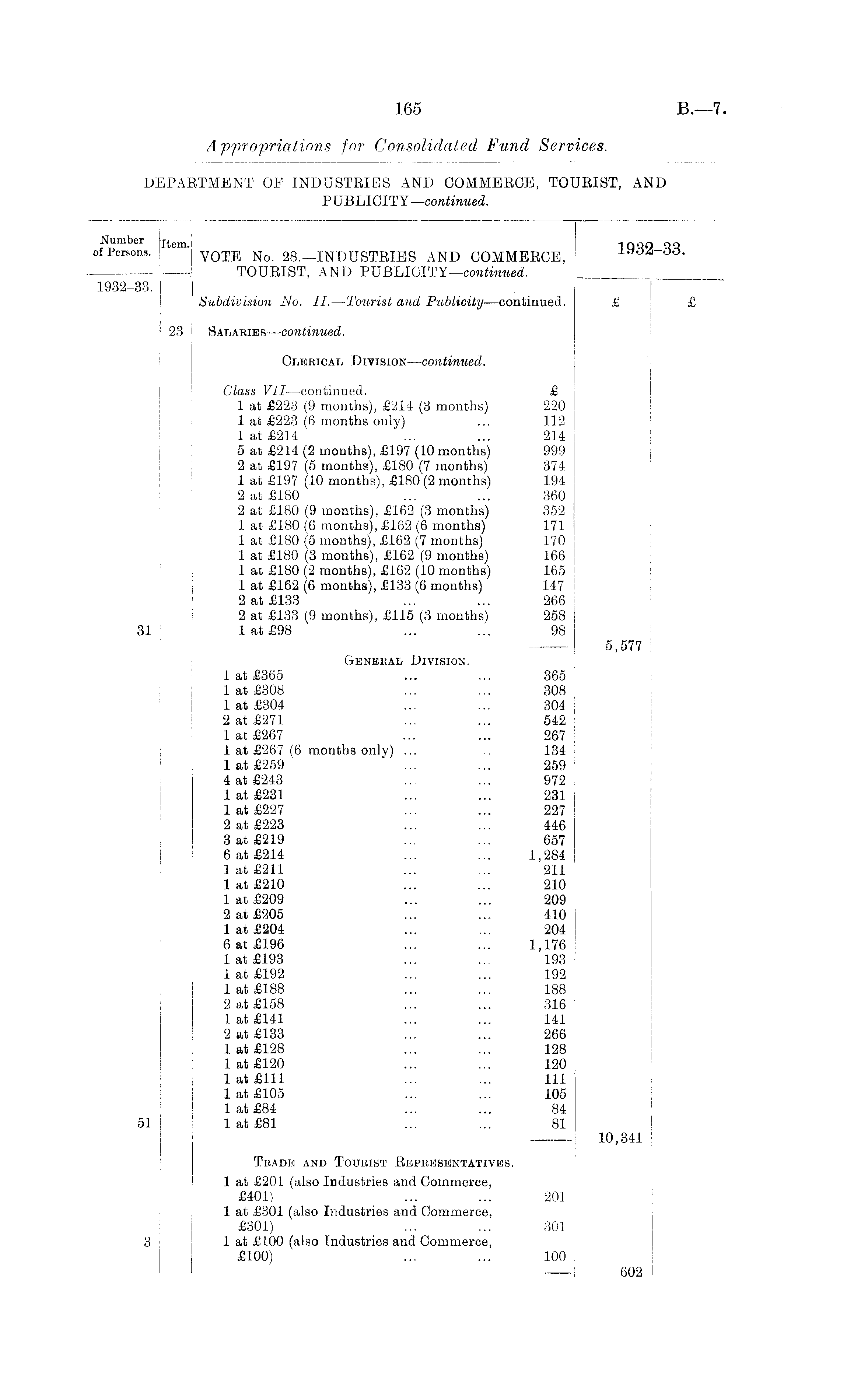 Number item. 1QQQ_QQ of Persons. VOTE No. 28,—INDUSTRIES AND GOMMEEGE, ° 0, i TOURIST, AND PUBLICITY—continued. 1932-33. Subdivision No. II.—Tourist and Publicity—continued. £ £ 23 Salaries—continued. Clerical Division—continued. Class VII—continued. £ 1 at £223 (9 months), £214 (3 months) 220 1 at £223 (6 months only) ... 112 1 at £214 ... ... 214 5 at £214 (2 months), £197 (10 months) 999 2 at £197 (5 months), £180 (7 months) 374 1 at £197 (10 months), £180 (2 months) 194 2 at £180 ... ... 360 2 at £180 (9 months), £162 (3 months) 352 1 at £180 (6 months), £162 (6 months) 171 1 at £180 (5 months), £162 (7 months) 170 1 at £180 (3 months), £162 (9 months) 166 1 at £180 (2 months), £162 (10 months) 165 1 at £162 (6 months), £133 (6 months) 147 2 at £133 ... ... 266 2 at £133 (9 months), £115 (3 months) 258 31 1 at £98 ... ... 98 5,577 General Division. 1 at £365 ... ... 365 1 at £308 ... ... 308 1 at £304 ... ... 304 2 at £271 ... ... 542 1 at £267 ... ... 267 1 at £267 (6 months onlv) ... ... 134 1 at £259 ... ... 259 4 at £243 ... ... S72 1 at £231 ... ... 231 1 at £227 ... ... 227 2 at £223 ... ... 446 3 at £219 ... ... 657 6 at £214 ... ... 1,284 1 at £211 ... ... 211 1 at £210 ... ... 210 1 at £209 ... ... 209 2 at £205 ... ... 410 1 at £204 ... ... 204 6 at £196 ... ... 1,176 1 at £193 ... ... 193 1 at £192 ... ... 192 1 at £188 ... ... 188 2 at £158 ... ... 316 1 at £141 ... ... 141 2 at £133 ... ... 266 1 at £128 ... ... 128 1 at £120 ... ... 120 1 at £111 ... ... Ill 1 at £105 ... ... 105 1 at £84 ... ... 84 51 1 at £81 ... ... 81 10,341 Trade and Tourist Representatives. 1 at £20L (also Industries and Commerce, £401) ... ... 201 1 at £301 (also Industries and Commerce, £301) ... ... 301 3 1 at £100 (also Industries and Commerce, £100) ... ... 100 602