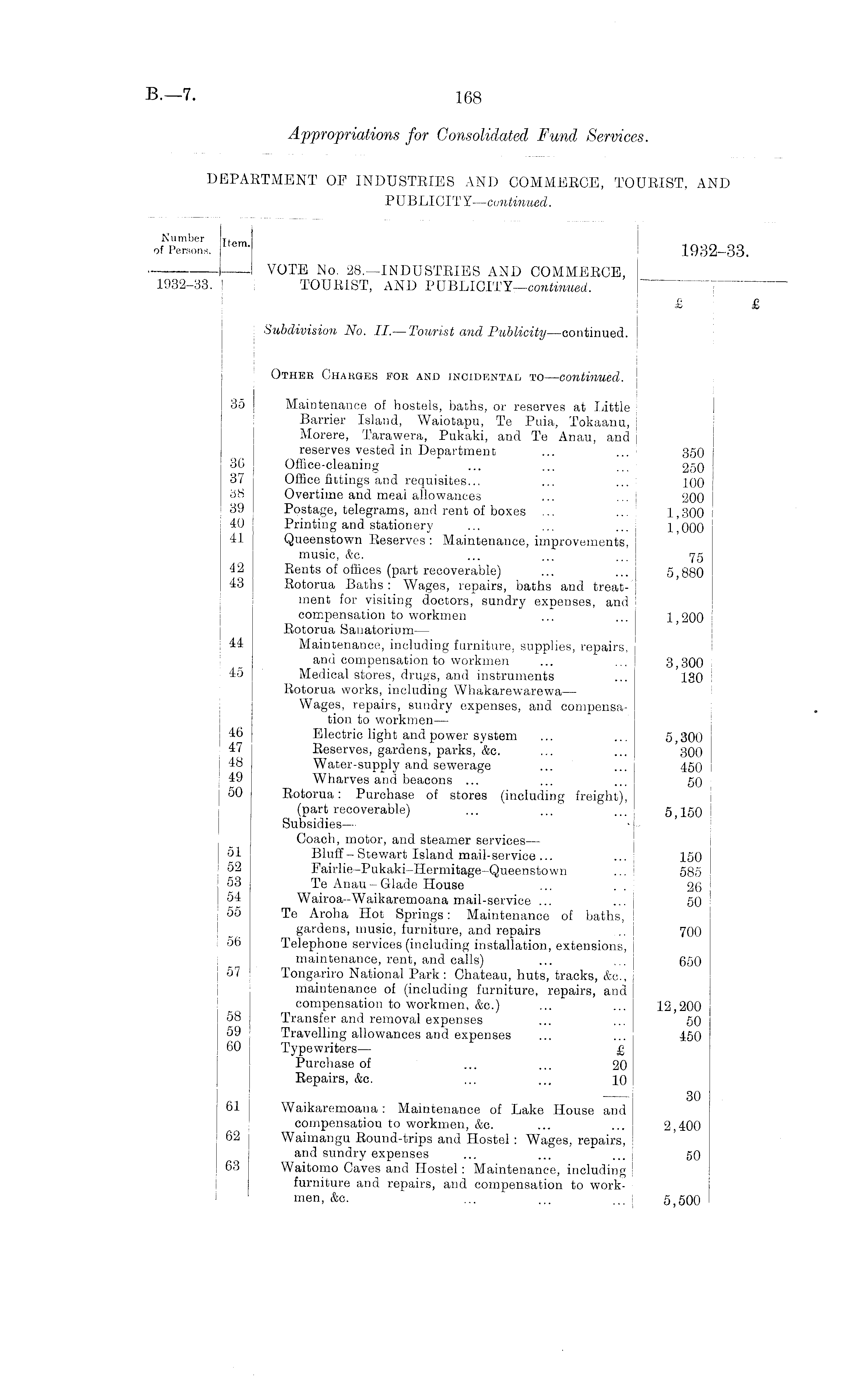 Number r f „„ of Persons. ' 1932—33. J VOTE No. 28.—INDUSTRIES AND COMMERCE, 1932-33. TOURIST, AND PUBLICITY—continued. £ £ Subdivision No. II.— Tourist and Publicity—continued. ' Othek Chakges fob and incidental to —continued. 35 Maintenance of hostels, baths, or reserves at Little Barrier Island, Waiotapu, Te Puia, Tokaanu, Morere, Tarawera, Pukaki, and Te Anau, and reserves vested in Department ... ... 350 36 Office-cleaning ... ... ... 250 37 Office fittings and requisites... ... ... i 100 38 Overtime and meal allowances ... ... I 200 39 Postage, telegrams, and rent of boxes ... ... 1,300 40 Printing and stationery ... ... ... 1^000 41 Queenstown Reserves : Maintenance, improvements, music, &c. ... ... ... 75 42 Rents of offices (part recoverable) ... ... 5 880 43 Rotorua Baths : Wages, repairs, baths and treatment for visiting doctors, sundry expenses, and compensation to workmen ... ... i 200 Rotorua Sanatorium— 44 Maintenance, including furniture, supplies, repairs, and compensation to workmen ... ... 3 300 j 45 Medical stores, drugs, and instruments ... 130 Rotorua works, including Whakarewarewa— Wages, repairs, sundry expenses, and compensation to workmen— 46 Electric light and power system ... ... 5,300 47 Reserves, gardens, parks, &c. ... ... 300 48 Water-supply and sewerage ... ... 450 49 Wharves and beacons ... ... ... 50 50 Rotorua: Purchase of stores (including freight), (part recoverable) ... ..." ... 5 150 Subsidies— Coach, motor, and steamer services— '51 Bluff-Stewart Island mail-service... ... 150 52 Fairlie-Pukaki-Hermitage-Queenstown ... 585 53 Te Anau - Glade House ... . . 26 54 Wairoa-Waikaremoana mail-service ... ... 50 55 Te Aroha Hot Springs: Maintenance of baths, gardens, music, furniture, and repairs .. 700 56 Telephone services (including installation, extensions, maintenance, rent, and calls) ... ... 650 57 Tongariro National Park : Chateau, huts, tracks, &c., maintenance of (including furniture, repairs, and compensation to workmen, &c.) ... ... 12,200 58 Transfer and removal expenses ... ... 50 59 Travelling allowances and expenses ... ... 450 60 Typewriters— £ Purchase of ... ... 20 Repairs, &c. ... ... 10 30 61 Waikaremoana : Maintenance of Lake House and compensation to workmen, &c. ... ... 2,400 62 Waimangu Round-trips and Hostel : Wages, repairs, and sundry expenses ... ... ... 50 63 Waitomo Caves and Hostel: Maintenance, including furniture and repairs, and compensation to workmen, &c. ... ... ... 5,500