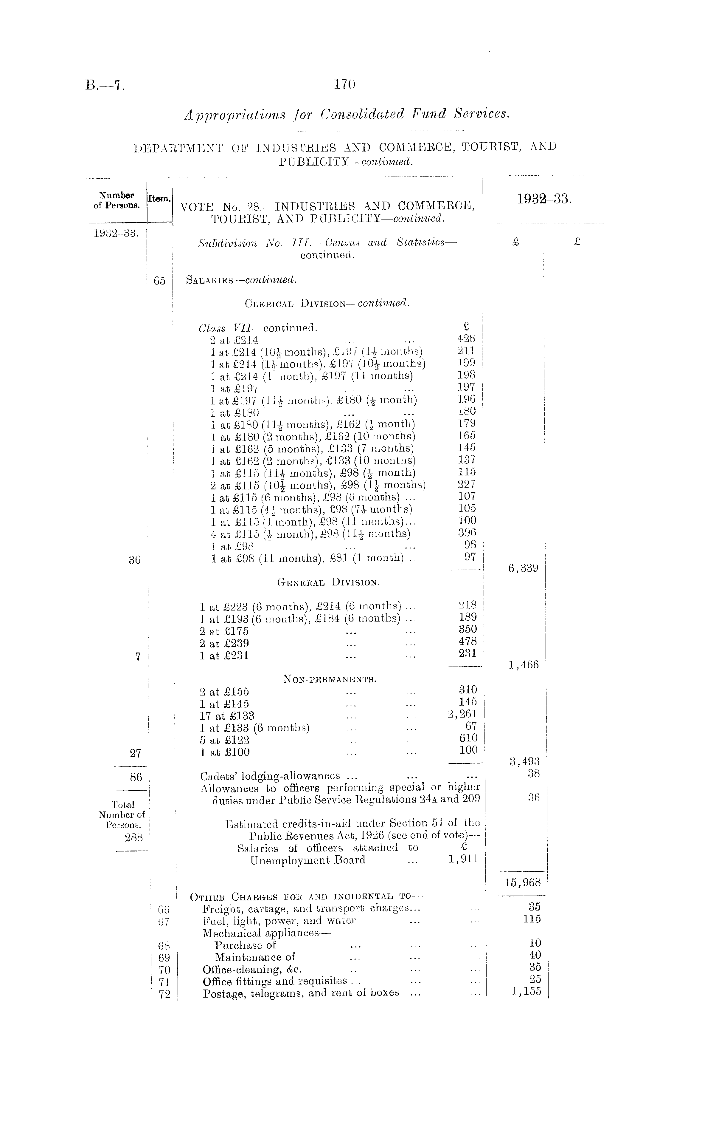 Number r f< ,„ 1Q'-59— of Peraons. ' V OTE No. 28,—INDUSTRIES AND COMMERCE, TOURIST, AND PUBLICITY—continued. 1932-33. ... ■ „ Subdivision No. III. —Census and Statistics — £ £ continued. 65 Salaries—continued. Clerical Division —continued. Class VII —continued. £ 2 at £214 ... ... 428 1 at £214 (10$ months), £197 (1$ months) 211 1 at £214 (1$ months), £197 (10$ months) 199 1 at £214 (1 month), £197 (11 months) 198 1 at £197 ... ••• 197 1 at £197 (11$ months), £180 ($ month) 196 1 at £180 " ... " ... 180 | 1 at £180 (11$ months), £162 ($ month) 179 1 at £180 (2 months), £162 (10 months) 165 1 at £162 (5 months), £133 (7 months) 145 1 at £162 (2 months), £133 (10 months) 137 1 at £115 (11$ months), £98 ($ month) 115 2 at £115 (10$ months), £98 (1$ months) 227 1 at £115 (6 months), £98 (6 months) ... 107 1 at £115 (4$ months), £98 (7$ months) 105 1 at £115 (1 month), £98 (11 months)... 100 4 at £115 ($ month), £98 (11$ months) 396 1 at £98 ..." ... 98 36 1 at £98 (11 months), £81 (1 month)... 97 6,339 General Division. 1 at £223 (6 months), £214 (6 months) ... 218 1 at £193(6 months), £184 (6 months) ... 189 2 at £175 ... 350 2 at £239 ... ... 478 7 1 at £231 ... 231 1,466 Non-permanents. 2 at £155 ... 310 1 at £145 ... 145 17 at £133 ... ■■■ 2,261 1 at £133 (6 months) ... ... 67 5 at £122 ... 610 27 1 at £100 ... 100 3,493 86 Cadets' lodging-allowances ... ... ... 38 — | Allowances to officers performing special or higher Total i duties under Public Service Regulations 24a and 209 36 Number of 1 Persons. | Estimated credits-in-aid under Section 51 of the 288 I Public Revenues Act, 1926 (see end of vote) — Salaries of officers attached to £ Unemployment Board ... 1,911 15,968 Other Charges for and incidental to — 66 | Freight, cartage, and transport charges... ... 35 67 Fuel, light, power, and water ... ... 115 Mechanical appliances — 68 Purchase of ... ••• 10 69 Maintenance of ... 40 70 Office-cleaning, &c. ... ... 35 71 Office fittings and requisites ... ... ... 25 72 Postage, telegrams, and rent of boxes ... ... 1,155