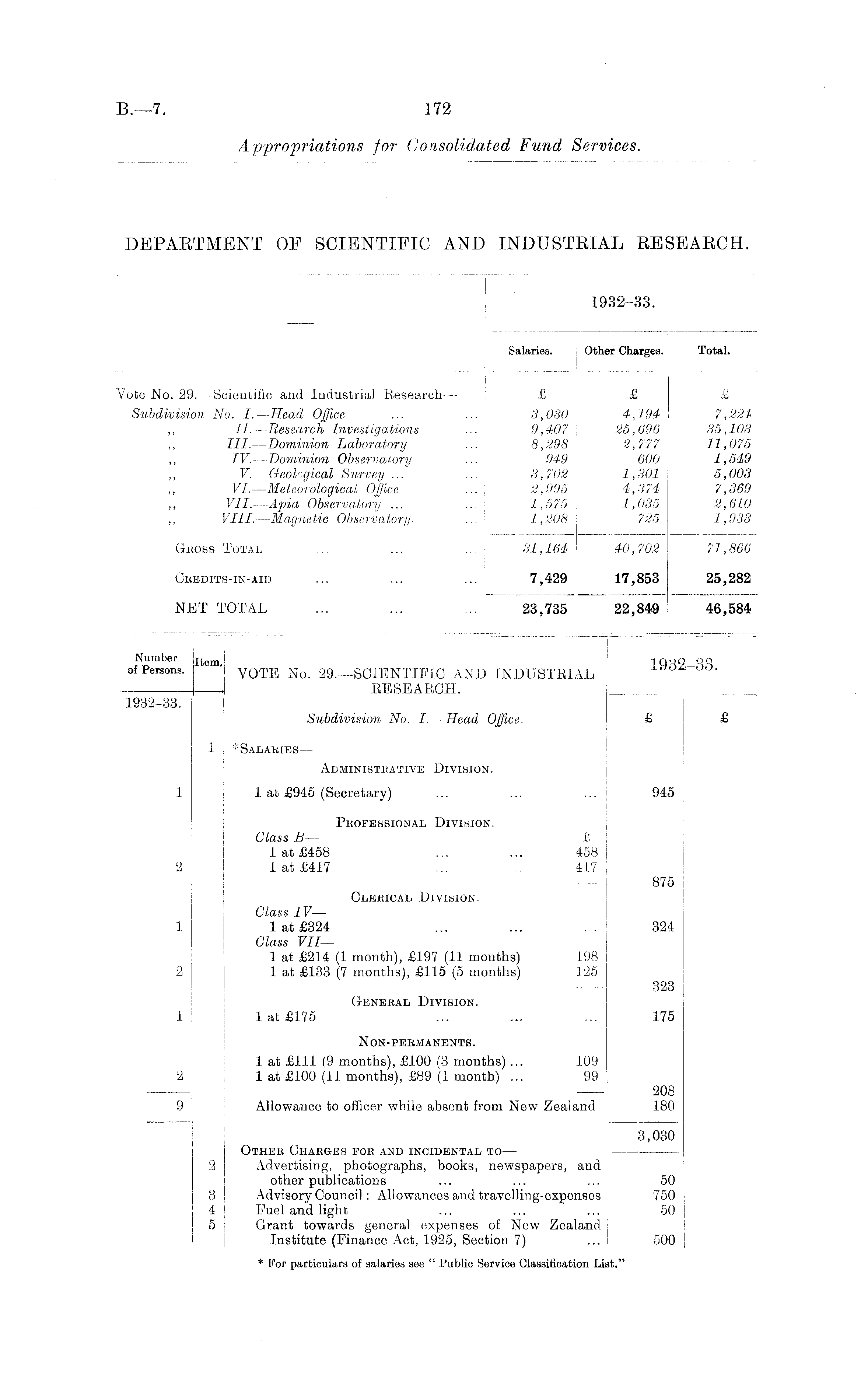1932-33. Salaries. Other Charges. Total. I - Vote No. 29.—Scientific and Industrial Kesearch — £ £ £ Subdivision No. I.—Head Office ... ... 3,030 j 4,194 7,224 ,, II. —Research Investigations ... 9,407 \ 25,696 35,103 ,, III.—Dominion Laboratory ... 8,298 2,777 11,075 ,, IV. —Dominion Observatory ... 949 600 1,549 ,, V.—Geological Survey ... ... 3,702 j 1,301 5,003 ,, VI.—Meteorological Office ... | 2,995 4,374 7,369 ,, VII.—Apia Observatory ... ... ; 1,575 \ 1,035 2,610 ,, VIII.—Magnetic Observatory ...I 1,208 725 1,933 GKOSS Total ... ... ... j 31,164 40,702 71,866 Cbbdits-IN-AID ... ... ... 7,429 17,853 25,282 NET TOTAL ... ... ... | 23,735 22,849 46,584 1 Number Item j 1932-33 of Persons. j VOTE No 29.—SCIENTIFIC AND INDUSTRIAL I RESEARCH. __ 1932-33. I Subdivision No. I.—Head Office. £ £ j 1 * SalariesAdministrative Division. 1 1 at £945 (Secretary) ... ... ... 945 Pbofessional Division. Glass B— £ 1 at £458 ... ... 458 2 1 at £417 ... ... 417 875 Olekical Division. Glass IV— 1 1 at £324 ... ... .. 324 Glass VII— 1 at £214 (1 month), £197 (11 months) 198 2 1 at £133 (7 months), £115 (5 months) 125 323 General Division. 1 1 at £175 ... ... ... 175 N ON-PEKMANENTS. 1 at £111 (9 months), £100 (3 months)... 109 2 1 at £100 (11 months), £89 (1 month) ... 99 208 9 Allowance to officer while absent from New Zealand 180 3,030 Other Charges for and incidental to — 2 Advertising, photographs, books, newspapers, and other publications ... ... ... 50 3 Advisory Council: Allowances and travelling-expenses 750 4 Fuel and light ... ... ... 50 5 Grant towards general expenses of New Zealand Institute (Finance Act, 1925, Section 7) ... 500 * T?or particulars of salaries see " Public Service Classification List."