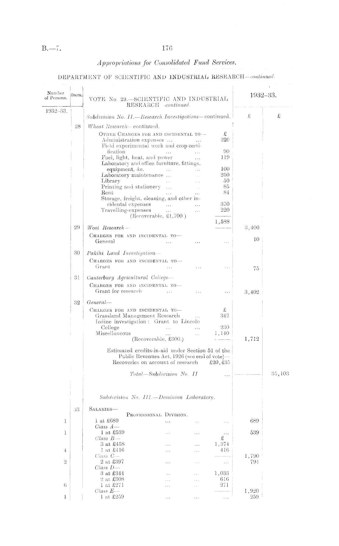 Number lte J 1932-33 of Persons. VOTE No. 29,—SCIENTIFIC AND INDUSTRIAL RESEARCH -continued, . 1932-33. Subdivision No. II. —Research Investigations —continued. £ £ 28 Wheat Research—continued. Other Charges for and incidental to — £ Administration expenses ... ... 220 Field experimental work and crop certification ... ... 90 Fuel, light, heat, and power ... 119 Laboratory and office furniture, fittings, equipment, &c. ... ... 100 Laboratory maintenance ... ... 2-50 Library ... . . 50 Printing and stationery ... 85 Rent ... ... 84 Storage, freight, cleauing, and other incidental expenses ... ... 370 Travelling-expenses ... ... 220 (Recoverable, £1,700.) 1,588 29 Woot Research — 3,400 Charges for and incidental to — General ... ... ... 30 Pakihi Land Investigation — Charges for and incidental to — Grant ... ... ... \ 31 Canterbury Agricultural College — Charges for and incidental to — Grant for research ... ... ... 3 402 32 General— Charges for and incidental to — £ Grassland Management Research ... 342 Iodine investigation : Grant to Lincoln College ... ... 230 Miscellaneous ... ... 1,140 (Recoverable, £300.) 1,712 Estimated credits-in-aid under Section 51 of the Public Revenues Act, 1926 (see end of vote) — Recoveries on account of research £20,435 Total—Subdivision No. II ... 35,103 -1 ' ' Subdivision No. III.—Dominion Laboratory. 33 Salaries— Professional Division. 1 1 at £689 ... ... ... 689 Gtass A-— 1 1 at £539 ... ... ... 539 Class B— £ 3 at £458 ... ... 1,374 4 1 at £416 ... ... 416 Class C — 1,790 j 2 2 at £397 ... ... ... 794 Class D — 3 at £344 ... ... 1,033 2 at £308 ... ... 616 6 1 at £271 ... ... 271 Class E— 1,920 1 I 1 at £259 ... .... ... 259