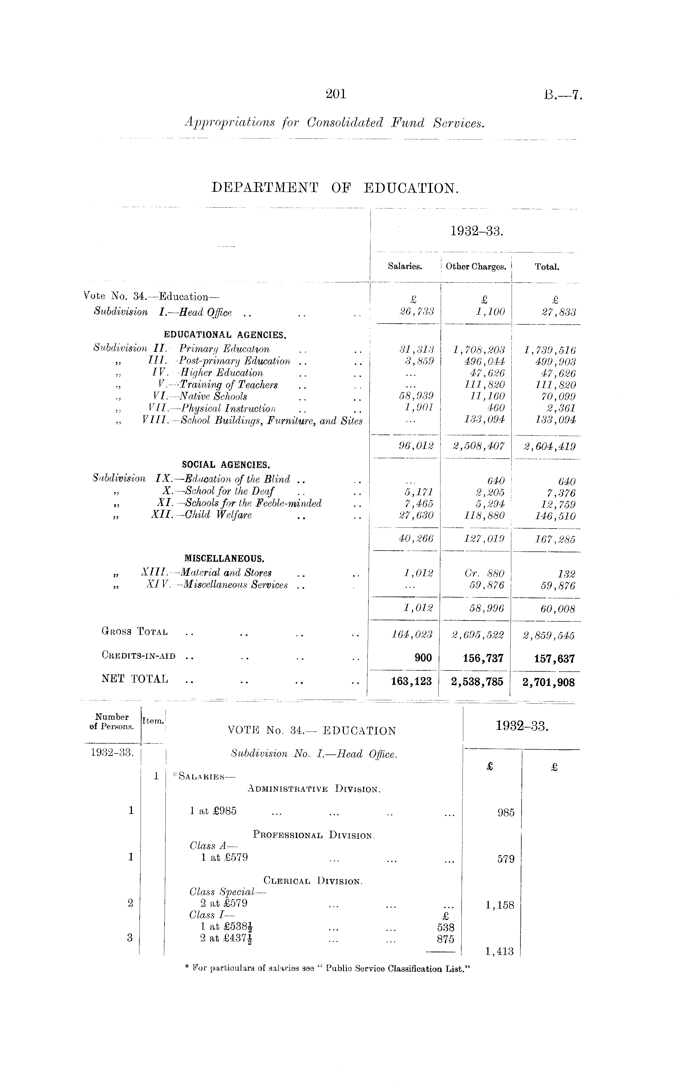 1932-33. Salaries. Other Charges. I Total. Vote No. 34. —Education— £ £ £ Subdivision I.—Head Office .. .. .. 26,733 1,100 27,833 EDUCATIONAL AGENCIES. Subdivision II,- -Primary Education .. .. 81,313 1,708,203 1,739,516 „ III. -Post-primary Education .. .. 3,859 496,044 499,903 „ IV. Higher Education .. .. ... 47,626 47,626 „ V.—Training of Teachers .. .. ... 111,820 111,820 ,, VI.—Native Schools .. .. 58,939 11,160 70,099 ,, VII.—Physical Instruction .. .. 1,901 460 2,361 ,, VIII. —School Buildings, Furniture, and Sites ■■■ 133,094 133,094 96,012 2,508,407 2,604,419 SOCIAL AGENCIES. Subdivision IX.—Education of the Blind .. .. ... 640 640 „ X,— School for the Deaf .. .. 5,171 2,205 7,376 „ XI. —Schools for the Feeble-minded .. 7,465 5,294 12,759 XII.-—Child Welfare .. .. 27,630 118,880 146,510 40,266 127,019 167,285 MISCELLANEOUS. „ XIII.—Material and Stores .. .. 1,012 Gr. 880 132 „ XIV.—Miscellaneous Services .. . ... 59,876 59,876 1,012 58,996 60,008 GROSS Total .. .. .. .. 164,023 2,695,522 2,859,545 Cbedits-IN-AID .. .. .. .. 900 156,737 157,637 NET TOTAL .. .. .. .. 163,123 2,538,785 2,701,908 Number it em ! of Persons. ' VOTE No. 34,— EDUCATION 1932-33. 1932-33. Subdivision No. I. —Head Office. & £ 1 '"Salaries— Administrative Division. 1 1 at £985 ... ... .. ... 985 Professional Division, Glass A— 1 1 at £579 ... ... ... 579 Clerical Division. Glass Special— 2 2 at £579 ... ... ... 1,158 Glass I— £ 1 at £538J ... ... 538 3 2 at £437| ... ... 875 1,413 * For particulars of salaries see " Public Service Classification List."