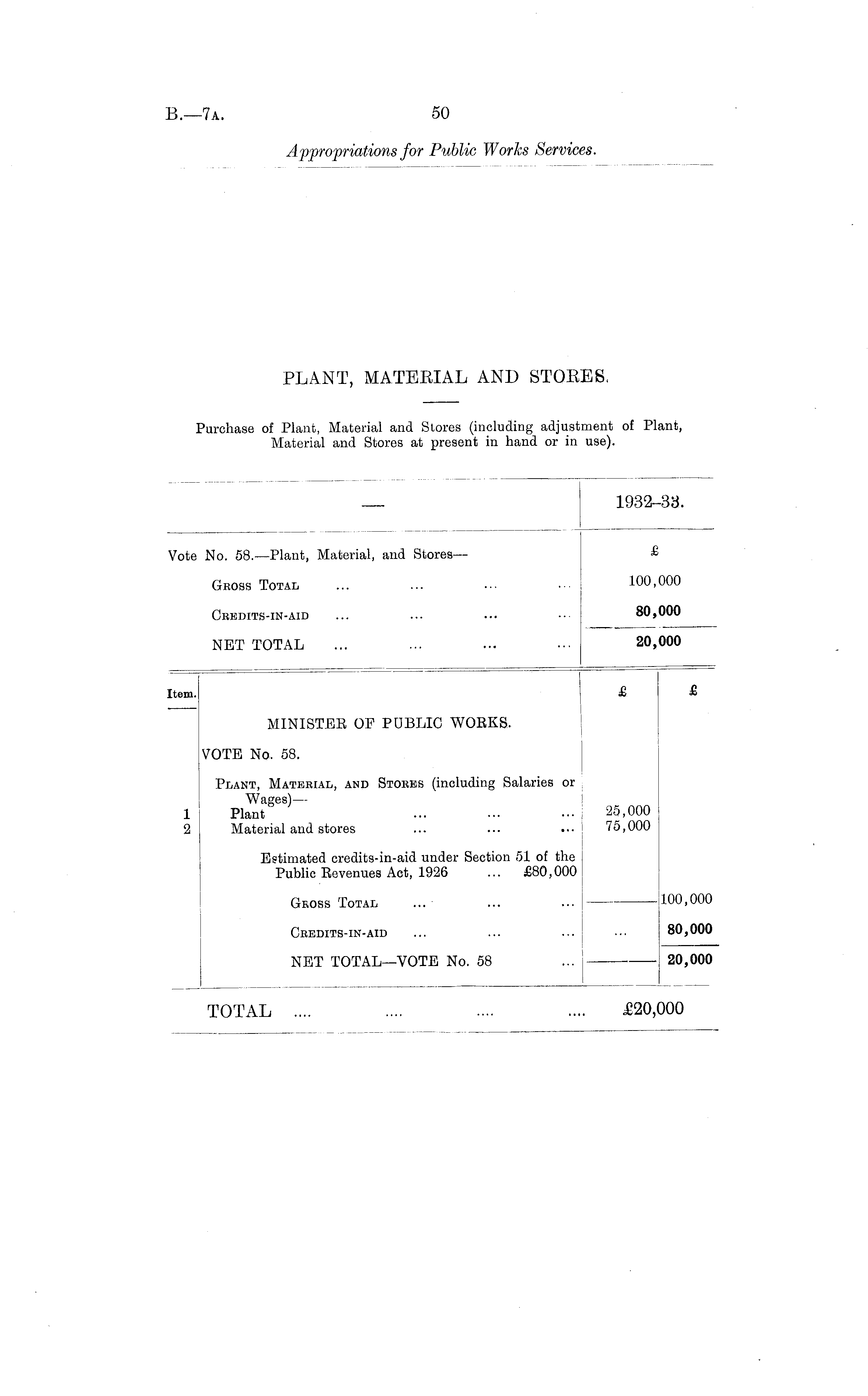 1932-33. Vote No. 58.—Plant, Material, and Stores — £ Gross Total ... ... ... . 100,000 Cbbdits-in-aid ... ... ... ••■ 80,000 NET TOTAL ... ... ... • •• 20,000 Item. & & MINISTEB OP PUBLIC WORKS. VOTE No. 58. Plant, Matbbial, and Stokes (including Salaries or Wages)— 1 Plant ... ... - 25,000 2 Material and stores ... ... ••• 75,000 Estimated credits-in-aid under Section 51 of the Public Revenues Act, 1926 ... £80,000 Gross Total ... ... ... 100,000 Ceedits-in-aid ... ... ... ••• 80,000 NET TOTAL—VOTE No. 58 ... 20,000 TOTAL .... .... .... .... £20,000