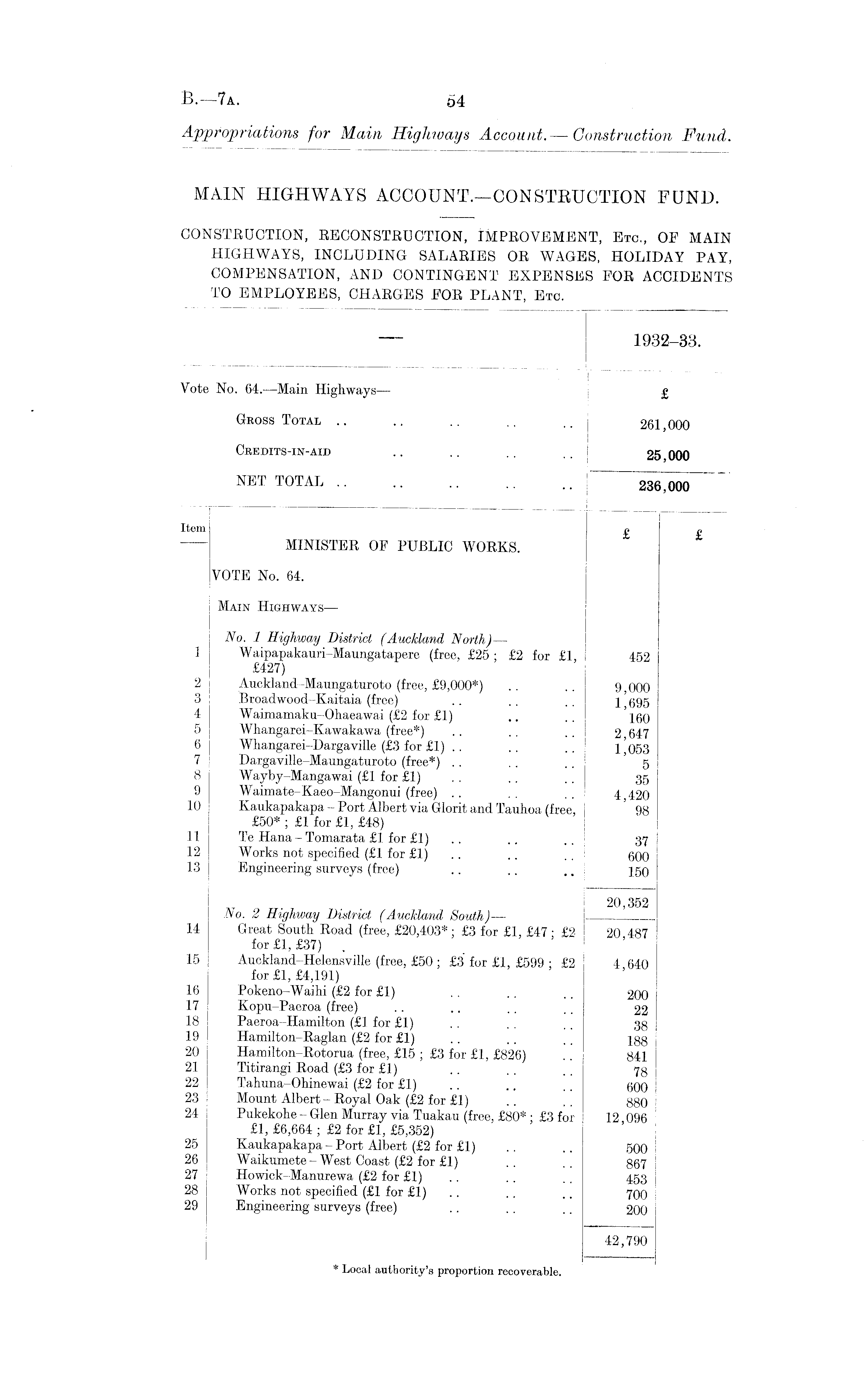 1932-33. Vote No. 64.—Main Highways— £ Geoss Total 261,000 Credits-in-aid .. .. .. 25 000 NET TOTAL iseiOOT j Item £ „ MINISTER OF PUBLIC WORKS. VOTE No. 64. Main Highways— No. 1 Highway District (Auckland North) — Waipapakauri-Maungatapere (free, £25 ; £2 for £1 452 £427) Auckland-Maungaturoto (free, £9,000*) .. .. 9,000 3 Broadwood-Kaitaia (free) .. . . . . \' 695 4 Waimamaku-Ohaeawai (£2 for £1) .. .. 'ifiO 5 Whangarei-Kawakawa (free*) . . . . . . 2 647 6 Whangarei-Dargaville (£3 for £1) .. .. .. l^053 7 Dargaville-Maungaturoto (free*) . . . . ' 5 8 Wayby-Mangawai (£1 for £1) . . 35 Waimate-Kaeo-Mangonui (free) .. .. 4,420 10 Kaukapakapa- Port Albert via Glorit and Tauhoa (free j ' 98 £50* ; £1 for £1, £48) 11 Te Hana - Tomarata £1 for £1) .. .. .. 37 12 Works not specified (£1 for £1) . . 600 13 Engineering surveys (free) .. .. .. 150 20,352 No. 2 Highway District (Auckland South) — 14 Great South Road (free, £20,403*; £3 for £1, £47 ; £2 I 20 487 for £1, £37) 15 Auokland-Helensville (free, £50 ; £3 for £1, £599 ; £2 4 640 for £1, £4,191) 16 Pokeno-Waihi (£2 for £1) .. .. .. 200 17 Kopu-Paeroa (free) .. .. . . 22 18 Paeroa-Hamilton (£1 for £1) . . . . 38 19 Hamilton-Raglan (£2 for £1) . . . . jgg 20 Hamilton-Rotorua (free, £15 ; £3 for £1, £826) 841 21 Titirangi Road (£3 for £1) .... 78 22 Tahuna-Ohinewai (£2 for £1) .. .. 600 23 Mount Albert - Royal Oak (£2 for £1) 880 24 Pukekohe - Glen Murray via Tuakau (free, £80* ; £3 for 12 096 £1, £6,664 ; £2 for £1, £5,352) 25 Kaukapakapa-Port Albert (£2 for £1) .. .. 500 26 Waikumete-West Coast (£2 for £1) 867 27 Howiok-Manurewa (£2 for £1) . . . . 453 28 Works not specified (£1 for £1) .. .. ., 700 29 Engineering surveys (free) .. . . 200 42,790 * Local authority's proportion recoverable.
