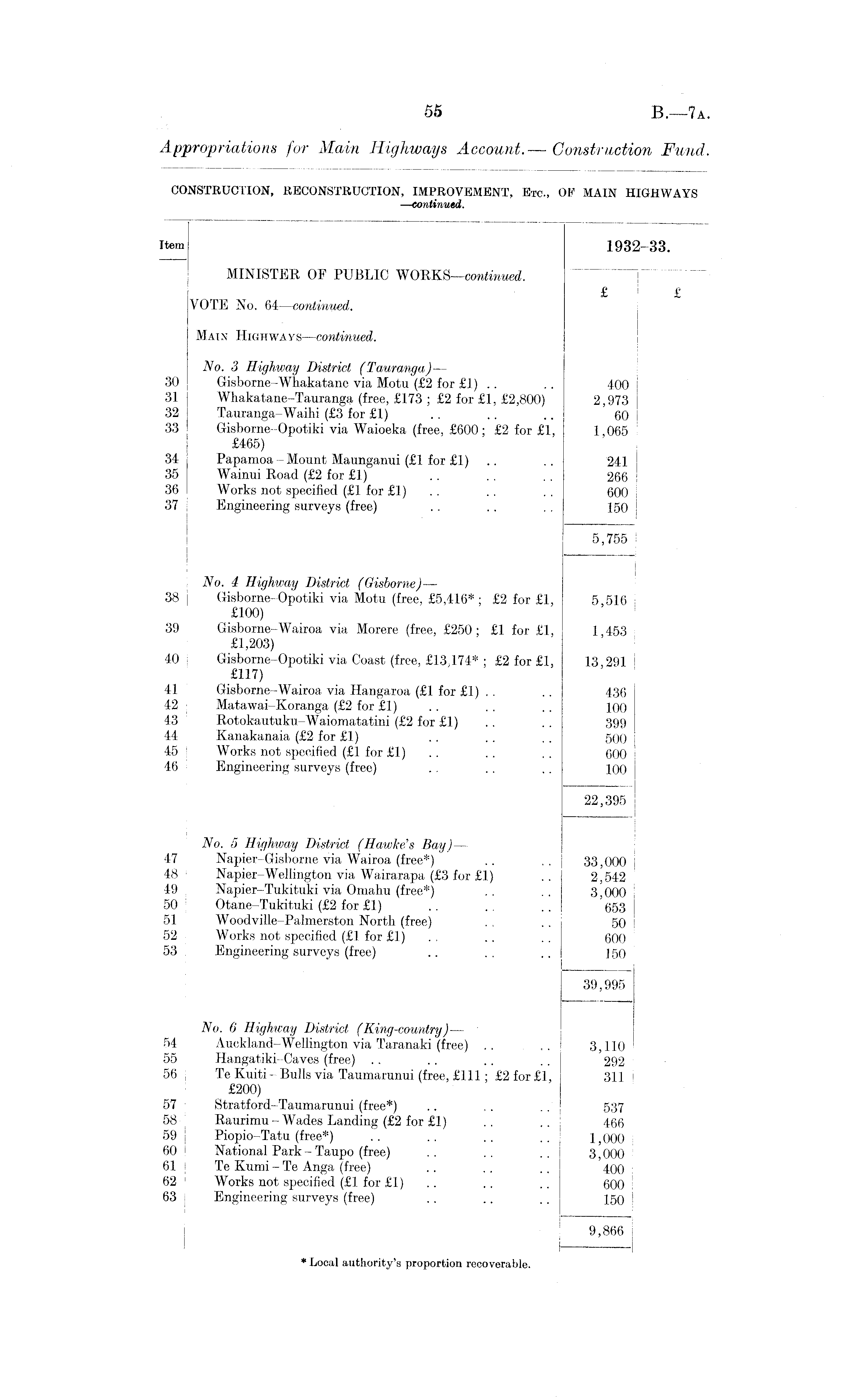 Item 1932-33. MINISTER OF PUBLIC WOEKS— continued. £ £ VOTE No. 6i—continued. Main Highways— continued. No. 3 Highway District (Tauranga) — 30 Gisborne-Whakatane via Motu (£2 for £1) .. . . 400 31 Whakatane-Tauranga (free, £173 ; £2 for £1, £2,800) 2,973 32 Tauranga-Waihi (£3 for £1) . . .. .. 60 33 Gisborne-Opotiki via Waioeka (free, £600; £2 for £1, 1 065 £465) 34 Papamoa - Mount Maunganui (£1 for £1) .. .. 241 35 Wainui Road (£2 for £1) .. . . . . 266 36 Works not specified (£1 for £1) . . . . . . 600 37 Engineering surveys (free) . . .. . . 150 5,755 No. 4 Highway District (Gisborne) — 38 Gisborne-Opotiki via Motu (free, £5,416* ; £2 for £1, 5 516 £100) 39 ' Gisborne-Wairoa via Morere (free, £250 ; £1 for £1, 1 453 £1,203) 40! Gisborne-Opotiki via Coast (free, £13 174* ; £2 for £1, 13 291 £117) 41 Gisborne-Wairoa via Hangaroa (£1 for £1) . . . . 436 42 J Matawai-Koranga (£2 for £1) .. . . . . 100 43 Rotokautuku-Waiomatatini (£2 for £1) . . .. 399 44 Kanakanaia (£2 for £1) .. .. .. 500 45 Works not specified (£1 for £1) .. .. .. 600 46 J Engineering surveys (free) .. . . ,. 100 22,395 No. 5 Highway District (Hawke's Bay) — 47 ! Napier-Gisborne via Wairoa (free*) .. 33,000 48 Napier-Wellington via Wairarapa (£3 for £1) .. 2,'542 ' 49 ; Napier-Tukituki via Omahu (free*) . . .. 3 ; 000 50 J Otane-Tukituki (£2 for £1) .. '653 51 Woodville-Palmerston North (free) . . . . 50 52 Works not specified (£1 for £1) . . .. .. 600 53 I Engineering surveys (free) .. . . 150 39,995 No. 6 Highway District (King-country) — 54 S Auckland-Wellington via Taranaki (free) .. 3,110 55 Hangatiki-Caves (free) . . . . .. 292 56 I Te Kuiti - Bulls via Taumarunui (free, £111 • £2 for £1, 311 £200) 57 ( Stratford-Taumarunui (free*) .. ,. .. 537 58 1 Raurimu-Wades Landing (£2 for £1) .. .. 466 59 Piopio-Tatu (free*) .. .. .. 1,000 60! National Park - Taupo (free) .. 3,'000 61 i Te Kumi - Te Anga (free) . . .. 400 62 ! Works not specified (£1 for £1) .. . . 600 63 I Engineering surveys (free) . . .. .. 150 i i 9,866 ♦ Local authority's proportion recoverable.