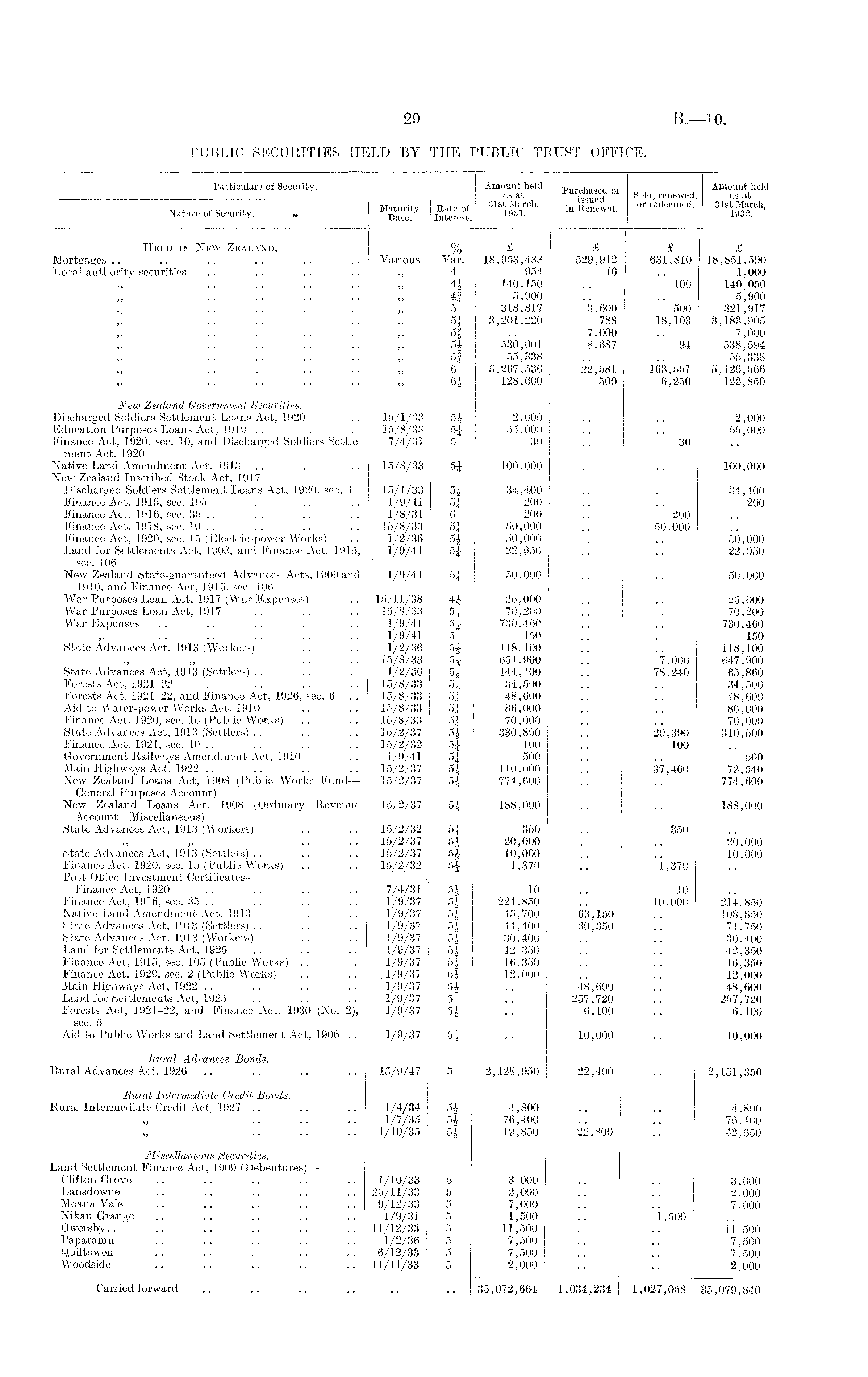 Particulars of Security. Amount held ū n . 0 i, aon j Amount held : as at Sff Sold, renewed, as at Nature of Security. . | M « Eenewal. or redeemed. 31st March, Held in New Zealand. % £ £ £ £ Mortgages.. .. .. .. .. .. Various Var. 18 „953,488 529,912 631,810 18,851,590 Local authority securities .. .. .. .. „ 4 954 46 .. 1,000 4| 140,150 .. 100 140,050 4f 5,900 .. .. 5,900 5 318,817 3,600 500 321,917 . . | „ 5J 3,201,220 788 18,103 3,183,905 .. I 5f .. 7,000 .. 7,000 .. j „ 5i 530,001 8,687 94 538,594 .... .. .. „ 5| 55,338 .. .. 55,338 .. I „ 6 5,267,536 22,581 163,551 5,126,566 .. j 128,600 500 6,250 122,850 New Zealand Government Securities. Discharged Soldiers Settlement Loans Act, 1920 .. ; 15/1/33 5J 2,000 .. .. 2,000 Education Purposes Loans Act, 1919 .. .. .. 15/8/33 5|- | 55,000 i .. .. 55,000 Finance Act, 1920, sec. 10, and Discharged Soldiers Settle- j 7/4/31 5 30 . . 30 ment Act, 1920 Native Land Amendment Act, 1913 .. .. .. 15/8/33 5,} 100,000 .. .. 100,000 New Zealand Inscribed Stock Act, 1917— Discharged Soldiers Settlement Loans Act, 1920, sec. 4 15/1/33 54 34,400 .. .. 34,400 Finance Act, 1915, sec. 105 .. . . .. j 1/9/41 5J 200 .. .. 200 Finance Act, 1916, sec. 35 .. .. .. .. 1/8/31 6 200 .. 200 Finance Act, 1918, sec. 10 .. .. .. .. 15/8/33 5J 50,000 .. j 50,000 Finance Act, 1920, sec. 15 (Electric-power Works) .. 1/2/36 5| 50,000 .. i .. 50,000 Land for Settlements Act, 1908, and Finance Act, 1915, 1/9/41 5} 22,950 .. ! .. 22,950 sec. 106 New Zealand State-guaranteed Advances Acts, 1909 and 1/9/41 5} 50,000 .. .. 50,000 1910, and Finance Act, 1915, sec. 106 I War Purposes Loan Act, 1917 (War Expenses) .. 15/11/38 4| 25,000 , .. | .. 25,000 War Purposes Loan Act, 1917 .. .. .. 15/8/33 5$ 70,200 ; .. j .. 70,200 War Expenses .. .. .. .. .. 1/9/41 5£ 730,460 .. .. 730,460 1/9/41 5 150 .. | .. 150 State Advances Act, 1913 (Workers) .. .. 1/2/36 5J 118,100 .. : .. 118,100 .... 15/8/33 5J 654,900! .. ; 7,000 647,900 ■State Advances Act, 1913 (Settlers) .. .. .. 1/2/36 5f 144,100 j .. 78,240 65,860 Forests Act, 1921-22 .. .. .. .. 15/8/33 5J 34,500 .. .. 34,500 Forests Act, 1921-22, and Finance Act, 1926, sec. 6 .. 15/8/33 5J 48,600 .. .. 48,600 Aid to Water-power Works Act, 1910 .. .. 15/8/33 5J 86,000 .. .. 86,000 Finance Act, 1920, sec. 15 (Public Works) .. .. 15/8/33 5J 70,000 .. .. 70,000 State Advances Act, 1913 (Settlers) .. .. .. 15/2/37 5| 330,890 .. 20,390 310,500 Finance Act, 1921, sec. 10 .. .. .. .. 15/2/32 5J 100 .. 100 Government Railways Amendment Act, 1910 .. 1/9/41 5J 500 .. .. 500 Main Highways Act, 1922 .. .. .. .. 15/2/37 5J 110,000 .. 37,460 72,540 New Zealand Loans Act, 1908 (Public Works Fund — 15/2/37 5J 774,600 .. .. 774,600 General Purposes Account) New Zealand Loans Act, 1908 (Ordinary Revenue 15/2/37 5J 188,000 .. .. 188,000 Account—Miscellan eous) State Advances Act, 1913 (Workers) .. .. 15/2/32 5J 350 .. 350 .... 15/2/37 5J 20,000 .. .. 20,000 State Advances Act, 1913 (Settlers) .. .. .. 15/2/37 5| 10,000 .. .. 10,000 Finance Act, 1920, sec. 15 (Public Works) .. .. 15/2/32 5| 1,370 .. 1,370 Post Office Investment Certificates — Finance Act, 1920 .. .. .. .. 7/4/31 5J 10 .. 10 Finance Act, 1916, sec. 35 .. .. .. .. 1/9/37 5|- 224,850 .. 10,000 214,850 Native Land Amendment Act, 1913 .. .. 1/9/37 5J 45,700 63,150 .. 108,850 State Advances Act, 1913 (Settlers) . . .. .. 1/9/37 5J 44,400 30,350 .. 74,750 State Advances Act, 1913 (Workers) .. .. 1/9/37 5J 30,400 .. .. 30,400 Land for Settlements Act, 1925 .. .. .. 1/9/37 | 5J 42,350 .. .. 42,350 Finance Act, 1915., sec. 105 (Public Works) .. .. 1/9/37 5J 16,350 .. .. 16,350 Finance Act, 1929, sec. 2 (Public Works) .. .. 1/9/37 5J 12,000 .. .. 12,000 Main Highways Act, 1922 .. .. .. .. 1/9/37 5| .. 48,600 .. 48,600 Land for Settlements Act, 1925 .. .. .. 1/9/37 5 .. 257,720 .. 257,720 Forests Act, 1921-22, and Finance Act, 1930 (No. 2), 1/9/37 5J .. 6,100 .. 6,100 sec. 5 Aid to Public Works and Land Settlement Act, 1906 .. 1/9/37 5J .. 10,000 .. 10,000 Rural Advances Bonds. Rural Advances Act, 1926 .. .. .. .. 15/9/47 5 2,128,950 22,400 .. 2,151,350 Rural Intermediate Credit Bonds. Rural Intermediate Credit Act, 1927 .. .. .. 1/4/34 5J 4,800 .. .. 4,800 1/7/35 5| 76,400 .. .. 76,400 1/10/35 5J 19,850 22,800 .. 42,650 Miscellaneous Securities. Land Settlement Finance Act, 1909 (Debentures) — Clifton Grove .. .. .. .. .. 1/10/33 5 3,000 .. .. 3,000 Lansdowne .. .. .. .. .. 25/11/33 5 2,000 .. .. 2,000 Moana Vale .. .. .. .. .. 9/12/33 5 7,000 .. .. 7,000 Nikau Grange .. .. .. .. .. 1/9/31 5 1,500 .. 1,500 Owersby.. .. .. .. .. .. 11/12/33 ! 5 11,500 .. .. 11,500 Paparamu .. .. .. .. .. 1/2/36 1 5 7,500 .. .. 7,500 Quiltowen .. ,. .. .. .. 6/12/33 5 7,500 .. ! .. 7,500 Woodside .. .. .. .. .. 11/11/33 5' 2,000 .. .. 2,000 t Carried forward .. .. .. .. .. | .. 35,072,664 1,034,234 j 1,027,058 35,079,840