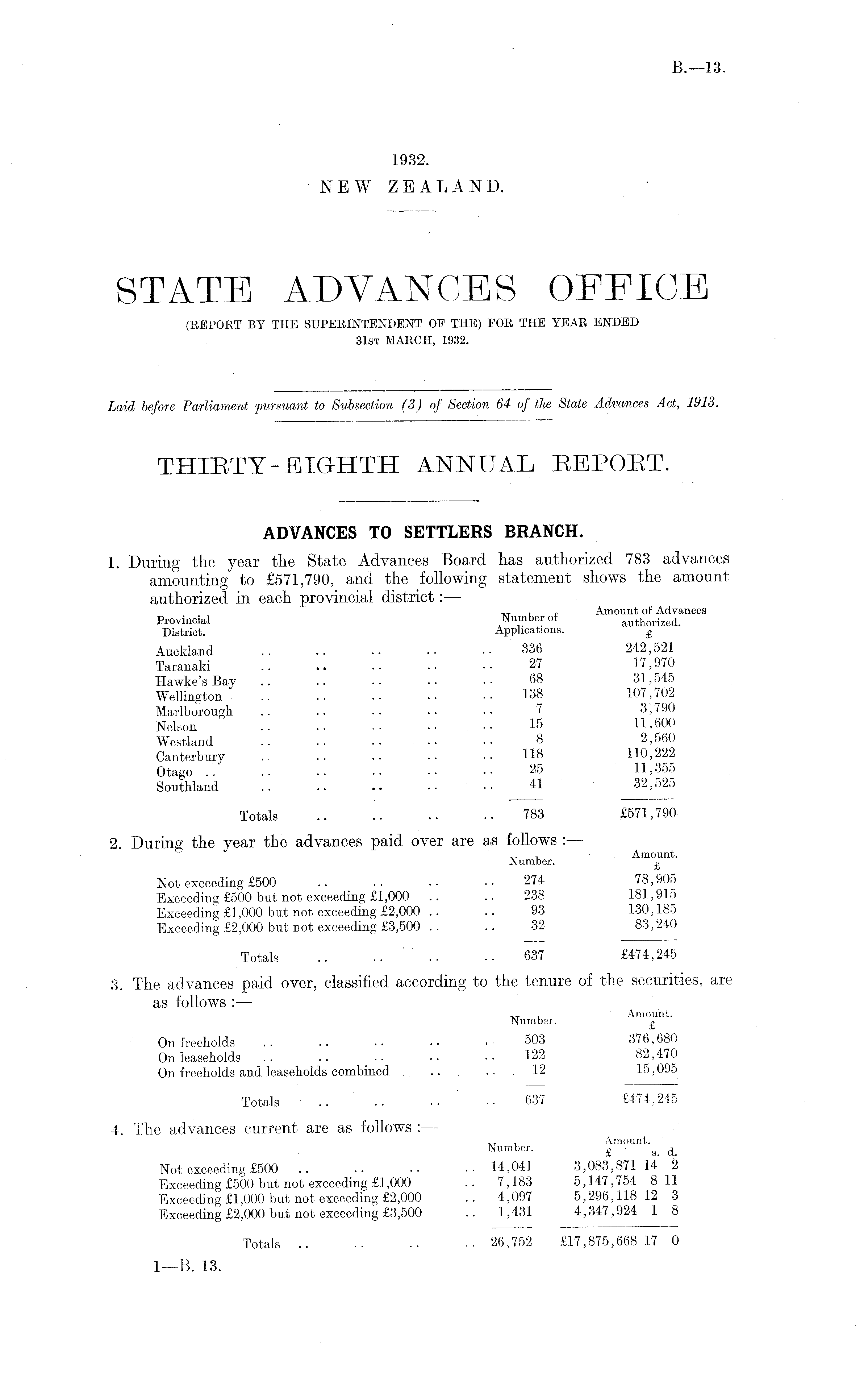 ADVANCES TO SETTLERS BRANCH. 1. During the year the State Advances Board has authorized 783 advances amounting to £571,790, and the following statement shows the amount authorized in each provincial district — „ , Amount of Advances Provincial A Nu , mb ® r of authorized. District. Applications. £ Auckland 336 242,521 Taranaki .. •• •• •• •• 27 17,970 Hawke's Bay .. .. . • • • • ■ 68 31,545 Wellington .. .. •• •• 138 107,702 Marlborough .. .. •• •• •• 7 3,790 Nelson .. •• 15 11,600 Westland .. .. .. •• 8 2,560 Canterbury .. .. .. •• 118 110,222 Otago .. 25 11,355 Southland .. .. . • • ■ • ■ 41 32, 525 Totals 783 £571,790 2. During the year the advances paid over are as follows : — , T , Amount. Number. £ Not exceeding £500 .. .. •• •• 274 78,905 Exceeding £500 but not exceeding £1,000 .. .. 238 181,915 Exceeding £1,000 but not exceeding £2,000 .. .. 93 130,185 Exceeding £2,000 but not exceeding £3,500 .. .. 32 83,240 Totals .. .. .. 637 £474,245 3. The advances paid over, classified according to the tenure of the securities, are as follows :— „ , Amount. Number. £ On freeholds .. .. •• 503 376,680 On leaseholds .. .. •• 122 82,470 On freeholds and leaseholds combined .. .. 12 15,095 Totals ■ 637 £474,245 4. The advances current are as follows : — ~ , Amount. JN umber. £ g Not exceeding £500 .. .. .. •• 14,041 3,083,871 14 2 Exceeding £500 but not exceeding £1,000 .. 7,183 5,147,754 811 Exceeding £1,000 but not exceeding £2,000 .. 4,097 5,296,118 12 3 Exceeding £2,000 but not exceeding £3,500 .. 1,431 4,347,924 1 8 Totals 26,752 £17,875,668 17 0