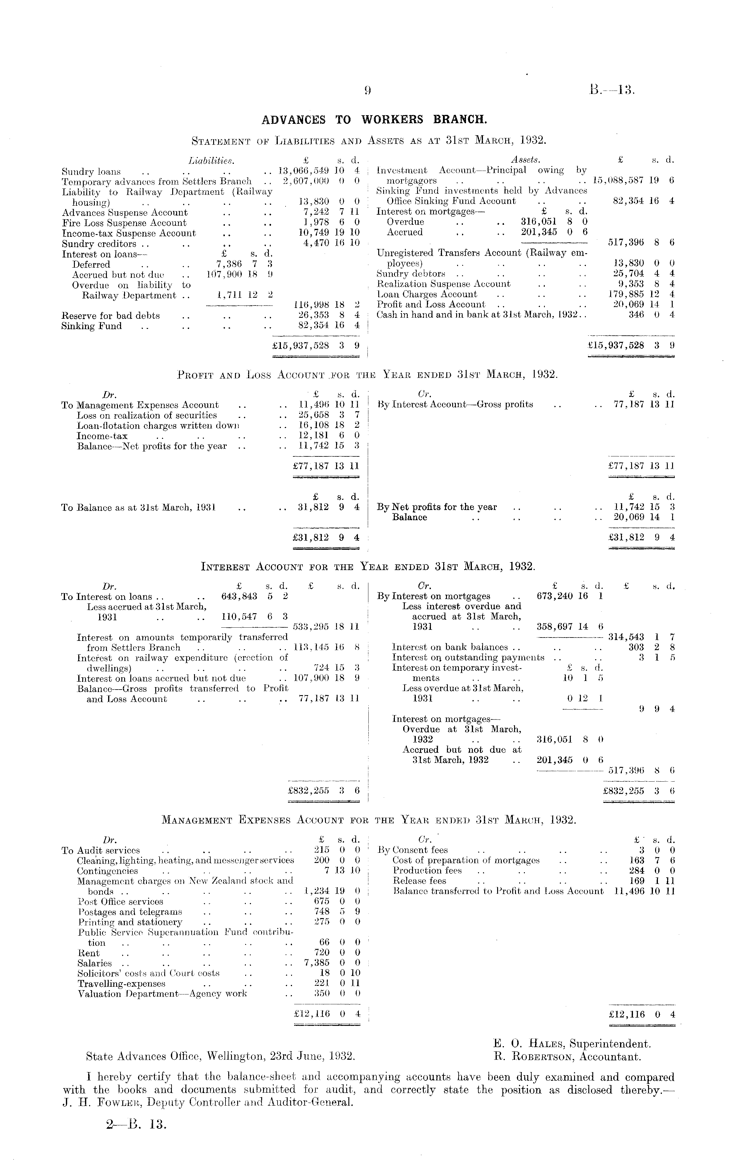 ADVANCES TO WORKERS BRANCH. Statement of Liabilities and Assets as at 31st March, 1932. Liabilities. £ s. d. Assets. £ s. d. Sundry loans .. .. .. .. .13,066,549 10 4 • Investment Account—Principal owing by Temporary advances from Settlers Branch .. 2,607,000 0 0 mortgagors .. .. .. .. 15,088,587 19 6 Liability to Railway Department (Railway Sinking Fund investments held by Advances housing) .. .. .. .. 13,830 0 0 Office Sinking Fund Account .. .. 82,354 16 4 Advances Suspense Account .. .. 7,242 711 Interest on mortgages— £ s. d. Fire Loss Suspense Account .. .. 1,978 6 0 Overdue .. .. 316,051 8 0 Income-tax Suspense Account .. .. 10,749 19 10 Accrued .. .. 201,345 0 6 Sundry creditors .. .. .. .. 4,470 16 10 — — 517,396 8 6 Interest on loans — £ s. d. Unregistered Transfers Account (Railway emDeferred .. .. 7,386 7 3 ployees) .. .. .. .. 13,830 0 0 Accrued but not due .. 107,900 18 9 Sundry debtors .. .. .. .. 25,704 4 4 Overdue on liability to Realization Suspense Account .. . . 9,353 8 4 Railway Department .. 1,711 12 2 Loan Charges Account .. .. .. 179,885 12 4 116,998 18 2 Profit and Loss Account .. .. .. 20,069 14 I Reserve for bad debts .. .. .. 26,353 8 4 Cash in hand and in bank at 31st March, 1932. . 346 0 4 Sinking Fund .. .. .. .. 82,354 16 4 £15,937,528 3 9 £15,937,528 3 9 Profit and Loss Account .for the Year ended 31st March, 1932. Dr. £ s. d. Gr. £ s. d. To Management Expenses Account .. .. 11,496 10 11 By Interest Account —Gross profits .. .. 77,187 13 11 Loss on realization of securities .. .. 25,658 3 7 Loan-flotation charges written down .. 16,108 18 2 Income-tax .. .. .. •• 12,181 6 0 Balance —Net profits for the year .. .. 11,742 15 3 £77,187 13 11 £77,187 13 II £ s. d. £ s. d. To Balance as at 31st March, 1931 .. .. 31,812 9 4 By Net profits for the year .. .. .. 11,742 15 3 Balance .. .. .. .. 20,069 14 1 £31,812 9 4 £31,812 9 4 Interest Account for the Year ended 31st March, 1932. Dr. £ s. d. £ s. d. Gr. £ s. d. £ s. d. To Interest on loans .. .. 643,843 5 2 By Interest on mortgages .. 673,240 16 1 Less accrued at 31st March, Less interest overdue and 1931 .. .. 110,547 6 3 accrued at 31st March, 533,295 18 11 1931 .. .. 358,697 14 6 Interest on amounts temporarily transferred 314,543 1 7 from Settlers Branch .. .. .. 113,145 16 8 Interest on bank balances .. .. .. 303 2 8 Interest on railway expenditure (erection of Interest on outstanding payments .. . . 3 15 dwellings) .. .. .. .. 724 15 3 Interest on temporary invest- £ s. d. Interest on loans accrued but not due .. 107,900 18 9 ments .. .. 10 1 5 Balance —Gross profits transferred to Profit Less overdue at 31st March, and Loss Account .. .. .. 77,187 13 11 1931 .. .. 0 12 1 9 9 4 Interest on mortgages— Overdue at 3.lst March, 1932 .. . . 316,051 8 0 Accrued but not due at 31st March, 1932 .. 201,345 0 6 517,396 8 6 £832,255 3 6 £832,255 3 6 Management Expenses Account for the Year ended 31st March, 1932. Dr. £ s. d. j Gr. £ ' s. d. To Audit services .. .. .. .. 215 0 0 1 By Consent fees . . .. .. .. 3 0 0 Cleaning, lighting, heating, and messenger services 200 0 0 Cost of preparation of mortgages .. .. 163 7 6 Contingencies .. . . .. .. 713 10 Production fees .. . . .. . . 284 0 0 Management charges on New Zealand stock and ! Release fees .. .. . . .. 169 I 11 bonds .. .. .. .. ■■ 1,234 19 0 j Balance transferred to Profit and Loss Account 11,496 10 11 Post Office services .. .. .. 675 0 0 Postages and telegrams .. .. .. 748 5 9 Printing and stationery .. .. .. 275 0 0 Public Service Superannuation Fund contribution .. .. . ■ . . .. 66 0 0 Rent .. .. .. .. .. 720 0 0 Salaries .. .. . . .. 7,385 0 0 Solicitors' costs and Court costs .. . . 18 0 10 Travelling-expenses .. .. .. 221 0 11 Valuation Department—Agency work .. 350 0 0 £12,116 0 4 ■ £12,116 0 4 E. 0. Hales, Superintendent. State Advances Office, Wellington, 23rd June, 1932. R. Robertson, Accountant. I hereby certify that the balance-sheet and accompanying accounts have been duly examined and compared with the books and documents submitted for audit, and correctly state the position as disclosed thereby.—• J. H. Fowler, Deputy Controller and Auditor-General.