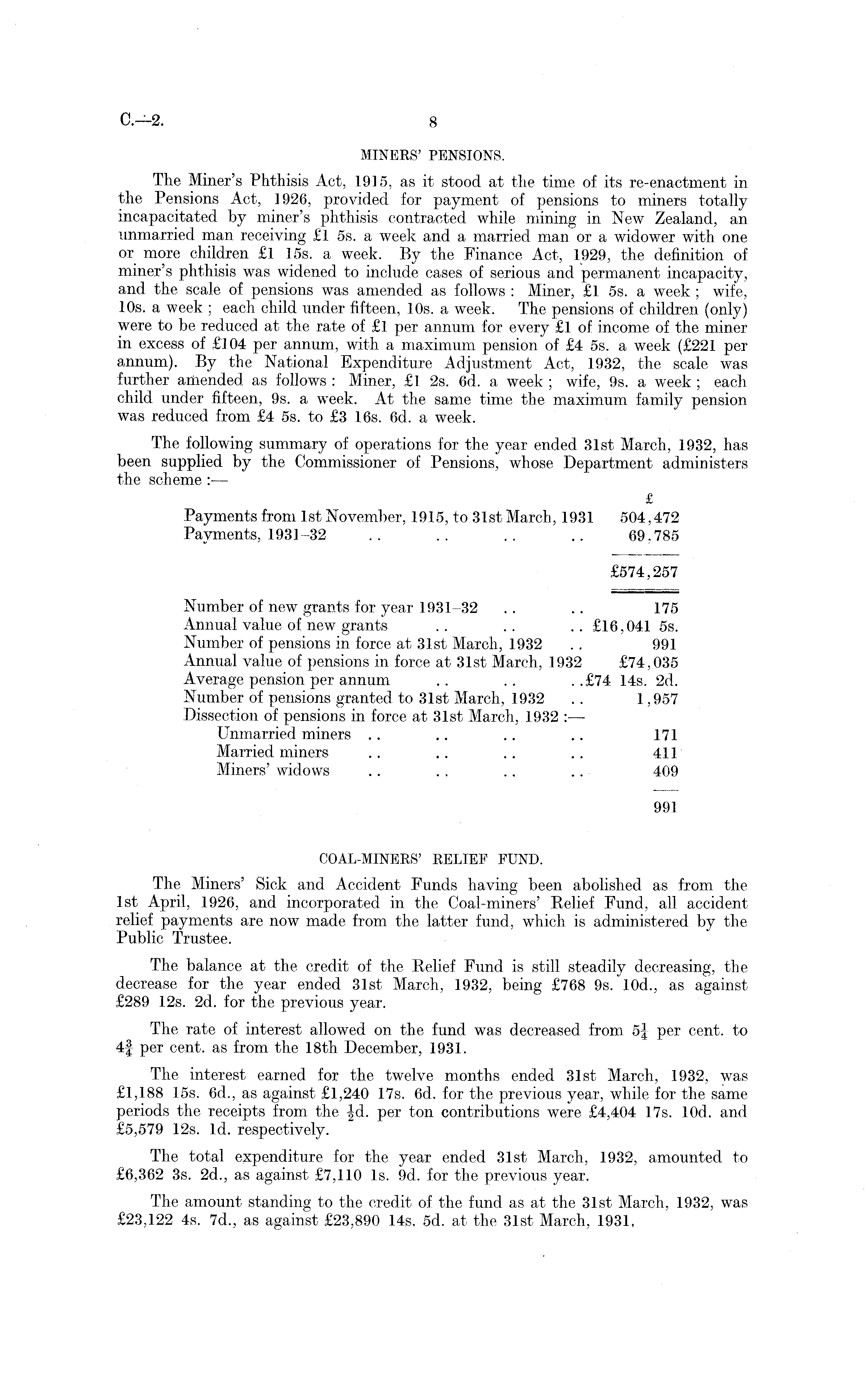 MINERS' PENSIONS. The Miner's Phthisis Act, 1915, as it stood at the time of its re-enactment in the Pensions Act, 1926, provided for payment of pensions to miners totally incapacitated by miner's phthisis contracted while mining in New Zealand, an unmarried man receiving £l ss. a week and a married man or a widower with one or more children £l 15s. a week. By the Finance Act, 1929, the definition of miner's phthisis was widened to include cases of serious and permanent incapacity, and the scale of pensions was amended as follows : Miner, £l ss. a week ; wife, 10s. a week ; each child under fifteen, 10s. a week. The pensions of children (only) were to be reduced at the rate of £l per annum for every £l of income of the miner in excess of £104 per annum, with a maximum pension of £4 ss. a week (£221 per annum). By the National Expenditure Adjustment Act, 1932, the scale was further amended as follows: Miner, £l 2s. 6d. a week; wife, 9s. a week; each child under fifteen, 9s. a week. At the same time the maximum family pension was reduced from £4 ss. to £3 16s. 6d. a week. The following summary of operations for the year ended 31st March, 1932, has been supplied by the Commissioner of Pensions, whose Department administers the scheme : — £ Payments from Ist November, 1915, to 3lst March, 1931 504,472 Payments, 1931-32 .. .. .. .. 69.785 £574,257 Number of new grants for year 1931-32 .. .. 175 Annual value of new grants .. .. .. £16,041 ss. Number of pensions in force at 31st March, 1932 . . 991 Annual value of pensions in force at 31st March, 1932 £74,035 Average pension per annum .. .. ..£74 14s. 2d. Number of pensions granted to 31st March, 1932 . . 1,957 Dissection of pensions in force at 31st March, 1932 : — Unmarried miners .. .. .. .. 171 Married miners .. .. .. .. 411 Miners' widows . . . . .. .. 409 991 COAL-MINERS' RELIEF FUND. The Miners' Sick and Accident Funds having been abolished as from the Ist April, 1926, and incorporated in the Coal-miners' Relief Fund, all accident relief payments are now made from the latter fund, which is administered by the Public Trustee. The balance at the credit of the Relief Fund is still steadily decreasing, the decrease for the year ended 31st March, 1932, being £768 9s. 10d., as against £289 12s. 2d. for the previous year. The rate of interest allowed on the fund was decreased from 5J per cent, to 4f per cent, as from the 18th December, 1931. The interest earned for the twelve months ended 31st March, 1932, was £1,188 15s. 6d., as against £1,240 17s. 6d. for the previous year, while for the same periods the receipts from the d. per ton contributions were £4,404 17s. lOd. and £5,579 12s. Id. respectively. The total expenditure for the year ended 31st March, 1932, amounted to £6,362 3s. 2d., as against £7,110 Is. 9d. for the previous year. The amount standing to the credit of the fund as at the 31st March, 1932, was £23,122 4s. 7d., as against £23,890 14s. sd. at the 31st March, 1931.