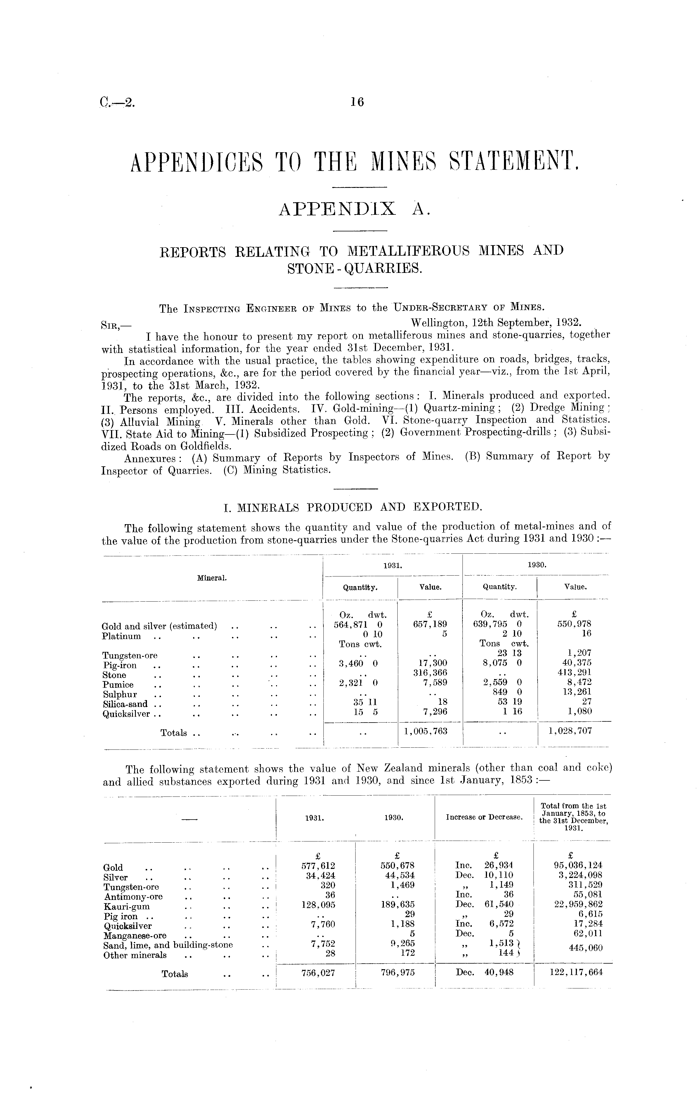 The Inspecting Engineer op Mines to the Under-Secretary op Mines. Sir,— Wellington, 12th September, 1932. I have the honour to present my report on metalliferous mines and stone-quarries, together with statistical information, for the year ended 31st December, 1931. In accordance with the usual practice, the tables showing expenditure on roads, bridges, tracks, prospecting operations, &c., are for the period covered by the financial year viz., from the Ist April, 1931, to the 31st March, 1932. The reports, &c., are divided into the following sections : I. Minerals produced and exported. 11. Persons employed. 111. Accidents. IV. Gold-mining—(l) Quartz-mining; (2) Dredge Mining: (3) Alluvial Mining V. Minerals other than Gold. VI. Stone-quarry Inspection and Statistics. VII. State Aid to Mining— (1) Subsidized Prospecting ; (2) Government Prospecting-drills ; (3) Subsidized Roads on Goldfields. Annexures: (A) Summary of Reports by Inspectors of Mines. (B) Summary of Report by Inspector of Quarries. (C) Mining Statistics.