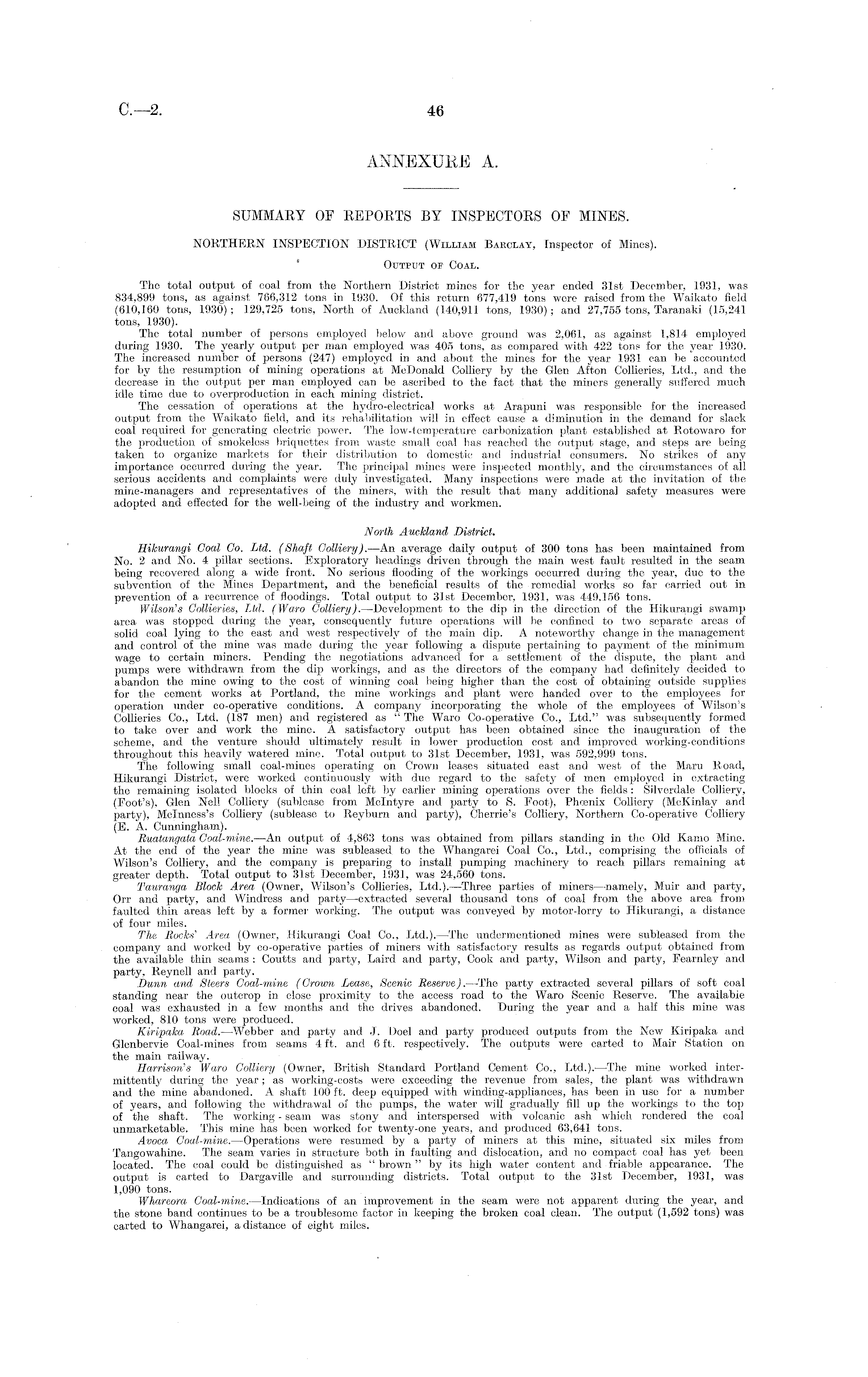 SUMMARY OF REPORTS BY INSPECTORS OF MINES. NORTHERN INSPECTION DISTRICT (William Barclay, Inspector of Mines). Output of Coal. The total output of coal from the Northern District mines for the year ended 31st December, 1931, was 834,899 tons, as against 766,312 tons in 1930. Of this return 677,419 tons were raised from the Waikato field (610,160 tons, 1930); 129,725 tons, North of Auckland (140,911 tons, 1930); and 27,755 tons, Taranaki (15,241 tons, .1930). The total number of persons employed below and above ground was 2,061, as against 1,814 employed during 1930. The yearly output per man employed was 405 tons, as compared with 422 tons for the year 1930. The increased number of persons (247) employed in and about the mines for the year 1931 can be accounted for by the resumption of mining operations at McDonald Colliery by the Glen Afton Collieries, Ltd., and the decrease in the output per man employed can be ascribed to the fact that the miners generally suffered much idle time due to overproduction in each mining district. The cessation of operations at the hydro-electrical works at Arapuni was responsible for the increased output from the Waikato field, and its rehabilitation will in effect cause a diminution in the demand for slack coal required for generating electric power. The low-temperature carbonization plant established at Rotowaro for the production of smokeless briquettes from waste small coal has reached the output stage, and steps are being taken to organize markets for their distribution to domestic and industrial consumers. No strikes of any importance occurred during the year. The principal mines were inspected monthly, and the circumstances of all serious accidents and complaints were duly investigated. Many inspections were made at the invitation of the mine-managers and representatives of the miners, with the result that many additional safety measures were adopted and effected for the well-being of the industry and workmen. North Auckland District. Hikurangi Goal Go. Ltd. (Shaft Colliery).—An average daily output of 300 tons has been maintained from No. 2 and No. 4 pillar sections. Exploratory headings driven through the main west fault resulted in the seam being recovered along a wide front. No serious flooding of the workings occurred during the year, due to the subvention of the Mines Department, and the beneficial results of the remedial works so far carried out in prevention of a recurrence of floodings. Total output to 31st December, 1931, was 449,156 tons. Wilson's Collieries, Ltd. (Waro Colliery).—Development to the dip in the direction of the Hikurangi swamp area was stopped during the year, consequently future operations will be confined to two separate areas of solid coal lying to the east and west respectively of the main dip. A noteworthy change in the management and control of the mine was made during the year following a dispute pertaining to payment of the minimum wage to certain miners. Pending the negotiations advanced for a settlement of the dispute, the plant and pumps were withdrawn from the dip workings, and as the directors of the company had definitely decided to abandon the mine owing to the cost of winning coal being higher than the cost of obtaining outside supplies for the cement works at Portland, the mine workings and plant were handed over to the employees for operation under co-operative conditions. A company incorporating the whole of the employees of Wilson's Collieries Co., Ltd. (187 men) and registered as " The Waro Co-operative Co., Ltd." was subsequently formed to take over and work the mine. A satisfactory output has been obtained since the inauguration of the scheme, and the venture should ultimately result in lower production cost and improved working-conditions throughout this heavily watered mine. Total output to 31st December, 1931, was 592,999 tons. The following small coal-mines,, operating on Crown leases situated east and west of the Maru Road, Hikurangi District, were worked continuously with due regard to the safety of men employed in extracting the remaining isolated blocks of thin coal left by earlier mining operations over the fields : Silverdale Colliery, (Foot's), Glen Nell Colliery (sublease from Mclntyre and party to S. Foot), Phcenix Colliery (McKinlav and party), Mclnness's Colliery (sublease to Reyburn and party), Cherrie's Colliery, Northern Co-operative Colliery (E. A. Cunningham). Ruatangata Coal-mine.—An output of 4,863 tons was obtained from pillars standing in the Old Kamo Mine. At the end of the year the mine was subleased to the Whangarei Coal Co., Ltd., comprising the officials of Wilson's Colliery, and the company is preparing to install pumping machinery to reach pillars remaining at greater depth. Total output to 31st December, 1931, was 24,560 tons. Tauranga Block Area (Owner, Wilson's Collieries, Ltd.). —Three parties of miners—namely, Muir and party, Orr and party, and Windress and party—extracted several thousand tons of coal from the above area from faulted thin areas left by a former working. The output was conveyed by motor-lorry to Hikurangi, a distance of four miles. The Rocks' Area (Owner, Hikurangi Coal Co., Ltd.). —The undermentioned mines were subleased from the company and worked by co-operative parties of miners with satisfactory results as regards output obtained from the available thin seams : Coutts and party, Laird and party, Cook and party, Wilson and party, Fearnley and party, Reynell and party. Dunn and Steers Coal-mine (Grown Lease, Scenic Reserve). —The party extracted several pillars of soft coal standing near the outcrop in close proximity to the access road to the Waro Scenic Reserve. The available coal was exhausted in a few months and the drives abandoned. During the year and a half this mine was worked, 810 tons were produced. Kiripaka Road. —Webber and party and J. Doel and party produced outputs from the New Kiripaka and Glenbervie Coal-mines
