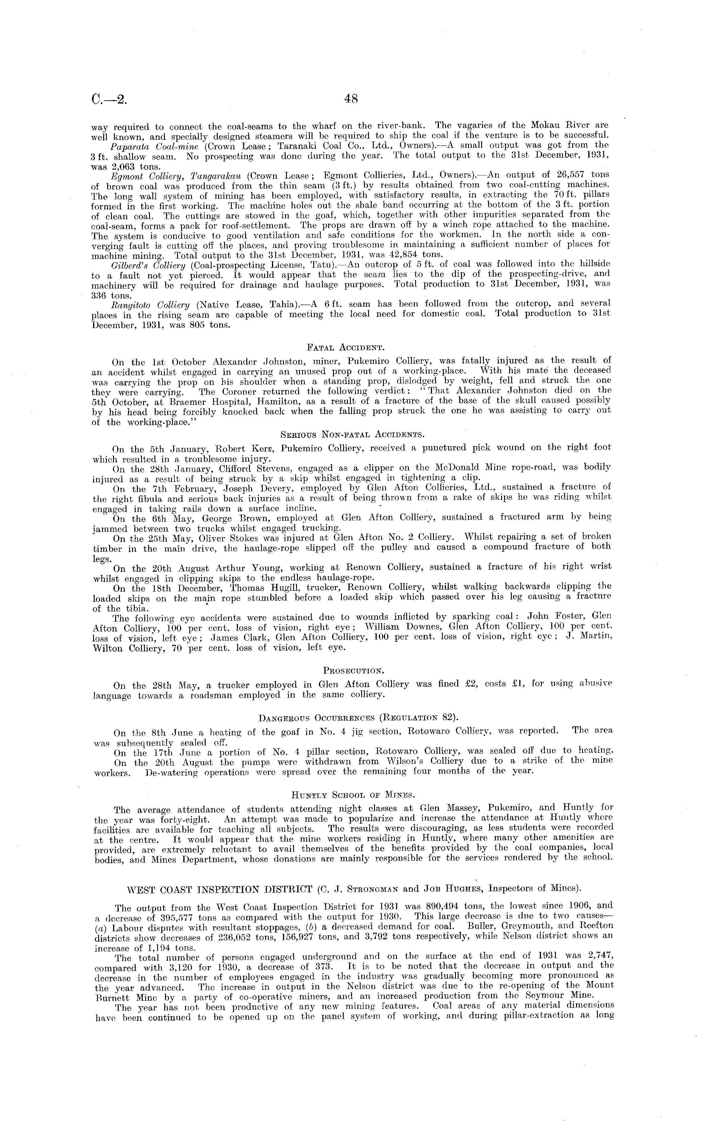 way required to connect the coal-seams to the wharf on the river-bank. The vagaries of the Mokau River are well known, and specially designed steamers will be required to ship the coal if the venture is to be successful. Paparata Goal-mine (Crown Lease; Taranaki Coal Co., Ltd., Owners).—A small output was got from the 3 ft. shallow seam. No prospecting was done during the year. The total output to the 31st December, 1931, was 2,063 tons. Egmont Colliery, Tangarakau (Crown Lease; Egmont Collieries, Ltd., Owners). —An output of 26,557 tons of brown coal was produced from the thin seam (3 ft.) by results obtained from two coal-cutting machines. The long wall system of mining has been employed, with satisfactory results, in extracting the 70 ft. pillars formed in the first working. The machine holes out the shale band occurring at the bottom of the 3 ft. portion of clean coal. The cuttings are stowed in the goaf, which, together with other impurities separated from the coal-seam, forms a pack for roof-settlement. The props are drawn off by a winch rope attached to the machine. The system is conducive to good ventilation and safe conditions for the workmen. In the north side a converging fault is cutting off the places, and proving troublesome in maintaining a sufficient number of places for machine mining. Total output to the 31st December, 1931, was 42,854 tons. Oilberd's Colliery (Coal-prospecting License, Tatu). —An outcrop of 5 ft. of coal was followed into the hillside to a fault not yet pierced. It would appear that the seam lies to the dip of the prospecting-drive, and machinery will be required for drainage and haulage purposes. Total production to 31st December, 1931, was 336 tons. Rangitoto Colliery (Native Lease, Tahia). —A 6 ft. seam has been followed from the outcrop, and several places in the rising seam are capable of meeting the local need for domestic coal. Total production to 31st December, 1931, was 805 tons. Fatal Accident. On the Ist October Alexander Johnston, miner, Pukemiro Colliery, was fatally injured as the result of an accident whilst engaged in carrying an unused prop out of a working-place. With his mate the deceased was carrying the prop on his shoulder when a standing prop, dislodged by weight, fell and struck the one they were carrying. The Coroner returned the following verdict: "That Alexander Johnston died on the sth October, at Braemer Hospital, Hamilton, as a result of a fracture of the base of the skull caused possibly by his head being forcibly knocked back when the falling prop struck the one he was assisting to carry out of the working-place." Serious Non-fatal Accidents. On the sth January, Robert Kerr, Pukemiro Colliery, received a punctured pick wound on the right foot which resulted in a troublesome injury. On the 28th January, Clifford Stevens, engaged as a clipper on the McDonald Mine rope-road, was bodily injured as a result of being struck by a skip whilst engaged in tightening a clip. On the 7th February, Joseph Devery, employed by Glen Afton Collieries, Ltd., sustained a fracture of the right fibula and serious back injuries as a result of being thrown from a rake of skips he was riding whilst engaged in taking rails down a surface incline. On the 6th May, George Brown, employed at Glen Afton Colliery, sustained a fractured arm by being jammed between two trucks whilst engaged trucking. On the 25th May, Oliver Stokes was injured at Glen Afton No. 2 Colliery. Whilst repairing a set of broken timber in the main drive, the haulage-rope slipped off the pulley and caused a compound fracture of both legs. On the 20th August Arthur Young, working at Renown Colliery, sustained a fracture of his right wrist whilst engaged in clipping skips to the endless haulage-rope. On the 18th December, Thomas Hugill, trucker, Renown Colliery, whilst walking backwards clipping the loaded skips on the main rope stumbled before a loaded skip which passed over his leg causing a fracture of the tibia. The following eye accidents were sustained due to wounds inflicted by sparking coal: John Foster, Glen Afton Colliery, 100 per cent, loss of vision, right eye; William Downes, Glen Afton Colliery, 100 per cent, loss of vision, left eye; James Clark, Glen Afton Colliery, 100 per cent, loss of vision, right eye; J. Martin, Wilton Colliery, 70 per cent, loss of vision, left eye. Peosecution. On the 28th May, a trucker employed in Glen Afton Colliery was fined £2, costs fl, for using abusive language towards a roadsman employed in the same colliery. Dangeeous Occuerences (Regulation 82). On the Bth June a heating of the goaf in No. 4 jig section, Rotowaro Colliery, was reported. The area was subsequently sealed off. On the 17th June a portion of No. 4 pillar section, Rotowaro Colliery, was sealed off due to heating. On the 20th August the pumps were withdrawn from Wilson's Colliery due to a strike of the mine workers. De-watering operations were spread over the remaining four months of the year. Httntly School of Mines. The average attendance of students attending night classes at Glen Massey, Pukemiro, and Huntly for the year was forty-eight. An attempt was made to popularize and increase the attendance at Huntly where facilities are available for teaching all subjects. The results were discouraging, as less students were recorded at the centre. It would appear that the mine workers residing in Huntly, where many other amenities are provided, are extremely reluctant to avail themselves of the benefits provided by the coal companies, local bodies, and Mines Department, whose donations are mainly responsible for the services rendered by the school. WEST COAST INSPECTION DISTRICT (C. J. Strongman and Job Hughes, Inspectors of Mines). The output from the West Coast Inspection District for 1931 was 890,494 tons, the lowest since 1906, and a decrease of 395,577 tons as compared with the output for 1930. This large decrease is due to two causesfa) Labour disputes with re