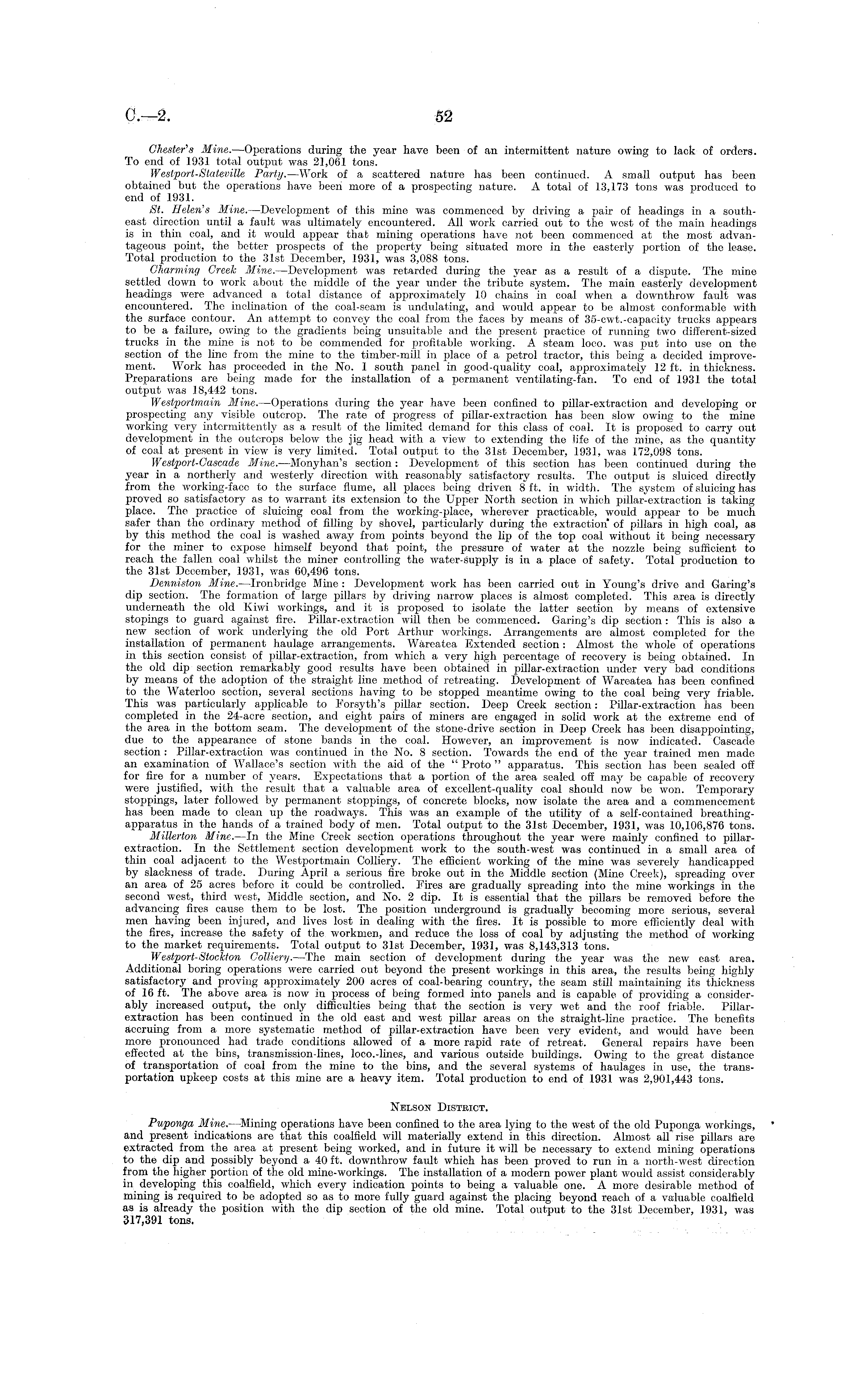 Chester's Mine.—Operations during the year have been of an intermittent nature owing to lack of orders. To end of 1931 total output was 21,061 tons. Westport-Stateville Party.—Work of a scattered nature has been continued. A small output has been obtained but the operations have been more of a prospecting nature. A total of 13,173 tons was produced to end of 1931. St. Helen's Mine.—Development of this mine was commenced by driving a pair of headings in a southeast direction until a fault was ultimately encountered. All work carried out to the west of the main headings is in thin coal, and it would appear that mining operations have not been commenced at the most advantageous point, the better prospects of the property being situated more in the easterly portion of the lease. Total production to the 31st December, 1931, was 3,088 tons. Charming Creek Mine. —Development was retarded during the year as a result of a dispute. The mine settled down to work about the middle of the year under the tribute system. The main easterly development headings were advanced a total distance of approximately 10 chains in coal when a downthrow fault was encountered. The inclination of the coal-seam is undulating, and would appear to be almost conformable with the surface contour. An attempt to convey the coal from the faces by means of 35-cwt.-capacity trucks appears to be a failure, owing to the gradients being unsuitable and the present practice of running two different-sized trucks in the mine is not to be commended for profitable working. A steam loco, was put into use on the section of the line from the mine to the timber-mill in place of a petrol tractor, this being a decided improvement. Work has proceeded in the No. 1 south panel in good-quality coal, approximately 12 ft. in thickness. Preparations are being made for the installation of a permanent ventilating-fan. To end of 1931 the total output was 18,442 tons. Westportmain Mine. —Operations during the year have been confined to pillar-extraction and developing or prospecting any visible outcrop. The rate of progress of pillar-extraction has been slow owing to the mine working very intermittently as a result of the limited demand for this class of coal. It is proposed to carry out development in the outcrops below the jig head with a view to extending the life of the mine, as the quantity of coal at present in view is very limited. Total output to the 31st December, 1931, was 172,098 tons. Westport-Caseade Mine.—Monyhan's section : Development of this section has been continued during the year in a northerly and westerly direction with reasonably satisfactory results. The output is sluiced directly from the working-face to the surface flume, all places being driven 8 ft. in width. The system of sluicing has proved so satisfactory as to warrant its extension to the Upper North section in which pillar-extraction is taking place. The practice of sluicing coal from the working-place, wherever practicable, would appear to be much safer than the ordinary method of filling by shovel, particularly during the extraction of pillars in high coal, as by this method the coal is washed away from points beyond the lip of the top coal without it being necessary for the miner to expose himself beyond that point, the pressure of water at the nozzle being sufficient to reach the fallen coal whilst the miner controlling the water-supply is in a place of safety. Total production to the 31st December, 1931, was 60,496 tons. Denniston Mine.—lronbridge Mine : Development work has been carried out in Young's drive and Garing's dip section. The formation of large pillars by driving narrow places is almost completed. This a-rea is directly underneath the old Kiwi workings, and it is proposed to isolate the latter section by means of extensive stopings to guard against fire. Pillar-extraction will then be commenced. Garing's dip section : This is also a new section of work underlying the old Port Arthur workings. Arrangements are almost completed for the installation of permanent haulage arrangements. Wareatea Extended section : Almost the whole of operations in this section consist of pillar-extraction, from which a very high percentage of recovery is being obtained. In the old dip section remarkably good results have been obtained in pillar-extraction under very bad conditions by means of the adoption of the straight line method of retreating. Development of Wareatea has been confined to the Waterloo section, several sections having to be stopped meantime owing to the coal being very friable. This was particularly applicable to Forsyth's pillar section. Deep Creek section: Pillar-extraction has been completed in the 24-acre section, and eight pairs of miners are engaged in solid work at the extreme end of the area in the bottom seam. The development of the stone-drive section in Deep Creek has been disappointing, due to the appearance of stone bands in the coal. However, an improvement is now indicated. Cascade section : Pillar-extraction was continued in the No. 8 section. Towards the end of the year trained men made an examination of Wallace's section with the aid of the " Proto " apparatus. This section has been sealed off for fire for a number of years. Expectations that a portion of the area sealed off may be capable of recovery were justified, with the result that a valuable area of excellent-quality coal should now be won. Temporary stoppings, later followed by permanent stoppings, of concrete blocks, now isolate the area and a commencement has been made to clean up the roadways. This was an example of the utility of a self-contained breathingapparatus in the hands of a trained body of men. Total output to the 31st December, 1931, was 10,106,876 tons. Millerton Mine.—ln the Mine Creek section operations throughout the year were mainly confined to pillarextraction. In the Settlement section development work to the south-west was continued in a small 