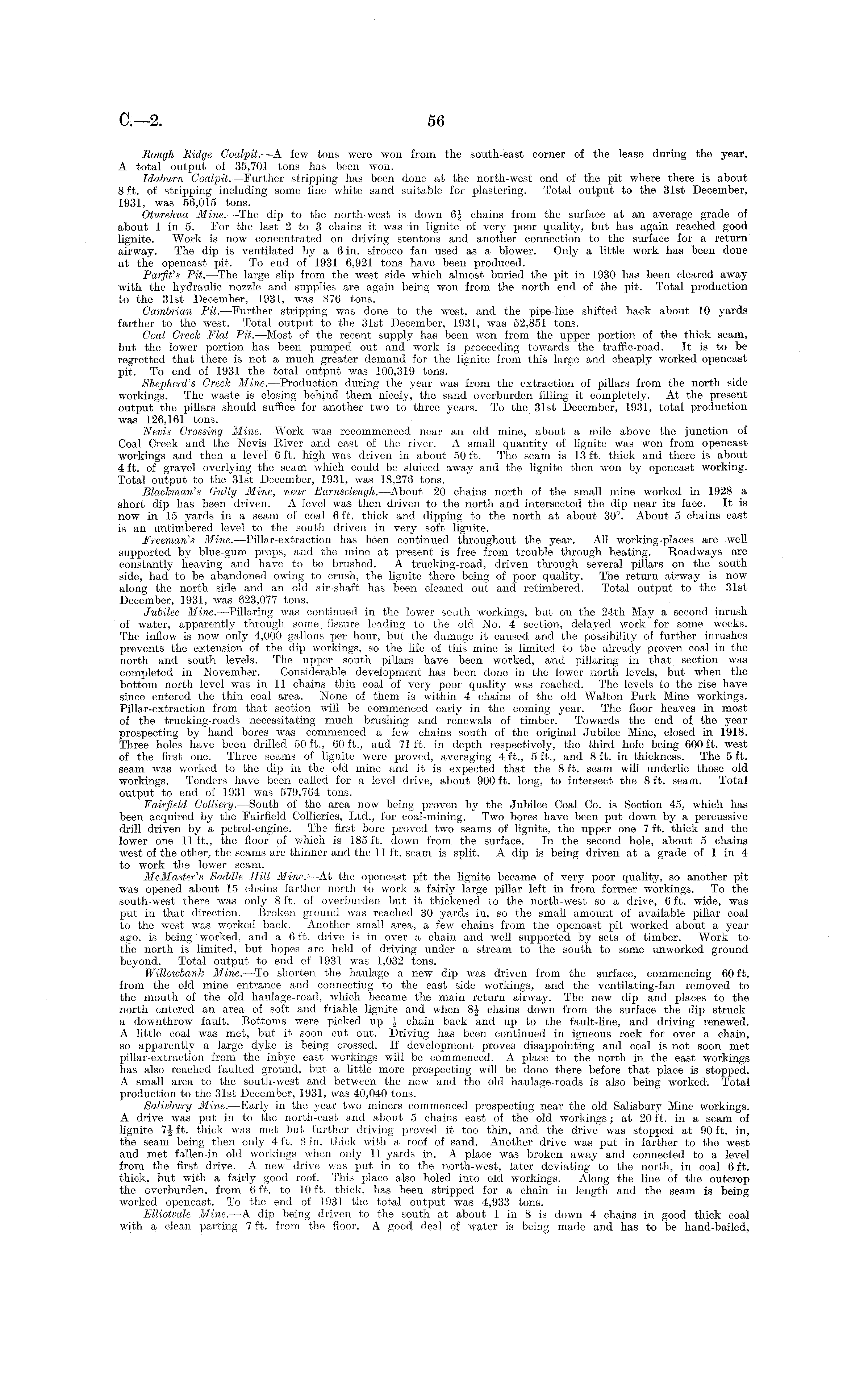 Rough Ridge Coalpit.—A few tons were won from the south-east corner of the lease during the year. A total output of 35,701 tons has been won. Idaburn Coalpit.—Further stripping has been done at the north-west end of the pit where there is about 8 ft. of stripping including some fine white sand suitable for plastering. Total output to the 31st December, 1931, was 56,015 tons. Oturehua Mine.—The dip to the north-west is down 6J chains from the surface at an average grade of about lin 5. For the last 2to 3 chains it was in lignite of very poor quality, but has again reached good lignite. Work is now concentrated on driving stentons and another connection to the surface for a return airway. The dip is ventilated by a 6 in. sirocco fan used as a blower. Only a little work has been done at the opencast pit. To end of 1931 6,921 tons have been produced. Parfit's Pit. —The large slip from the west side which almost buried the pit in 1930 has been cleared away with the hydraulic nozzle and supplies are again being won from the north end of the pit. Total production to the 31st December, 1931, was 876 tons. Cambrian Pit. —Further stripping was done to the west, and the pipe-line shifted back about 10 yards farther to the west. Total output to the 31st December, 1931, was 52,851 tons. Coal Creek Flat Pit. —Most of the recent supply has been won from the upper portion of the thick seam, but the lower portion has been pumped out and work is proceeding towards the traffic-road. It is to be regretted that there is not a much greater demand for the lignite from this large and cheaply worked opencast pit. To end of 1931 the total output was 100,319 tons. Shepherd's Creek Mine.—Production during the year was from the extraction of pillars from the north side workings. The waste is closing behind them nicely, the sand overburden filling it completely. At the present output the pillars should suffice for another two to three years. To the 31st December, 1931, total production was 126,161 tons. Nevis Crossing Mine. —Work was recommenced near an old mine, about a mile above the junction of Coal Creek and the Nevis River and east of the river. A small quantity of lignite was won from opencast workings and then a level 6 ft. high was driven in about 50 ft. The seam is 13 ft. thick and there is about 4 ft. of gravel overlying the seam which could be sluiced away and the lignite then won by opencast working. Total output to the 31st December, 1931, was 18,276 tons. Blackman's Gully Mine, near Earnscleugh.—About 20 chains north of the small mine worked in 1928 a short dip has been driven. A level was then driven to the north and intersected the dip near its face. It is now in 15 yards in a seam of coal 6 ft. thick and dipping to the north at about 30°. About 5 chains east is an untimbered level to the south driven in very soft lignite. Freeman's Mine.—Pillar-extraction has been continued throughout the year. All working-places are well supported by blue-gum props, and the mine at present is free from trouble through heating. Roadways are constantly heaving and have to be brushed. A trucking-road, driven through several pillars on the south side, had to be abandoned owing to crush, the lignite there being of poor quality. The return airway is now along the north side and an old air-shaft has been cleaned out and retimbered. Total output to the 31st December, 1931, was 623,077 tons. Jubilee Mine. —Pillaring was continued in the lower south workings, but on the 24th May a second inrush of water, apparently through some, fissure leading to the old No. 4 section, delayed work for some weeks. The inflow is now only 4,000 gallons per hour, but the damage it caused and the possibility of further inrushes prevents the extension of the dip workings, so the life of this mine is limited to the already proven coal in the north and south levels. The upper south pillars have been worked, and pillaring in that section was completed in November. Considerable development has been done in the lower north levels, but when the bottom north level was in 11 chains thin coal of very poor quality was reached. The levels to the rise have since entered the thin coal area. None of them is within 4 chains of the old Walton Park Mine workings. Pillar-extraction from that section will be commenced early in the coming year. The floor heaves in most of the trucking-roads necessitating much brushing and renewals of timber. Towards the end of the year prospecting by hand bores was commenced a few chains south of the original Jubilee Mine, closed in 1918. Three holes have been drilled 50 ft., 60 ft., and 71ft. in depth respectively, the third hole being 600 ft. west of the first one. Three seams of lignite were proved, averaging 4 ft., 5 ft., and 8 ft. in thickness. The 5 ft. seam was worked to the dip in the old mine and it is expected that the 8 ft. seam will underlie those old workings. Tenders have been called for a level drive, about 900 ft. long, to intersect the 8 ft. seam. Total output to end of 1931 was 579,764 tons. Fairfield Colliery.—South of the area now being proven by the Jubilee Coal Co. is Section 45, which has been acquired by the Fairfield Collieries, Ltd., for coal-mining. Two bores have been put down by a percussive drill driven by a petrol-engine. The first bore proved two seams of lignite, the upper one 7 ft. thick and the lower one lift., the floor of which is 185 ft. down from the surface. In the second hole, about 5 Chains west of the other, the seams are thinner and the 11 ft. seam is split. A dip is being driven at a grade of 1 in 4 to work the lower seam. McMaster's Saddle Hill the opencast pit the lignite became of very poor quality, so another pit was opened about 15 chains farther north to work a fairly large pillar left in from former workings. To the south-west there was only 8 ft. of overburden but it thickened to the north-west so a drive, 6 ft. wide, was put in that direction. Broken grou