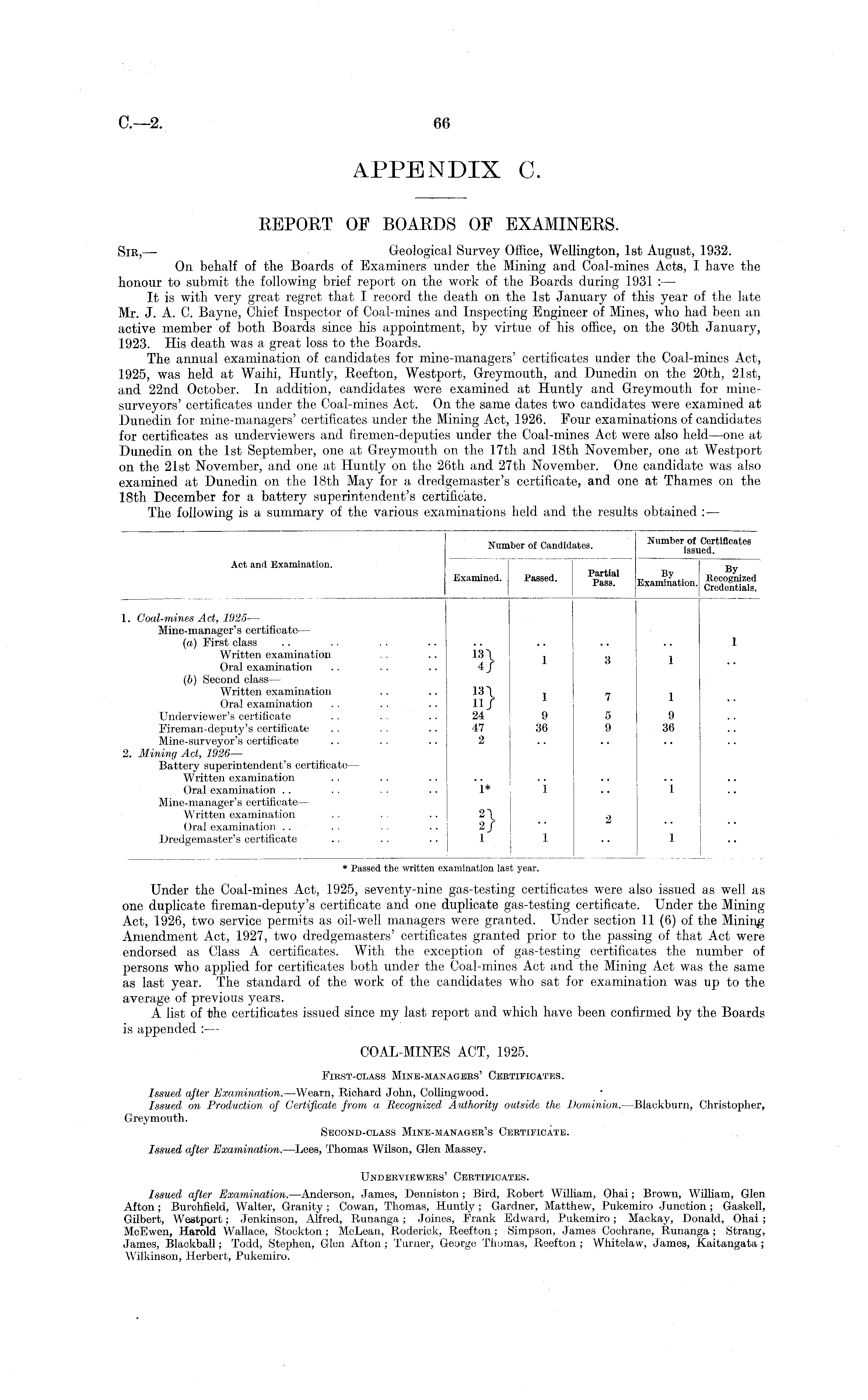 REPORT OF BOARDS OF EXAMINERS. Sir, — Geological Survey Office, Wellington, Ist August, 1932. On behalf of the Boards of Examiners under the Mining and Coal-mines Acts, I have the honour to submit the following brief report on the work of the Boards during 1931 : — It is with very great regret that I record the death on the Ist January of this year of the late Mr. J. A. C. Bayne, Chief Inspector of Coal-mines and Inspecting Engineer of Mines, who had been an active member of both Boards since his appointment, by virtue of his office, on the 30th January, 1923. His death was a great loss to the Boards. The annual examination of candidates for mine-managers' certificates under the Coal-mines Act, 1925, was held at Waihi, Huntly, Reefton, Westport, Greymouth, and Dunedin on the 20th, 21st, and 22nd October. In addition, candidates were examined at Huntly and Greymouth for minesurveyors' certificates under the Coal-mines Act. On the same dates two candidates were examined at Dunedin for mine-managers' certificates under the Mining Act, 1926. Four examinations of candidates for certificates as underviewers and firemen-deputies under the Coal-mines Act were also held—one at Dunedin on the Ist September, one at Greymouth on the 17th and 18th November, one at Westport on the 21st November, and one at Huntly on the 26th and 27th November. One candidate was also examined at Dunedin on the 18th May for a dredgemaster's certificate, and one at Thames on the 18th December for a battery superintendent's certificate. The following is a summary of the various examinations held and the results obtained : —