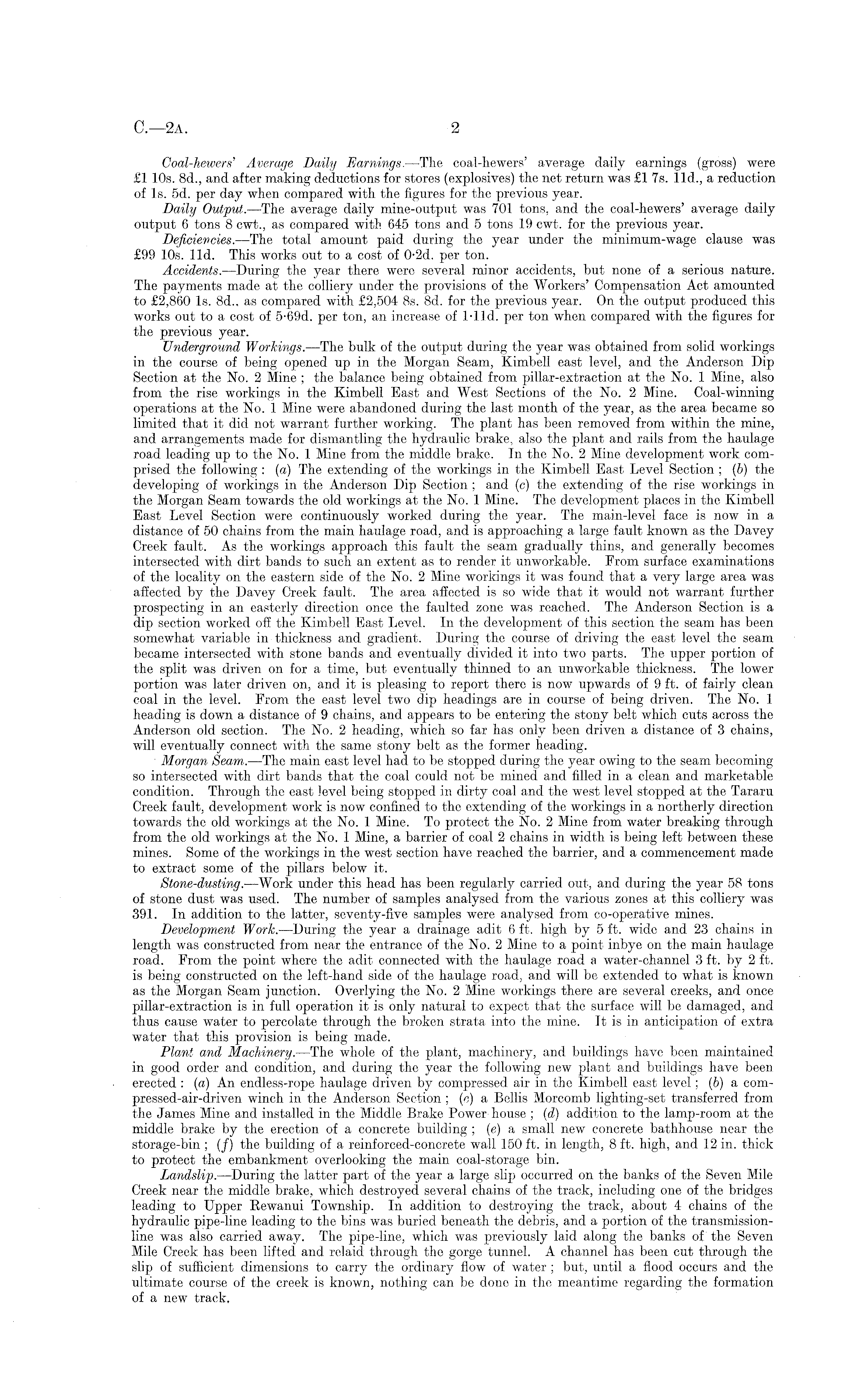 Coal-hewers' Average Daily Earnings. —The coal-hewers' average daily earnings (gross) were £1 10s. Bd., and after making deductions for stores (explosives) the net return was £1 7s. lid., a reduction of Is. sd. per day when compared with the figures for the previous year. Daily Output. —The average daily mine-output was 701 tons, and the coal-hewers' average daily output 6 tons 8 cwt., as compared with 645 tons and 5 tons 19 cwt. for the previous year. Deficiencies. —The total amount paid during the year under the minimum-wage clause was £99 10s. lid. This works out to a cost of 0-2 d. per ton. Accidents. —During the year there were several minor accidents, but none of a serious nature. The payments made at the colliery under the provisions of the Workers' Compensation Act amounted to £2,860 Is. Bd., as compared with £2,504 Bs. Bd. for the previous year. On the output produced this works out to a cost of 5-69 d. per ton, an increase of 1-lld. per ton when compared with the figures for the previous year. Underground Workings. —The bulk of the output during the year was obtained from solid workings in the course of being opened up in the Morgan Seam, Kimbell east level, and the Anderson Dip Section at the No. 2 Mine ; the balance being obtained from pillar-extraction at the No. 1 Mine, also from the rise workings in the Kimbell East and West Sections of the No. 2 Mine. Coal-winning operations at the No. 1 Mine were abandoned during the last month of the year, as the area became so limited that it did not warrant further working. The plant has been removed from within the mine, and arrangements made for dismantling the hydraulic brake, also the plant and rails from the haulage road leading up to the No. 1 Mine from the middle brake. In the No. 2 Mine development work comprised the following : (a) The extending of the workings in the Kimbell East Level Section ; (b) the developing of workings in the Anderson Dip Section ; and (c) the extending of the rise workings in the Morgan Seam towards the old workings at the No. 1 Mine. The development places in the Kimbell East Level Section were continuously worked during the year. The main-level face is now in a distance of 50 chains from the main haulage road, and is approaching, a large fault known as the Davey Creek fault. As the workings approach this fault the seam gradually thins, and generally becomes intersected with dirt bands to such an extent as to render it unworkable. From surface examinations of the locality on the eastern side of the No. 2 Mine workings it was found that a very large area was affected by the Davey Creek fault. The area affected is so wide that it would not warrant further prospecting in an easterly direction once the faulted zone was reached. The Anderson Section is a dip section worked off the Kimbell East Level. In the development of this section the seam has been somewhat variable in thickness and gradient. During the course of driving the east level the seam became intersected with stone bands and eventually divided it into two parts. The upper portion of the split was driven on for a time, but eventually thinned to an unworkable thickness. The lower portion was later driven on, and it is pleasing to report there is now upwards of 9 ft. of fairly clean coal in the level. From the east level two dip headings are in course of being driven. The No. 1 heading is down a distance of 9 chains, and appears to be entering the stony belt which cuts across the Anderson old section. The No. 2 heading, which so far has only been driven a distance of 3 chains, will eventually connect with the same stony belt as the former heading. ' Morgan Seam. —The main east level had to be stopped during the year owing to the seam becoming so intersected with dirt bands that the coal could not be mined and filled in a clean and marketable condition. Through the east level being stopped in dirty coal and the west level stopped at the Tararu Creek fault, development work is now confined to the extending of the workings in a northerly direction towards the old workings at the No. 1 Mine. To protect the No. 2 Mine from water breaking through from the old workings at the No. 1 Mine, a barrier of coal 2 chains in width is being left between these mines. Some of the workings in the west section have reached the barrier, and a commencement made to extract some of the pillars below it. Stone-dusting. —Work under this head has been regularly carried out, and during the year 58 tons of stone dust was used. The number of samples analysed from the various zones at this colliery was 391. In addition to the latter, seventy-five samples were analysed from co-operative mines. Development Work. —During the year a drainage adit 6 ft. high by 5 ft. wide and 23 chains in length was constructed from near the entrance of the No. 2 Mine to a point inbye on the main haulage road. From the point where the adit connected with the haulage road a water-channel 3 ft. by 2 ft. is being constructed on the left-hand side of the haulage road, and will be extended to what is known as the Morgan Seam junction. Overlying the No. 2 Mine workings there are several creeks, and once pillar-extraction is in full operation it is only natural to expect that the surface will be damaged, and thus cause water to percolate through the broken strata into the mine. It is in anticipation of extra water that this provision is being made. Plant and Machinery. —The whole of the plant, machinery, and buildings have been maintained in good order and condition, and during the year the following new plant and buildings have been erected : (a) An endless-rope haulage driven by compressed air in the Kimbell east level; (b) a com-pressed-air-driven winch in the Anderson Section ; (c) a Bellis Morcomb lighting-set transferred from the James Mine and installed in the Middle Brake Power house ; (d) addition to the lamp-room at the middle brake by the erection of a concrete building