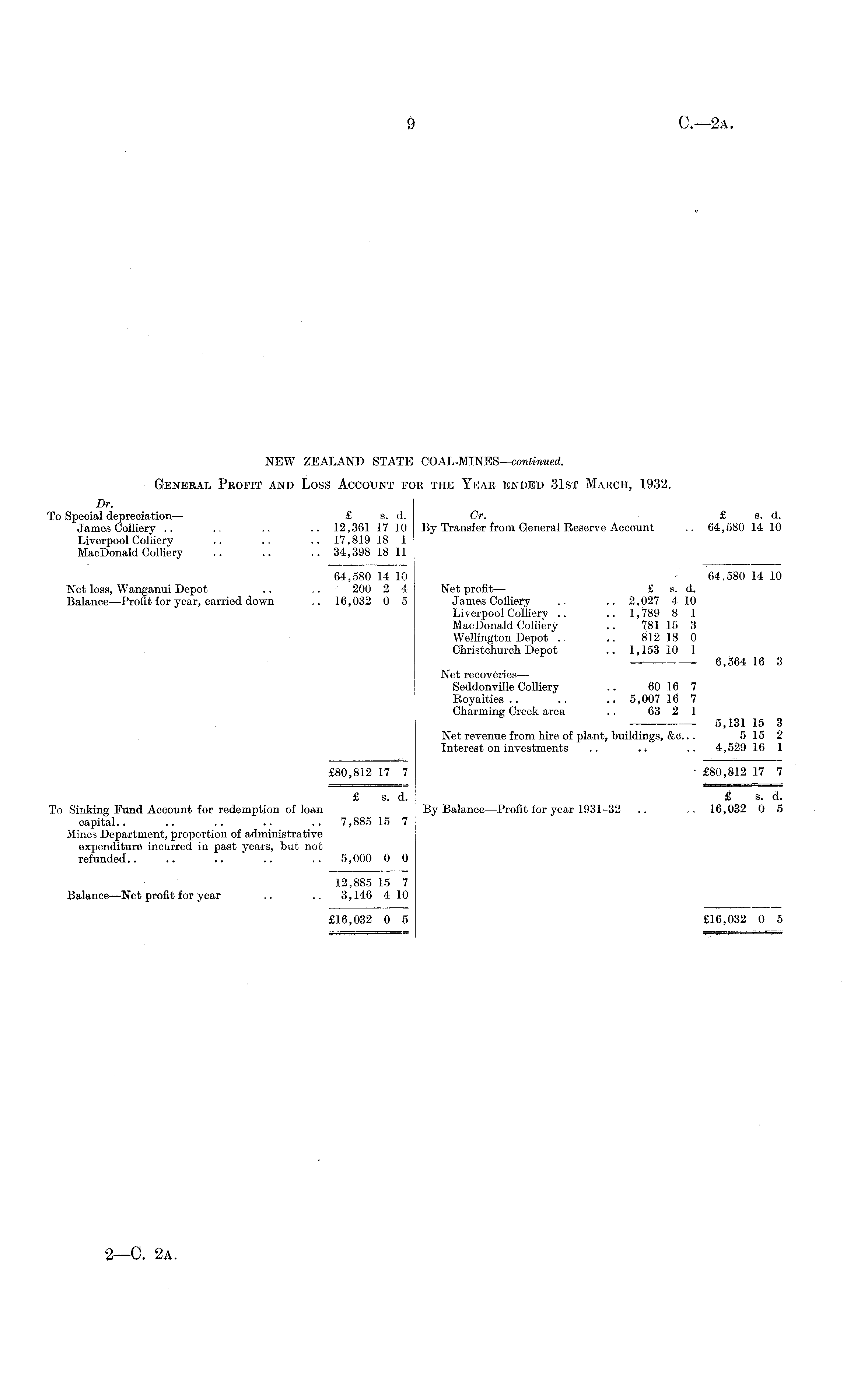 NEW ZEALAND STATE COAL-MINES —continued. General Profit and Loss Account for the Year ended 31st March, 1932. Dr - To Special depreciation— £ s. d. Or. £ s. d. James Colliery .. .. .. .. 12,361 17 10 By Transfer from General Reserve Account .. 64,580 14 10 Liverpool Colliery .. .. .. 17,819 18 1 Mac Donald Colliery .. .. .. 34,398 18 11 64,580 14 10 64,580 14 10 Net loss, Wanganui Depot .. .. 200 2 4 Net profit—- £ s. d. Balance—Profit for year, carried down .. 16,032 0 5 James Colliery .. .. 2,027 410 Liverpool Colliery .. .. 1,789 8 1 Mac Donald Colliery .. 781 15 3 Wellington Depot .. .. 812 18 0 Christchurch Depot 1,153 10 1 —— 6,564 16 3 Net recoveries—• Seddonville Colliery .. 60 16 7 Royalties .. >. .. 5,007 16 7 Charming Creek area .. 63 2 1 5,131 15 3 Net revenue from hire of plant, buildings, &c... 5 15 2 Interest on investments .. . > .. 4,529 16 1 £80,812 17 7 ' £80,812 17 7 £ s. d. £ s. d. To Sinking Eund Account for redemption of loan By Balance —Profit for year 1931-32 .. .. 16,032 0 5 capital.. .. .. .. .. 7,885 15 7 Mines Department, proportion of administrative expenditure incurred in past years, but not refunded.. .. .. .. .. 5,000 0 0 12,885 15 7 Balance—Net profit for year .. .. 3,146 410 £16,032 0 5 £16,032 0 5