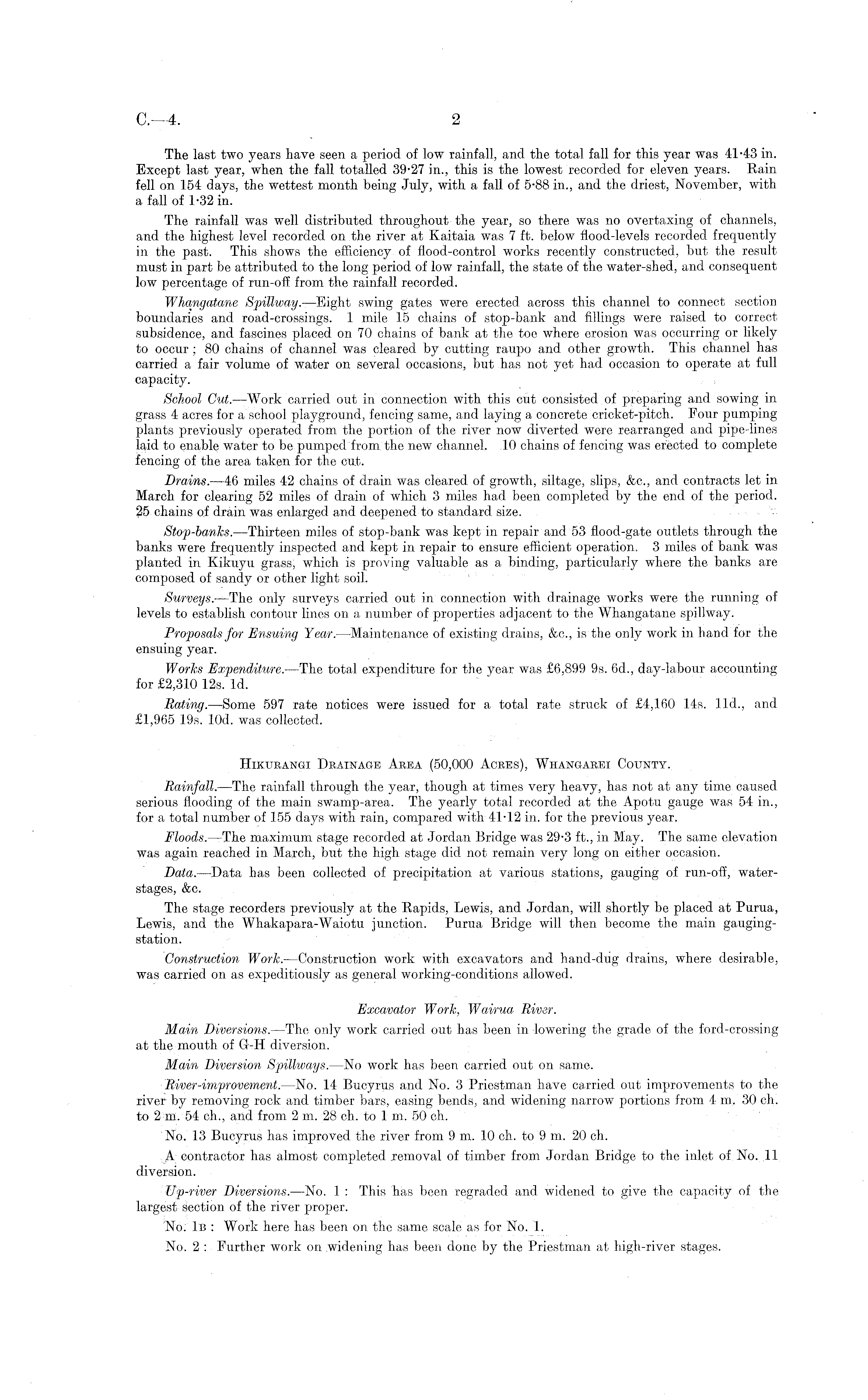 The last two years have seen a period of low rainfall, and the total fall for this year was 41-43 in. Except last year, when the fall totalled 39-27 in., this is the lowest recorded for eleven years. Rain fell on 154 days, the wettest month being July, with a fall of 5-88 in., and the driest, November, with a fall of 1-32 in. The rainfall was well distributed throughout the year, so there was no overtaxing of channels, and the highest level recorded on the river at Kaitaia was 7 ft. below flood-levels recorded frequently in the past. This shows the efficiency of flood-control works recently constructed, but the result must in part be attributed to the long period of low rainfall, the state of the water-shed, and consequent low percentage of run-off from the rainfall recorded. Whangatane Spillway. —Eight swing gates were erected across this channel to connect section boundaries and road-crossings. 1 mile 15 chains of stop-bank and fillings were raised to correct subsidence, and fascines placed on 70 chains of bank at the toe where erosion was occurring or likely to occur ; 80 chains of channel was cleared by cutting raupo and other growth. This channel has carried a fair volume of water on several occasions,. but has not yet had occasion to operate at full capacity. School Cut.—Work carried out in connection with this cut consisted of preparing and sowing in grass 4 acres for a school playground, fencing same, and laying a concrete cricket-pitch. Four pumping plants previously operated from the portion of the river now diverted were rearranged and pipe-lines laid to enable water to be pumped from, the new channel. 10 chains of fencing was erected to complete fencing of the area taken for the cut. Drains.—46 miles 42 chains of drain was cleared of growth, siltage, slips, &c., and contracts let in March for clearing 52 miles of drain of which 3 miles had been completed by the end of the period. 25 chains of drain was enlarged and deepened to standard size. Stop-banks.—Thirteen miles of stop-bank was kept in repair and 53 flood-gate outlets through the banks were frequently inspected and kept in repair to ensure efficient operation. 3 miles of bank was planted in Kikuyu grass, which is proving valuable as a binding, particularly where the banks are composed of sandy or other light soil. Surveys.—The only surveys carried out in connection with drainage works were the running of levels to establish contour lines on a number of properties adjacent to the Whangatane spillway. Proposals for Ensuing Year. —Maintenance of existing drains, &c., is the only work in hand for the ensuing year. Works Expenditure.—The total expenditure for the year was £6,899 9s. 6d., day-labour accounting for £2,310 12s. Id. Rating.—Some 597 rate notices were issued for a total rate struck of £4,160 14s. lid., and £1,965 19s. lOd. was collected. Hikurangi Drainage Area (50,000 Acres), Whangarei County. Rainfall. —The rainfall through the year, though at times very heavy, has not at any time caused serious flooding of the main swamp-area. The yearly total recorded at the Apotu gauge was 54 in., for a total number of 155 days with rain, compared with 41-12 in. for the previous year. Floods. —-The maximum stage recorded at Jordan Bridge was 29-3 ft., in May. The same elevation was again reached in March, but the high stage did not remain very long on either occasion. Data. —Data has been collected of precipitation at various stations, gauging of run-off, waterstages, &c. The stage-recorders previously at the Rapids, Lewis, and Jordan, will shortly be placed at Purua, Lewis, and the Whakapara-Waiotu junction. Purua Bridge will then become the main gaugingstation. Construction Work. —Construction work with excavators and hand-dug drains, where desirable, was carried on as expeditiously as general working-conditions allowed. Excavator Work, Wairua River. Main Diversions. —The only work carried out has been in lowering the grade of the ford-crossing at the mouth of G-H diversion. Main Diversion Spillways.—No work has been carried out on same. River-improvement.—No. 14 Bucyrus and No. 3 Priestman have carried out improvements to the river by removing rock and timber bars, easing bends, and widening narrow portions from 4 m. 30 ch. to 2 m. 54 ch., and from 2 m. 28 ch. to 1 m. 50 ch. No.. 13 Bucyrus has improved the river from 9 m. 10 ch. to 9 m. 20 ch. A contractor has almost completed removal of timber from Jordan Bridge to the inlet of No. 11 diversion. Up-river Diversions. —No. 1 : This has been regraded and widened to give the capacity of the largest section of the river proper. No. 1b : Work here has been on the same scale as for No. 1. No. 2 : Further work on widening has been done by the Priestman at high-river stages.