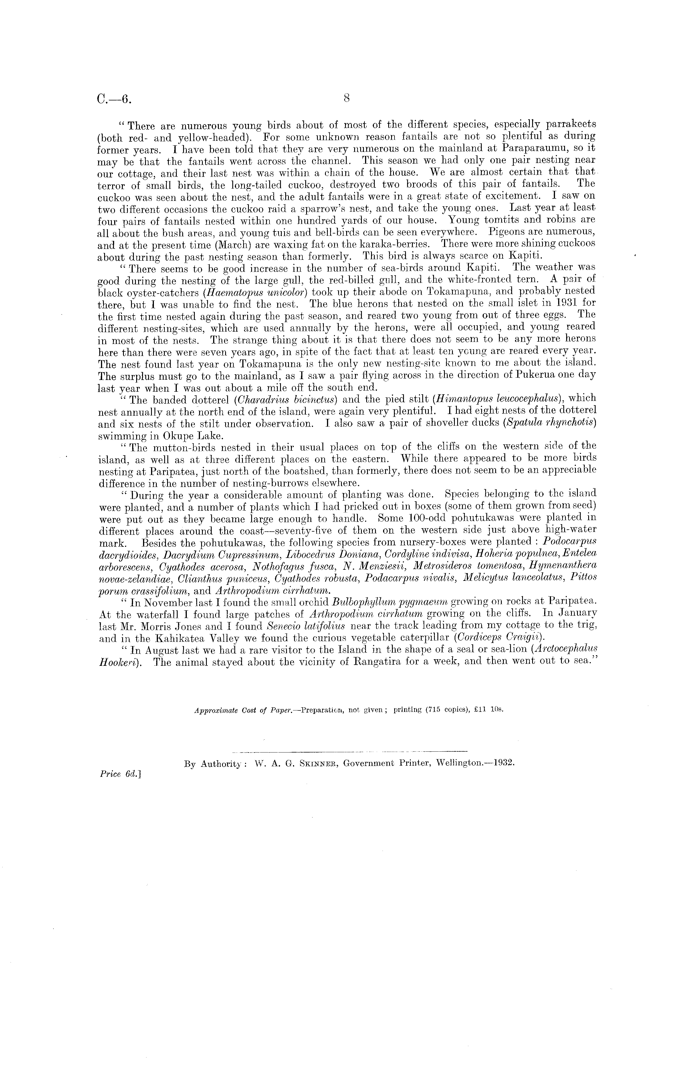 " There are numerous young birds about of most of the different species, especially parrakeets (both red- and yellow-headed). For some unknown reason fantails are not so plentiful as during former years. I have been told that they are very numerous on the mainland at Paraparaumu, so it may be that the fantails went across the channel. This season we had only one pair nesting near our cottage, and their last nest was within a chain of the house. We are almost certain that that terror of small birds, the long-tailed cuckoo, destroyed two broods of this pair of fantails. The cuckoo was seen about the nest, and the adult fantails were in a great state of excitement. I saw on two different occasions the cuckoo raid a sparrow's nest, and take the young ones. Last year at least four pairs of fantails nested within one hundred yards of our house. Young tomtits and robins are all about the bush areas, and young tuis and bell-birds can be seen everywhere. Pigeons are numerous, and at the present time (March) are waxing fat on the karaka-berries. There were more shining cuckoos about during the past nesting season than formerly. This bird is always scarce on Kapiti. " There seems to be good increase in the number of sea-birds around Kapiti. The weather was good during the nesting of the large gull, the red-billed gull, and the white-fronted tern. A pair of black oyster-catchers (Haematopus unicolor) took up their abode on Tokamapuna, and probably nested there, but I was unable to find the nest. The blue herons that nested on the small islet in 1931 for the first time nested again during the past season, and reared two young from out of three eggs. The different nesting-sites, which are used annually by the herons, were all occupied, and young reared in most of the nests. The strange thing about it is that there does not seem to be any more herons here than there were seven years ago, in spite of the fact that at least ten young are reared every year. The nest found last year on Tokamapuna is the only new nesting-site known to me about the island. The surplus must go to the mainland, as I saw a pair flying across in the direction of Pukerua one day last year when I was out about a mile off the south end. " The banded dotterel (Charadrius bicinctus) and the pied stilt (.Himantopus leucocephalus), which nest annually at the north end of the island, were again very plentiful. I had eight nests of the dotterel and six nests of the stilt under observation. I also saw a pair of shoveller ducks (Spatula rhynchotis) swimming in Okupe Lake. " The mutton-birds nested in their usual places on top of the cliffs on the western side of the island, as well as at three different places on the eastern. While there appeared to be more birds nesting at Paripatea, just north of the boatshed, than formerly, there does not seem to be an appreciable difference in the number of nesting-burrows elsewhere. "During the year a considerable amount of planting was done. Species belonging to the island were planted, and a number of plants which I had pricked out in boxes (some of them grown from seed) were put out as they became large enough to handle. Some 100-odd pohutukawas were planted in different places around the coast—seventy-five of them on the western side just above high-water mark. Besides the pohutukawas, the following species from nursery-boxes were planted : Podocarpus dacrydioides, Dacrydium Cupressinum, Libocedrus Doniana, Cordyline indivisa, Hoheria populnea, Entelea arborescens, Gyathodes acero-sa, Nothofagus fusca, N. Menziesii, Metrosideros tomentosa, Hymenanthera novae-zelandiae, Clianthus puniceus, Cyathodes robusta, Podacarpus nivalis, Melicytus lanceolatus, Pittos porum crassifolium, and Arthropodium cirrhatum. " In November last I found the small orchid Bulbophyllum pygmaeum growing on rocks at Paripatea. At the waterfall I found large patches of Arthropodium cinliatum growing on the cliffs. In January last Mr. Morris Jones and I found Senecio latifolius near the track leading from my cottage to the trig, and in the Kahikatea Valley we found the curious vegetable caterpillar (Cordiceps Craigii). " In August last we had a rare visitor to the Island in the shape of a seal or sea-lion ( Arctocephalus Hooheri). The animal stayed about the vicinity of Rangatira for a week, and then went out to sea." Approximate Cost of Paper.—Preparation, not given; printing (715 copies), £11 10s.