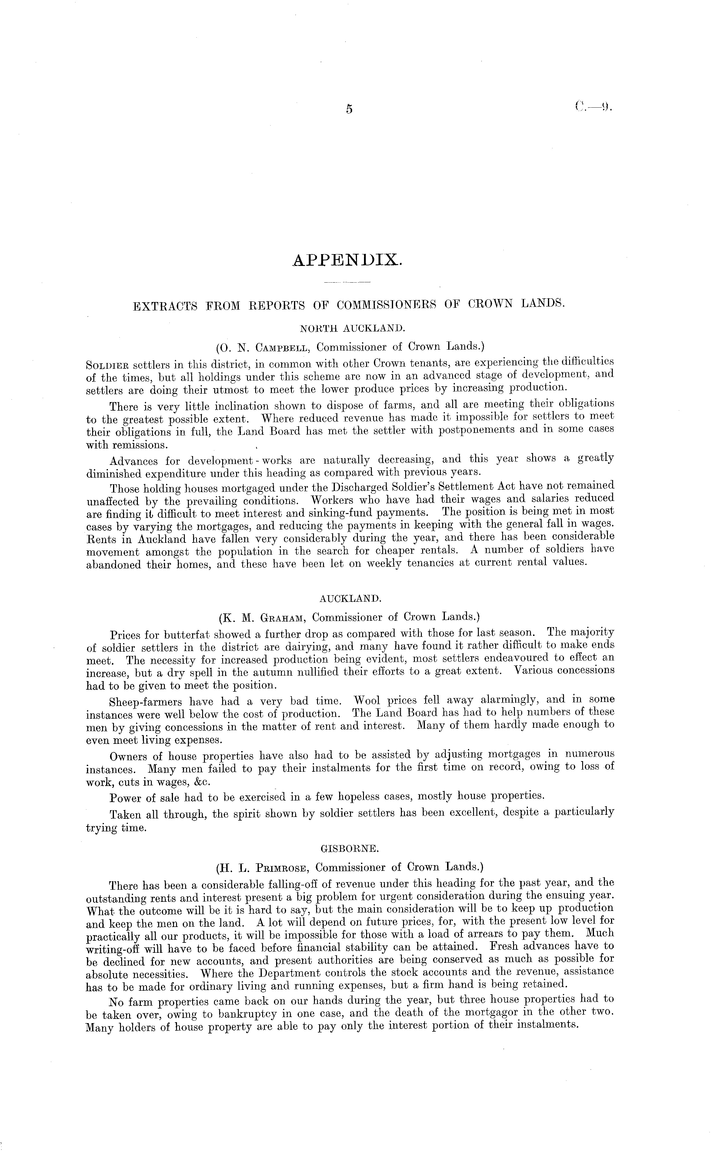 EXTRACTS FROM REPORTS OF COMMISSIONERS OF CROWN LANDS. NORTH AUCKLAND. (0. N. Campbell, Commissioner of Crown Lands.) Soldier settlers in this district, in common with other Crown tenants, are experiencing the difficulties of the times, but all holdings under this scheme are now in an advanced stage of development, and settlers are doing their utmost to meet the lower produce prices by increasing production. There is very little inclination shown to dispose of farms, and all are meeting their obligations to the greatest possible extent. Where reduced revenue has made it impossible for settlers to meet their obligations in full, the Land Board has met the settler with postponements and in some cases with remissions. Advances for development - works are naturally decreasing, and this year shows a greatly diminished expenditure under this heading as compared with previous years. Those holding houses mortgaged under the Discharged Soldier's Settlement Act have not remained unaffected by the prevailing conditions. Workers who have had their wages and salaries reduced are finding it difficult to meet interest and sinking-fund payments. The position is being met in most cases by varying the mortgages, and reducing the payments in keeping with the general fall in wages. Rents in Auckland have fallen very considerably during the year, and there has been considerable movement amongst the population in the search for cheaper rentals. A number of soldiers have abandoned their homes, and these have been let on weekly tenancies at current rental values. AUCKLAND. (K. M. Graham, Commissioner of Crown Lands.) Prices for butterfat showed a further drop as compared with those for last season. The majority of soldier settlers in the district are dairying, and many have found it rather difficult to make ends meet. The necessity for increased production being evident, most settlers endeavoured to effect an increase, but a drv spell in the autumn nullified their efforts to a great extent. Various concessions had to be given to meet the position. Sheep-farmers have had a very bad time. Wool prices fell away alarmingly, and in some instances were well below the cost of production. The Land Board has had to help numbers of these men by giving concessions in the matter of rent and interest. Many of them hardly made enough to even meet living expenses. Owners of house properties have also had to be assisted by adjusting mortgages in numerous instances. Many men failed to pay their instalments for the first time on record, owing to loss of work, cuts in wages, &c. Power of sale had to be exercised in a few hopeless cases, mostly house properties. Taken all through, the spirit shown by soldier settlers has been excellent, despite a particularly trying time. GISBORNE. (H. L. Primrose, Commissioner of Crown Lands.) There has been a considerable falling-ofl of revenue under this heading for the past year,_ and the outstanding rents and interest present a big problem for urgent consideration during the ensuing year. What the outcome will be it is hard to say, but the main consideration will be to keep up production and keep the men on the land. A lot will depend on future prices, for, with the present low level for practically all our products, it will be impossible for those with a load of arrears to pay them. Much writing-off will have to be faced before financial stability can be attained. Fresh advances have to be declined for new accounts, and present authorities are being conserved as much as possible for absolute necessities. Where the Department controls the stock accounts and the revenue, assistance has to be made for ordinary living and running expenses, but a firm hand is being retained. No farm properties came back on our hands during the year, but three house properties had to be taken over, owing to bankruptcy in one case, and the death of the mortgagor in the other two. Many holders of house property are able to pay only the interest portion of their instalments.