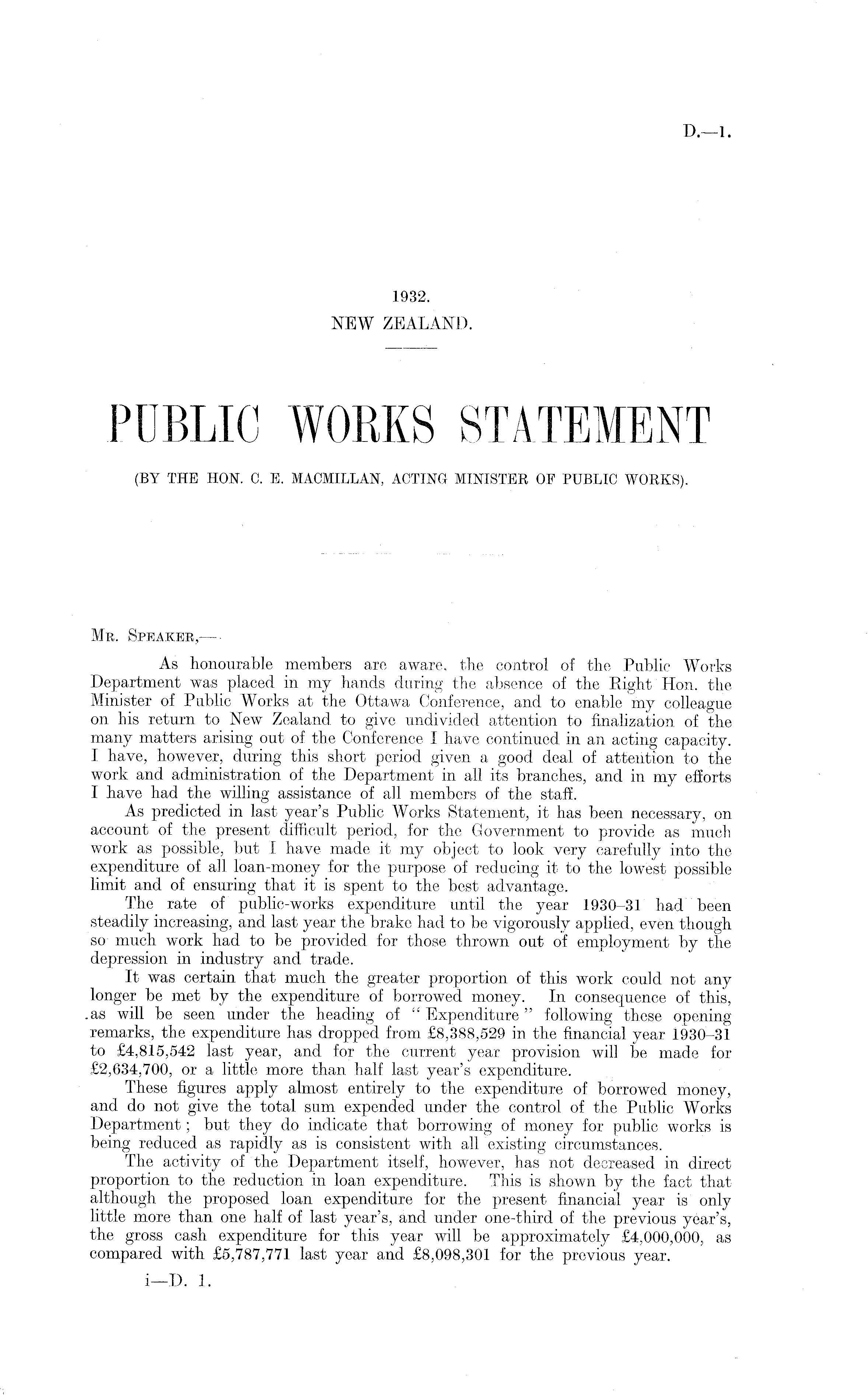 Mr. Speaker,— • As honourable members are aware, the control of the Public Works Department was placed in my hands during the absence of the Right Hon. the Minister of Public Works at the Ottawa Conference, and to enable my colleague on his return to New Zealand to give undivided attention to finalization of the many matters arising out of the Conference I have continued in an acting capacity. I have, however, during this short period given a good deal of attention to the work and administration of the Department in all its branches, and in my efforts I have had the willing assistance of all members of the staff. As predicted in last year's Public Works Statement, it has been necessary, on account of the present difficult period, for the Government to provide as much work as possible, but I have made it my object to look very carefully into the expenditure of all loan-money for the purpose of reducing it to the lowest possible limit and of ensuring that it is spent to the best advantage. The rate of public-works expenditure until the year 1930-31 had been steadily increasing, and last year the brake had to be vigorously applied, even though so much work had to be provided for those thrown out of employment by the depression in industry and trade. It was certain that much the greater proportion of this work could not any longer be met by the expenditure of borrowed money. In consequence of this, as will be seen under the heading of " Expenditure" following these openingremarks, the expenditure has dropped from £8,388,529 in the financial year 1930-31 to £4,815,542 last year, and for the current year provision will be made for £2,634,700, or a little more than half last year's expenditure. These figures apply almost entirely to the expenditure of borrowed money, and do not give the total sum expended under the control of the Public Works Department; but they do indicate that borrowing of money for public works is being reduced as rapidly as is consistent with all existing circumstances. The activity of the Department itself, however, has not decreased in direct proportion to the reduction in loan expenditure. This is shown by the fact that although the proposed loan expenditure for the present financial year is only little more than one half of last year's, and under one-third of the previous year's, the gross cash expenditure for this year will be approximately £4,000,000, as compared with £5,787,771 last year and £8,098,301 for the previous year. i—D. 1.