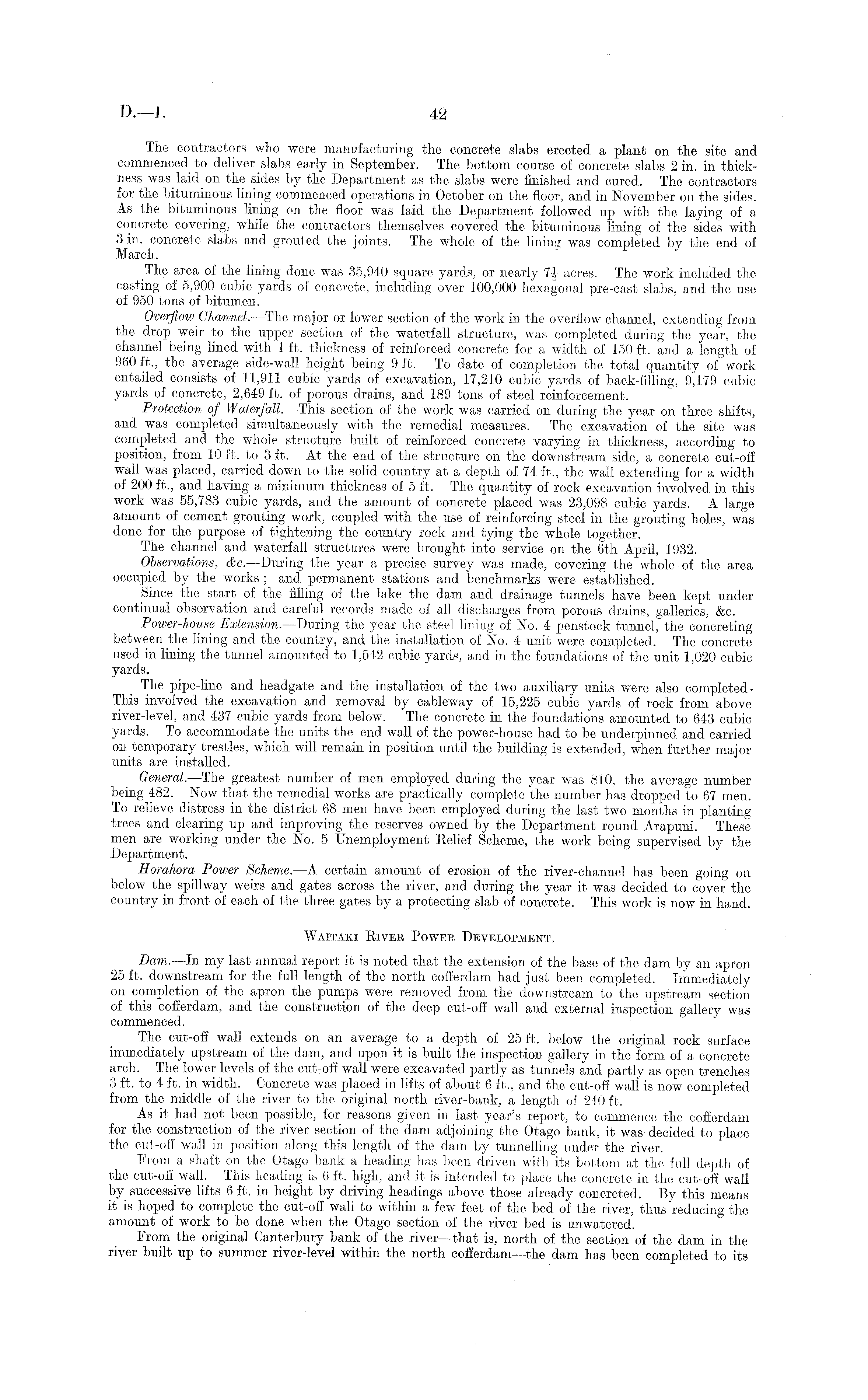The contractors who were manufacturing the concrete slabs erected a plant on the site ancl commenced to deliver slabs early in September. The bottom course of concrete slabs 2 in. in thickness was laid on the sides by the Department as the slabs were finished and cured. The contractors for the bituminous lining commenced operations in October on the floor, and in November on the sides. As the bituminous lining on the floor was laid the Department followed up with the laying of a concrete covering, while the contractors themselves covered the bituminous lining of the sides with 3 in. concrete slabs and grouted the joints. The whole of the lining was completed by the end of March. The area of the lining done was 35,940 square yards, or nearly 7| acres. The work included the casting of 5,900 cubic yards of concrete, including over 100,000 hexagonal pre-cast slabs, and the use of 950 tons of bitumen. Overflow Channel.—The major or lower section of the work in the overflow channel, extending from the drop weir to the upper section of the waterfall structure, was completed during the year, the channel being lined with 1 ft. thickness of reinforced concrete for a width of 150 ft. and a length of 960 ft., the average side-wall height being 9 ft. To date of completion the total quantity of work entailed consists of 11,911 cubic yards of excavation, 17,210 cubic yards of back-filling, 9,179 cubic yards of concrete, 2,649 ft. of porous drains, and 189 tons of steel reinforcement. Protection of Waterfall. —This section of the work was carried on during the year on three shifts, and was completed simultaneously with the remedial measures. The excavation of the site was completed and the whole structure built of reinforced concrete varying in thickness, according to position, from 10 ft. to 3 ft. At the end of the structure on the downstream side, a concrete cut-off wall was placed, carried down to the solid country at a depth of 74 ft., the wall extending for a width of 200 ft., and having a minimum thickness of 5 ft. The quantity of rock excavation involved in this work was 55,783 cubic yards, and the amount of concrete placed was 23,098 cubic yards. A large amount of cement grouting work, coupled with the use of reinforcing steel in the grouting holes, was done for the purpose of tightening the country rock and tying the whole together. The channel and waterfall structures were brought into service on the 6th April, 1932. Observations, &c.—During the year a precise survey was made, covering the whole of the area occupied by the works ; and permanent stations and benchmarks were established. Since the start of the filling of the lake the dam and drainage tunnels have been kept under continual observation and careful records made of all discharges from porous drains, galleries, &c. Power-house Extension. —During the year the steel lining of No. 4 penstock tunnel, the concreting between the lining and the country, and "the installation of No. 4 unit were completed. The concrete used in lining the tunnel amounted to 1,542 cubic yards, and in the foundations of the unit 1,020 cubic yards. The pipe-line and lieadgate and the installation of the two auxiliary units were also completedThis involved the excavation and removal by cableway of 15,225 cubic yards of rock from above river-level, and 437 cubic yards from below. The concrete in the foundations amounted to 643 cubic yards. To accommodate the units the end wall of the power-house had to be underpinned and carried on temporary trestles, which will remain in position until the building is extended, when further major units are installed. General. —The greatest number of men employed during the year was 810, the average number being 482. Now that the remedial works are practically complete the number has dropped to 67 men. To relieve distress in the district 68 men have been employed during the last two months in planting trees and clearing up and improving the reserves owned by the Department round Arapuni. These men are working under the No. 5 Unemployment Relief Scheme, the work being supervised by the Department. Horahora Power Scheme. —A certain amount of erosion of the river-channel has been going on below the spillway weirs and gates across the river, and during the year it was decided to cover the country in front of each of the three gates by a protecting slab of concrete. This work is now in hand. Waitaki River Power Development. Dam.—ln my last annual report it is noted that the extension of the base of the dam by an apron 25 ft. downstream for the full length of the north cofferdam had just been completed. Immediately on completion of the apron the pumps were removed from the downstream to the upstream section of this cofferdam, and the construction of the deep cut-off wall and external inspection gallery was commenced. The cut-off wall extends on an average to a depth of 25 ft. below the original rock surface immediately upstream of the dam, and upon it is built the inspection gallery in the form of a concrete arch. The lower levels of the cut 7 off wall were excavated partly as tunnels and partly as open trenches 3 ft. to 4 ft. in width. Concrete was placed in lifts of about 6 ft., and the cut-off wall is now completed from the middle of the river to the original north river-bank, a length of 240 ft. As it had not been possible, for reasons given in last year's report, to commence the cofferdam for the construction of the river section of the dam adjoining the Otago bank, it was decided to place the cut-off wall in position along this length of the dam by tunnelling under the river. From a shaft on the Otago bank a heading has been driven with its bottom at the full depth of the cut-off wall. This heading is 6 ft. high, and it is intended to place the concrete in the cut-off wall by successive lifts 6 ft. in height by driving headings above those already concreted. By this means it is hoped to complete the cut-off wali to wi