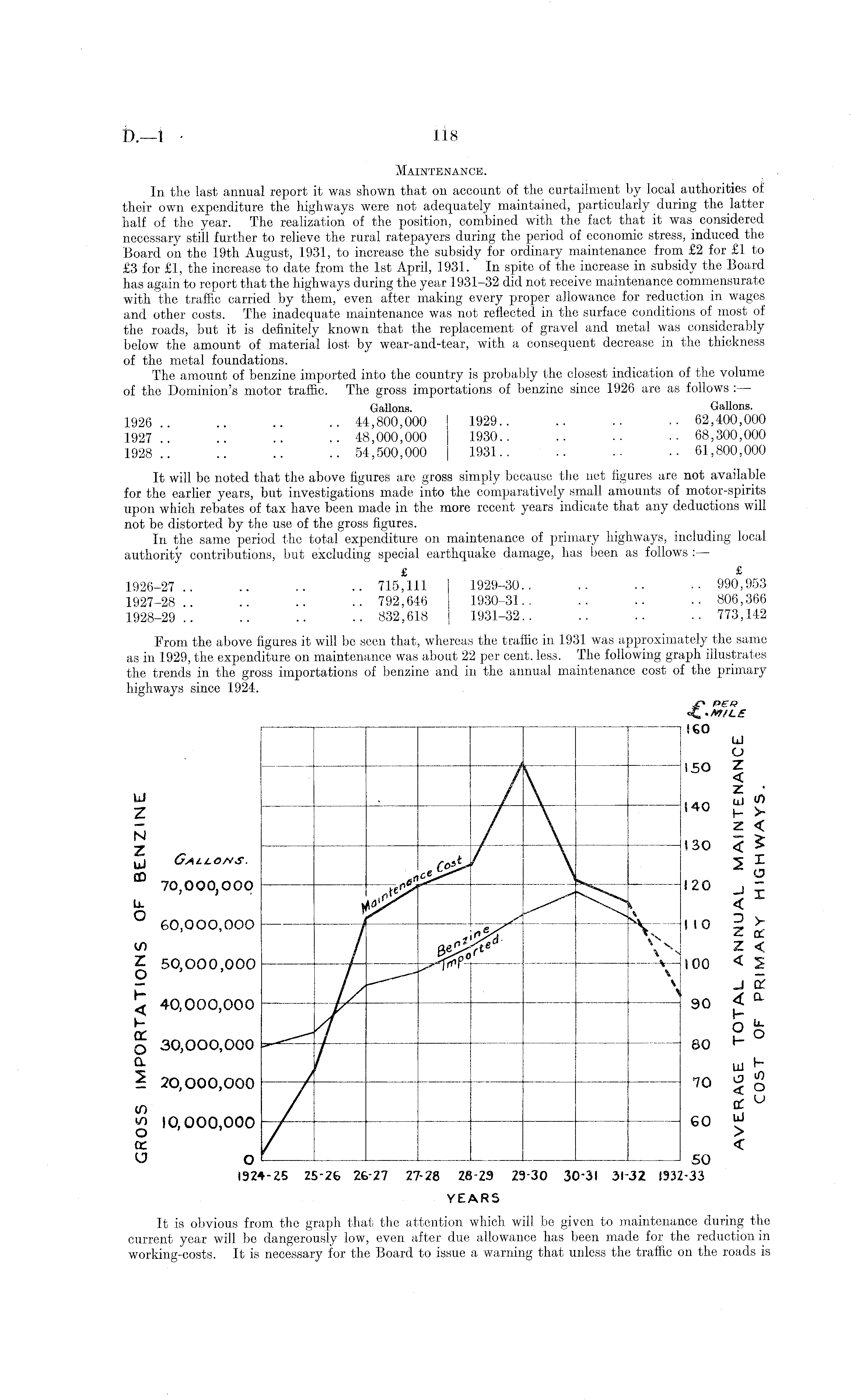 It is obvious from the graph that the attention which will be given to maintenance during the current year will be dangerously low, even after due allowance has been made for the reduction in working-costs. It is necessary for the Board to issue a warning that unless the traffic on the roads is