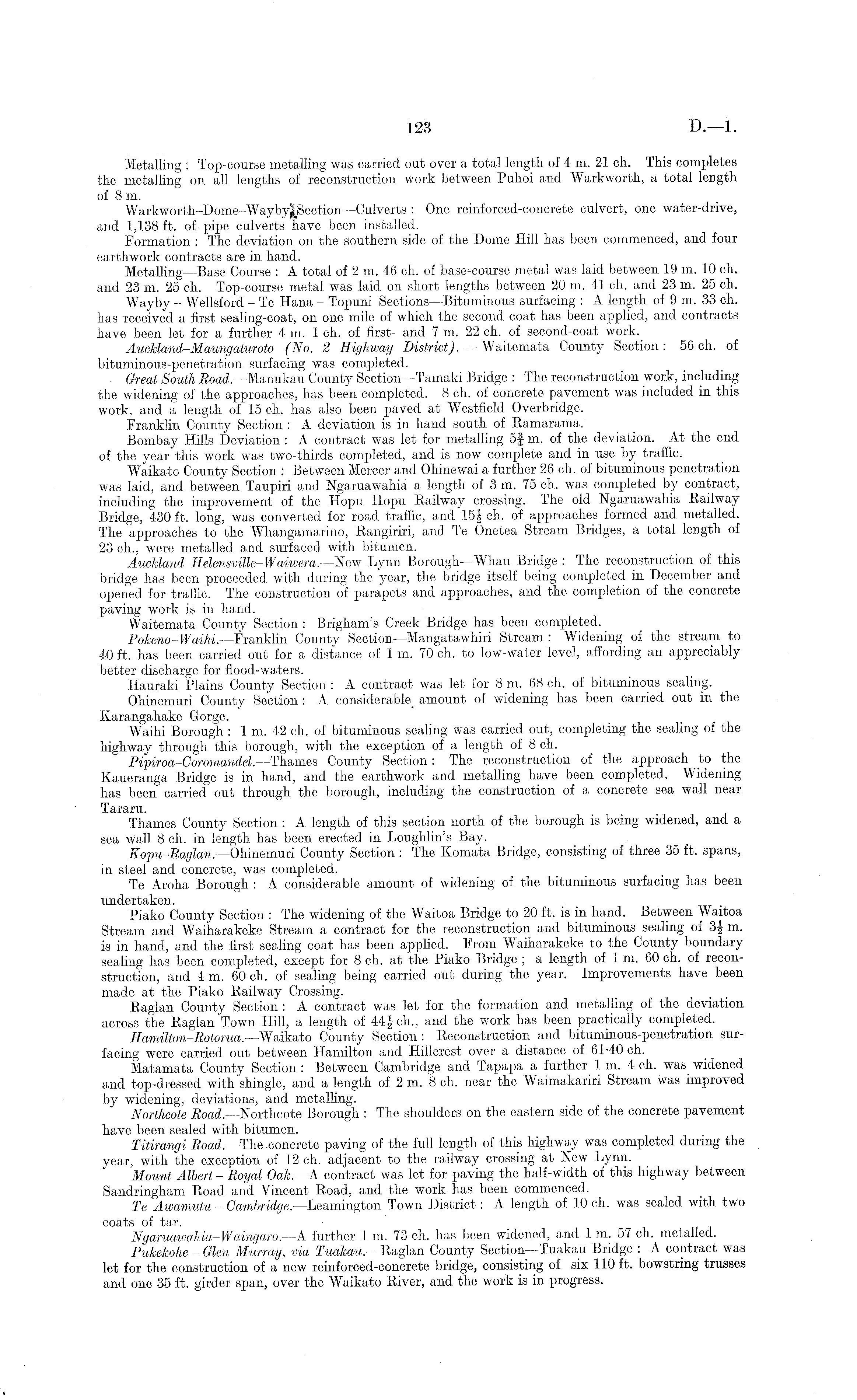 Metalling : Top-course metalling was carried out over a total length of 4m. 21 ch. This completes the metalling on all lengths of reconstruction work between Puhoi and Warkworth, a total length of 8 m. Warkworth-Dome--Wayby|Section —Culverts : One reinforced-concrete culvert, one water-drive, and 1,138 ft. of pipe culverts have been installed. Formation : The deviation on the southern side of the Dome Hill has been commenced, and four earthwork contracts are in hand. Metalling —Base Course : A total of 2 m, 46 ch. of base-course metal was laid between 19 m. 10 ch. and 23 m. 25 ch. Top-course metal was laid on short lengths between 20 m. 41 ch. and 23 m. 25 ch. Wayby - Wellsford -Te Hana - Topuni Sections—Bituminous surfacing : A length of 9m. 33 ch. has received a first sealing-coat, on one mile of which the second coat has been applied, and contracts have been let for a further 4 m. 1 ch. of first- and 7 m. 22 ch. of second-coat work. Auckland-Maungaturoto (No. 2 Highway District). — Waitemata County Section: 56 ch. of bituminous-penetration surfacing was completed. Great. South Road.—Manukau County Section—Tamaki Bridge : The reconstruction work, including the widening of the approaches, has been completed. 8 ch. of concrete pavement was included in this work, and a length of 15 ch. has also been paved at Westfield Overbridge. Franklin County Section : A deviation is in hand south of Ramarama. Bombay Hills Deviation : A contract was let for metalling 5§ m. of the deviation. At the end of the year this work was two-thirds completed, and is now complete and in use by traffic. Waikato County Section : Between Mercer and Ohinewai a further 26 ch. of bituminous penetration was laid, and between Taupiri and Ngaruawahia a length of 3 m. 75 ch. was completed by contract, including the improvement of the Hopu Hopu Railway crossing. The old Ngaruawahia Railway Bridge, 430 ft. long, was converted for road traffic, and ch. of approaches formed and metalled. The approaches to the Wliangamarino, Rangiriri, and Te Onetea Stream Bridges, a total length of 23 cli., were metalled and surfaced with bitumen. AucMand-Helensville-Waiwera. —New Lynn Borough —Whau Bridge : The reconstruction of this bridge has been proceeded with during the year, the bridge itself being completed in December and opened for traffic. The construction of parapets and approaches, and the completion of the concrete paving work is in hand. Waitemata County Section : Brigham's Creek Bridge has been completed. Pokeno-Waihi. —Franklin County Section —Mangatawhiri Stream : Widening of the stream to 40 ft. has been carried out for a distance of 1 m. 70 ch. to low-water level, affording an appreciably better discharge for flood-waters. Hauraki Plains County Section : A contract was let for Bm. 68 oh. of bituminous sealing. Ohinemuri County Section : A amount of widening has been carried out in the Karangahake Gorge. Waihi Borough : Im. 42 ch. of bituminous sealing was carried out, completing the sealing of the highway through this borough, with the exception of a length of 8 ch. Pipiroa-Coromandel. —Thames County Section : The reconstruction of the approach to the Kaueranga Bridge is in hand, and the earthwork and metalling have been completed. Widening has been carried out through the borough, including the construction of a concrete sea wall near Tararu. Thames County Section : A length of this section north of the borough is being widened, and a sea wall 8 ch. in length has been erected in Loughlin's Bay. Kopu-Raglan. —Ohinemuri County Section : The Komata Bridge, consisting of three 35 ft. spans, in steel and concrete, was completed. Te Aroha Borough : A considerable amount of widening of the bituminous surfacing has been undertaken. Piako County Section : The widening of the Waitoa Bridge to 20 ft. is in hand. Between Waitoa Stream and Waiharakeke Stream a contract for the reconstruction and bituminous sealing of 3| m. is in hand, and the first sealing coat has been applied. From Waiharakeke to the County boundary sealing has been completed, except for 8 ch. at the Piako Bridge ; a length of Im. 60 ch. of reconstruction, and 4m. 60 ch. of sealing being carried out during the year. Improvements have been made at the Piako Railway Crossing. Raglan County Section : A contract was let for the formation and metalling of the deviation across the Raglan Town Hill, a length of 44J ch., and the work has been practically completed. Hamilton-Rotorua. —Waikato County Section : Reconstruction and bituminous-penetration surfacing were carried out between Hamilton and Hillcrest over a distance of 61-40 ch. Matamata County Section : Between Cambridge and Tapapa a further Im. 4 ch. was widened and top-dressed with shingle, and a length of 2 m. 8 ch. near the Waimakariri Stream was improved by widening, deviations, and metalling. Northcote Road. —Northcote Borough : The shoulders on the eastern side of the concrete pavement have been sealed with bitumen. Titirangi Road. —The.concrete paving of the full length of this highway was completed during the vear, with the exception of 12 ch. adjacent to the railway crossing at New Lynn. Mount Albert - Royal Oak. —A contract was let for paving the half-width of this highway between Sandringham Road and Vincent Road, and the work has been commenced. Te Awamutu - Cambridge. —Leamington Town District: A length of 10 ch. was sealed with two coats of tar. Ngaruaivahia-Waingaro. —A further Im. 73 ch. has been widened, and Im. 57 ch. metalled. Pukekohe - Glen Murray, via Tuakau. —Raglan County Section —Tuakau Bridge : A contract was let for the construction of a new reinforced-concrete bridge, consisting of six 110 ft. bowstring trusses and one 35 ft. girder span, over the Waikato River, and the work is in progress. I