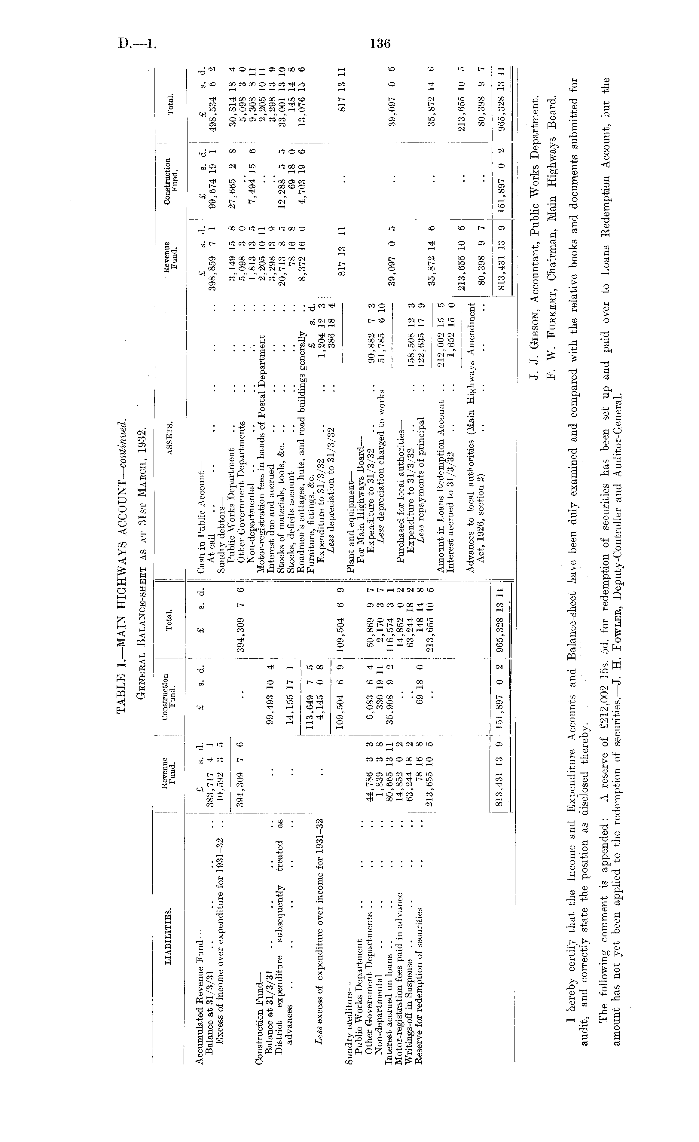 J. J. Gibson, Accountant, Public Works Department. F. W. Furkebt, Chairman, Main Highways Board. I hereby certify that the Income and Expenditure Accounts and Balance-sheet have been duly examined and compared with the relative books and documents submitted for audit, and correctly state the position as disclosed thereby. The following comment is appended : A reserve of £212,002 15s. sd. for redemption of securities has been set up and paid over to Loans Redemption Account, but the amount has not yet been applied to the redemption of securities.— J. H, Fowler, Deputy-Controller and Auditor-General.