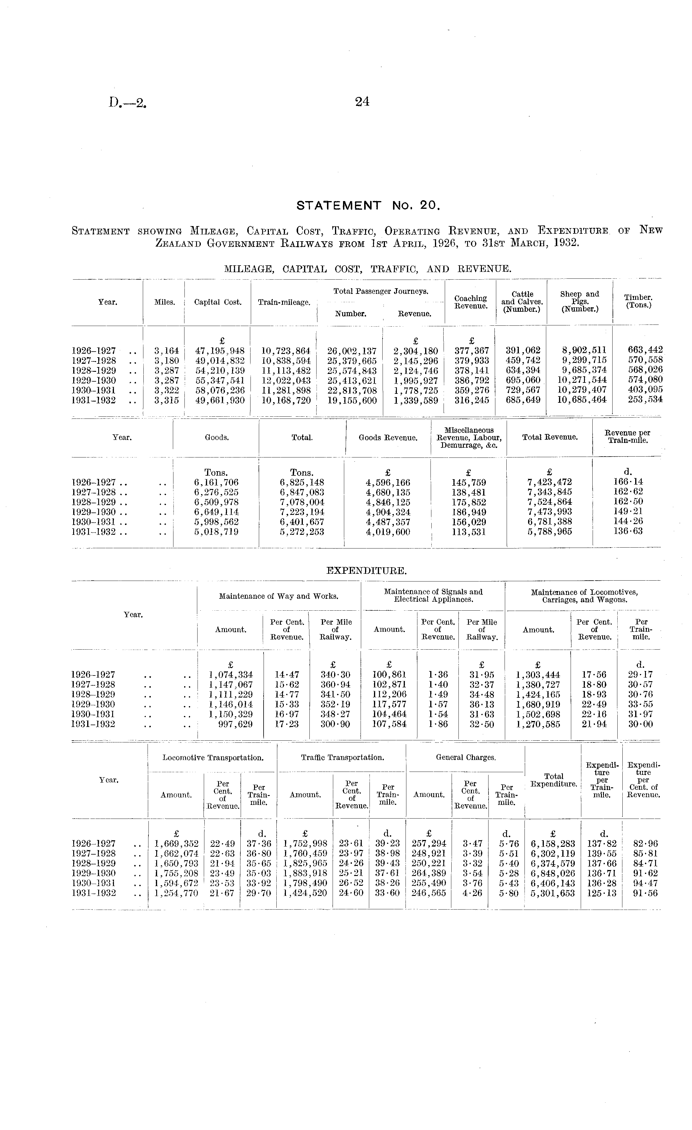 STATEMENT No. 20. Statement showing Mileage, Capital Cost, Traffic, Operating Revenue, and Expenditure, of New Zealand Government Railways from 1st April, 1926, to 31st March, 1932. MILEAGE, CAPITAL COST, TRAFFIC, AND REVENUE.