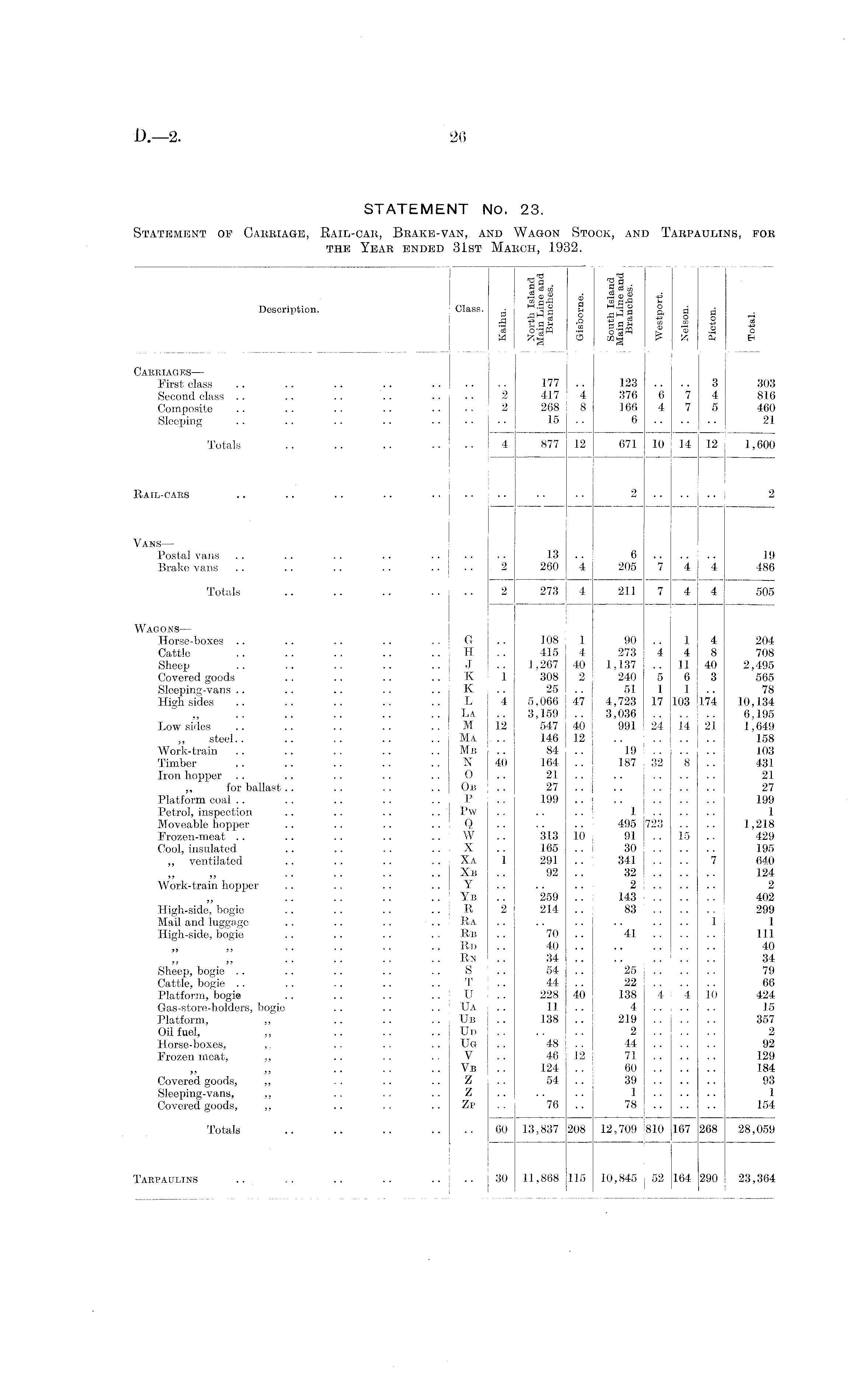STATEMENT No. 23. Statement of Carriage, Rail-car, Brake-van, and Wagon Stock, and Tarpaulins, for the Year ended 31st March, 1932.