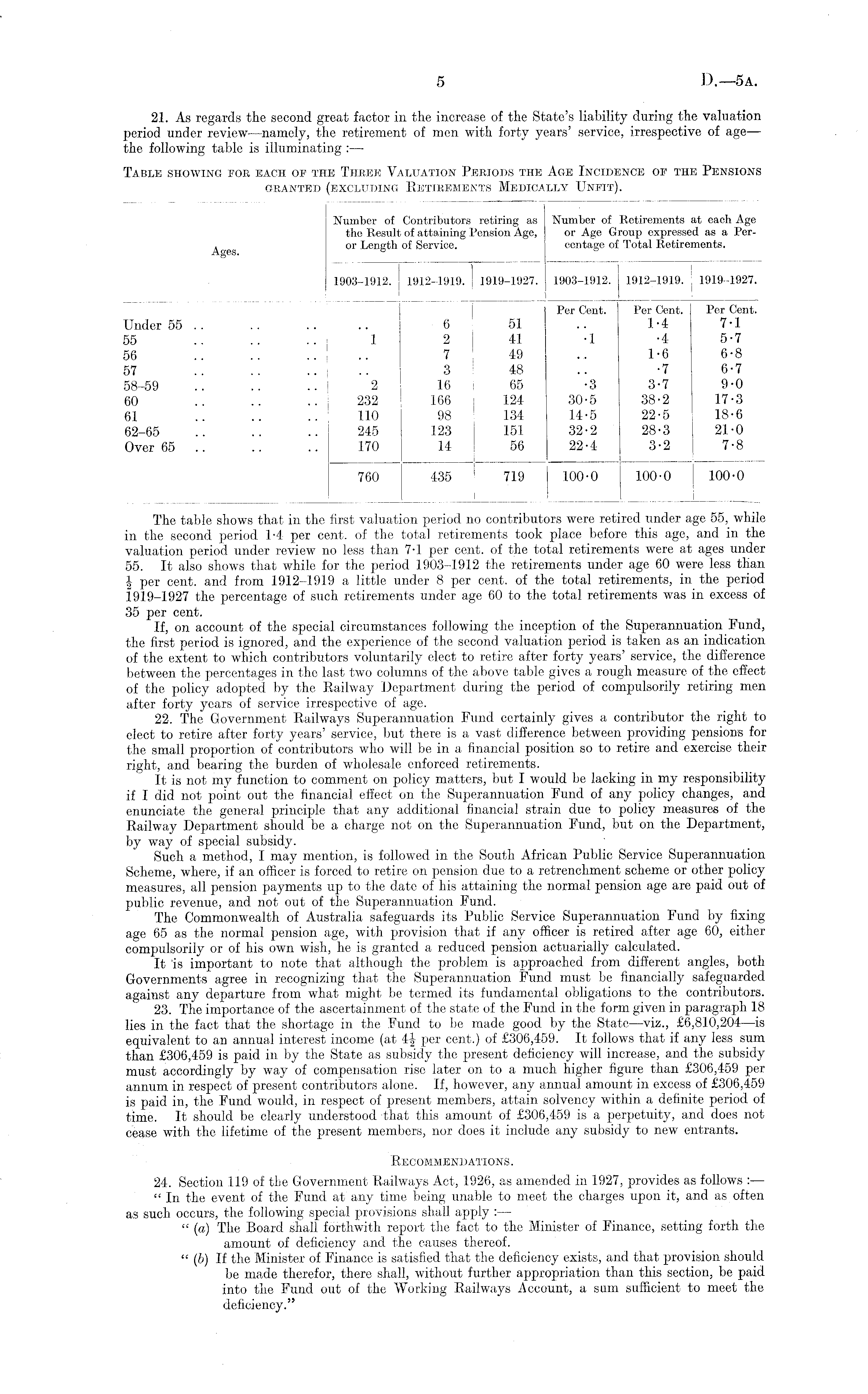 The table shows that in the first valuation period no contributors were retired under age 55, while in the second period 1-4 per cent, of the total retirements took place before this age, and in the valuation period under review no less than 7-1 per cent, of the total retirements were at ages under 55. It also shows that while for the period 1903-1912 the retirements under age 60 were less than \ per cent, and from 1912-1919 a little under 8 per cent, of the total retirements, in the period 1919-1927 the percentage of such retirements under age 60 to the total retirements was in excess of 35 per cent. If, on account of the special circumstances following the inception of the Superannuation Fund, the first period is ignored, and the experience of the second valuation period is taken as an indication of the extent to which contributors voluntarily elect to retire after forty years' service, the difference between the percentages in the last two columns of the above table gives a rough measure of the effect of the policy adopted by the Railway Department during the period of compulsorily retiring men after forty years of service irrespective of age. 22. The Government Railways Superannuation Fund certainly gives a contributor the right to elect to retire after forty years' service, but there is a vast difference between providing pensions for the small proportion of contributors who will be in a financial position so to retire and exercise their right, and bearing the burden of wholesale enforced retirements. It is not my function to comment on policy matters, but I would be lacking in my responsibility if I did not point out the financial effect on the Superannuation Fund of any policy changes, and enunciate the general principle that any additional financial strain due to policy measures of the Railway Department should be a charge not on the Superannuation Fund, but on the Department, by way of special subsidy. Such a method, I may mention, is followed in the South African Public Service Superannuation Scheme, where, if an officer is forced to retire on pension due to a retrenchment scheme or other policy measures, all pension payments up to the date of his attaining the normal pension age are paid out of public revenue, and not out of the Superannuation Fund. The Commonwealth of Australia safeguards its Public Service Superannuation Fund by fixing age 65 as the normal pension age, with provision that if any officer is retired after age 60, either compulsorily or of his own wish, he is granted a reduced pension actuarially calculated. It 'is important to note that although the problem is approached from different angles, both Governments agree in recognizing that the Superannuation Fund must be financially safeguarded against any departure from what might be termed, its fundamental obligations to the contributors. 23. The importance of the ascertainment of the state of the Fund in the form given in paragraph 18 lies in the fact that the shortage in the Fund to be made good by the State —viz., £6,810,204 —is equivalent to an annual interest income (at 4| per cent.) of £306,459. It follows that if any less sum than £306,459 is paid in by the State as subsidy the present deficiency will increase, and the subsidy must accordingly by way of compensation rise later on to a much higher figure than £306,459 per annum in respect of present contributors alone. If, however, any annual amount in excess of £306,459 is paid in, the Fund would, in respect of present members, attain solvency within a definite period of time. It should be clearly understood that this amount of £306,459 is a perpetuity, and does not cease with the lifetime of the present members, nor does it include any subsidy to new entrants. Recommendations. 24. Section 119 of the Government Railways Act, 1926, as amended in 1927, provides as follows : — " In the event of the Fund at any time being unable to meet the charges upon it, and as often as such occurs, the following special provisions shall apply :— " (a) The Board shall forthwith report the fact to the Minister of Finance, setting forth the amount of deficiency and the causes thereof. " (b) If the Minister of Finance is satisfied that the deficiency exists, and that provision should be made therefor, there shall, without further appropriation than this section, be paid into the Fund out of the Working Railways Account, a sum sufficient to meet the deficiency."