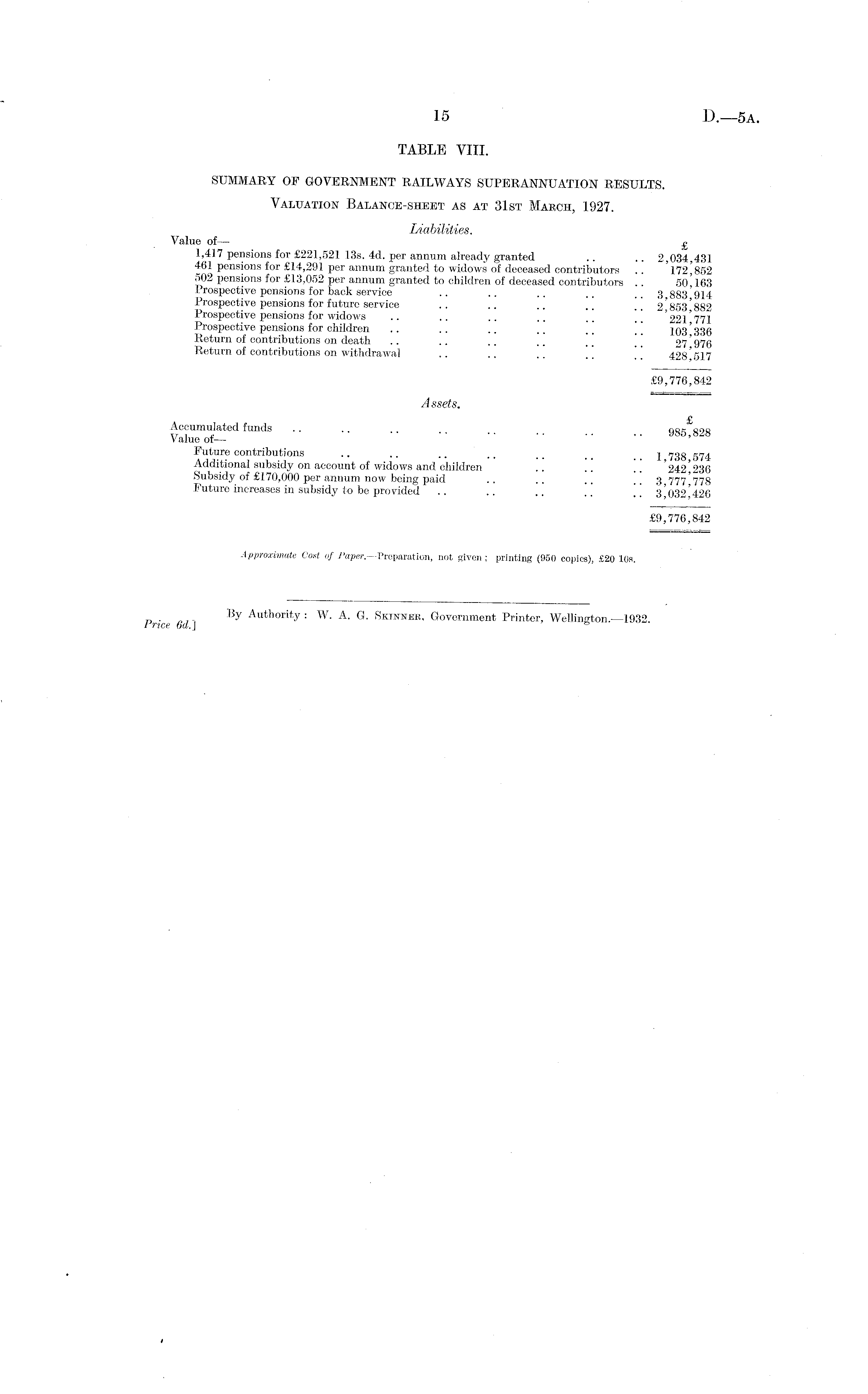 TABLE VIII. SUMMARY OF GOVERNMENT RAILWAYS SUPERANNUATION RESULTS. Valuation Balance-sheet as at 31st March, 1927. Liabilities. Value of—■ £ 1,417 pensions for £221,521 13s. 4d. per annum already granted .. .. 2,034,431 461 pensions for £14,291 per annum granted to widows of deceased contributors .. 172'852 502 pensions for £13,052 per annum granted to children of deceased contributors .. 50' 163 Prospective pensions for back service .. .. .. .. ..3 883'914 Prospective pensions for future service .. .. .. .. .. 2' 853' 882 Prospective pensions for widows .. .. .. .. 221 771 Prospective pensions for children .. .. .. .. [ \ " 103'336 Return of contributions on death .. .. .. .. . _ '' 27' 976 Return of contributions on withdrawal .. .. .. " 428'517 £9,776,842 Assets. £ Accumulated funds .. .. .. .. ggg gr,g Value of— '' '' ' Euture contributions .. .. .. .. . _ _ _ 2 g74 Additional subsidy on account of widows and children .. .. .. 242 236 Subsidy of £170,000 per annum now being paid .. .. .. ..3 777*778 I uture increases in subsidy to be provided .. .. .. ~ 3' 032' 42(3 £9,776,842